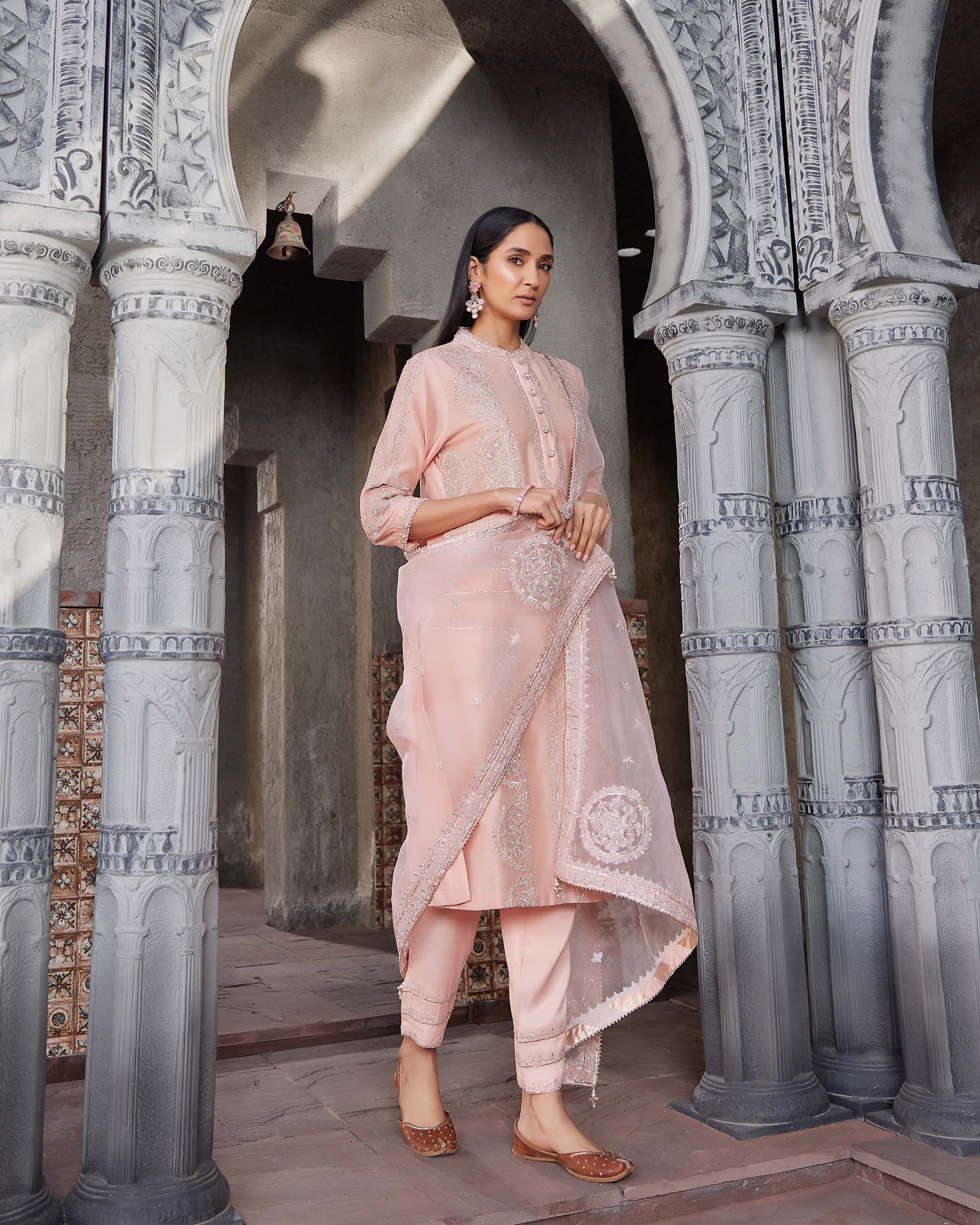 Featuring a peach straight kurta in silk chanderi fabric paired with matching straight pant in dupion and organza dupatta