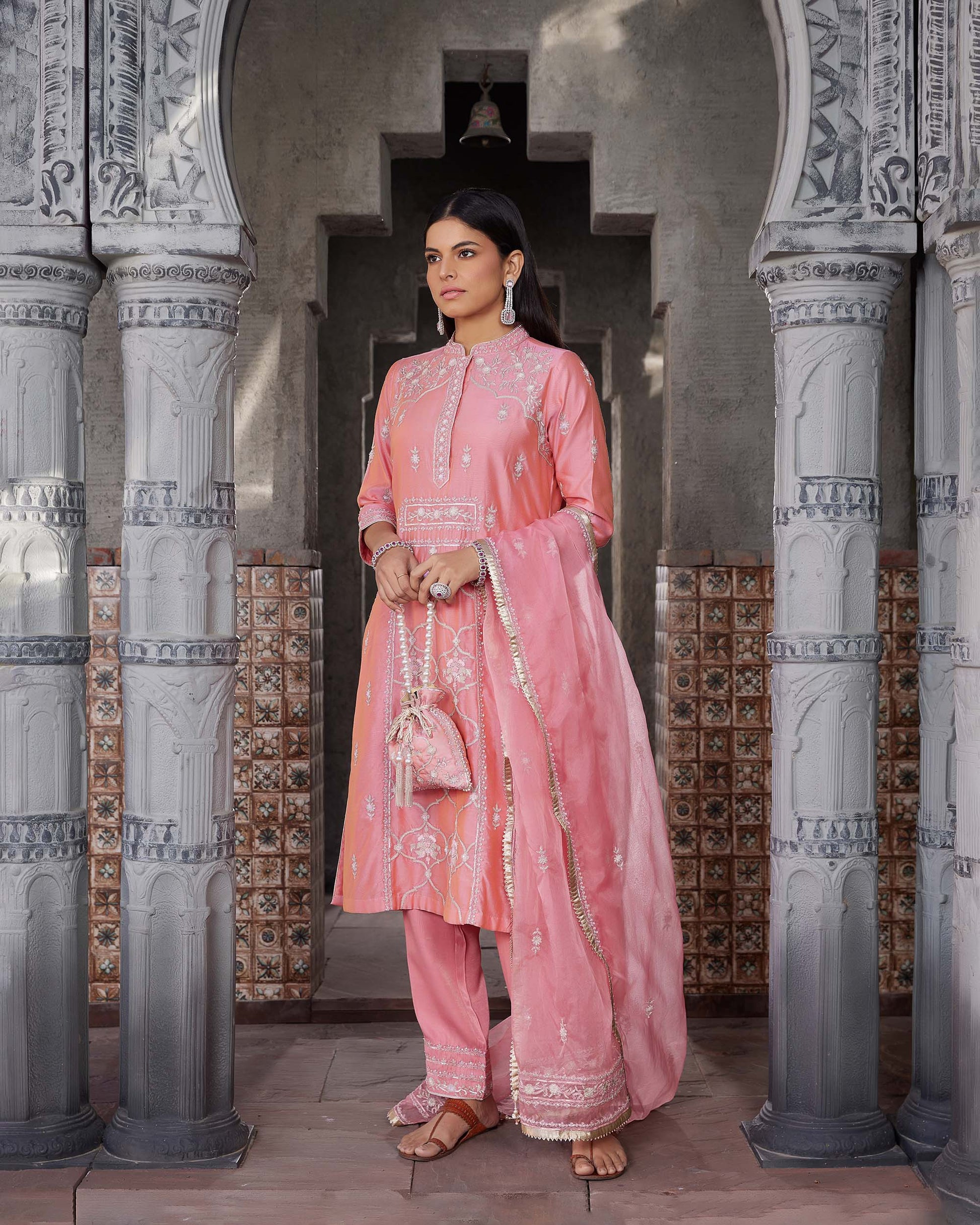 Featuring a pink straight kurta in silk chanderi fabric paired