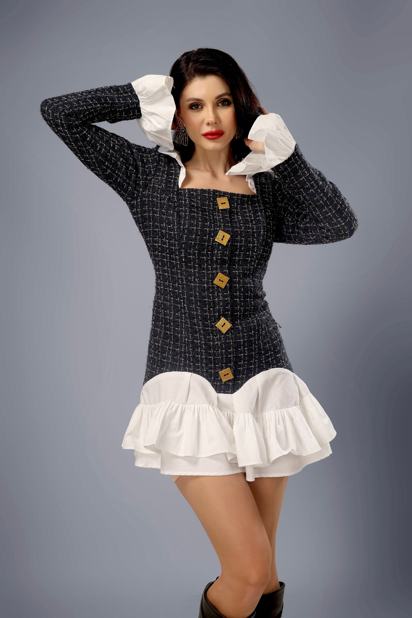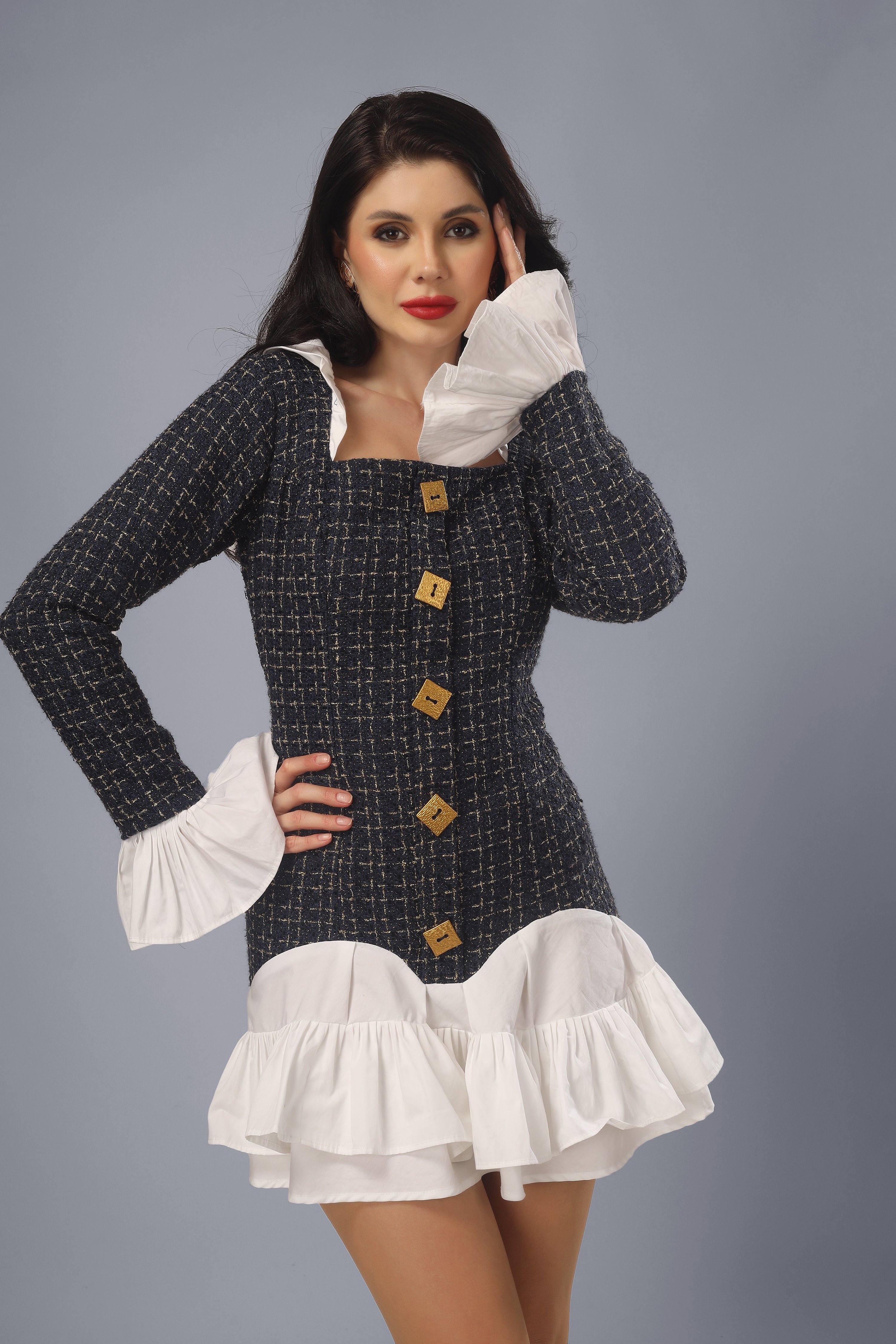 DETAILS- Fitted tweed dress with white frilled collar, sleeves and bottom. Square button detailing, non padded.