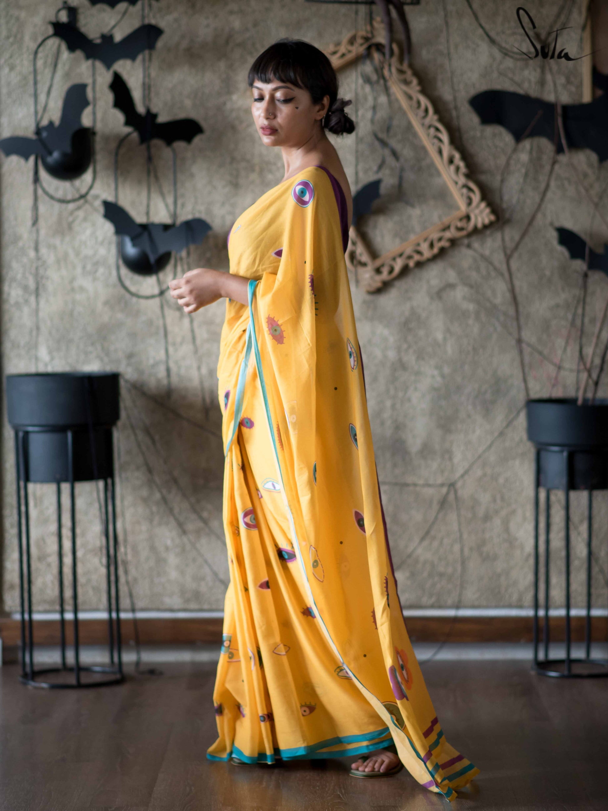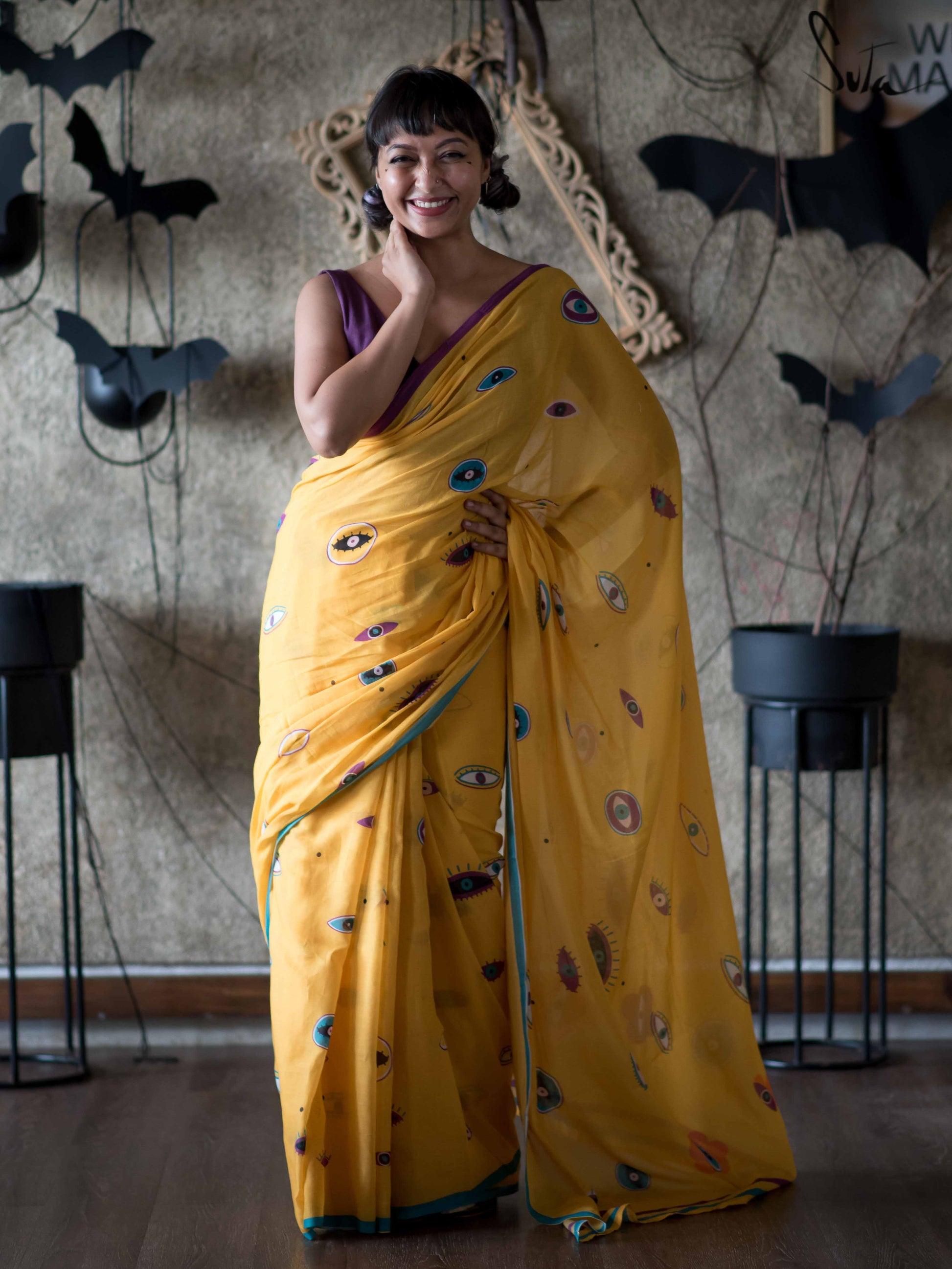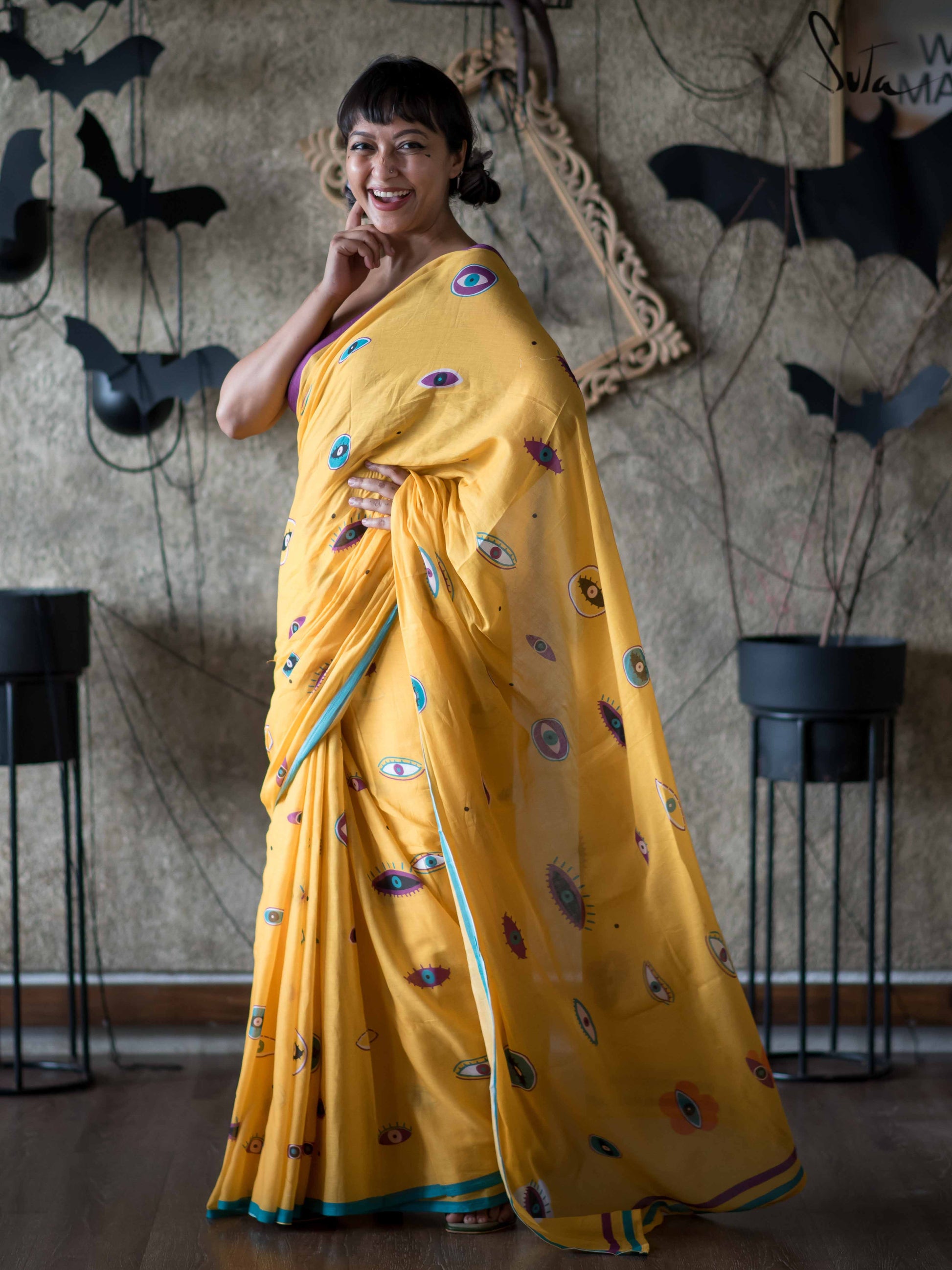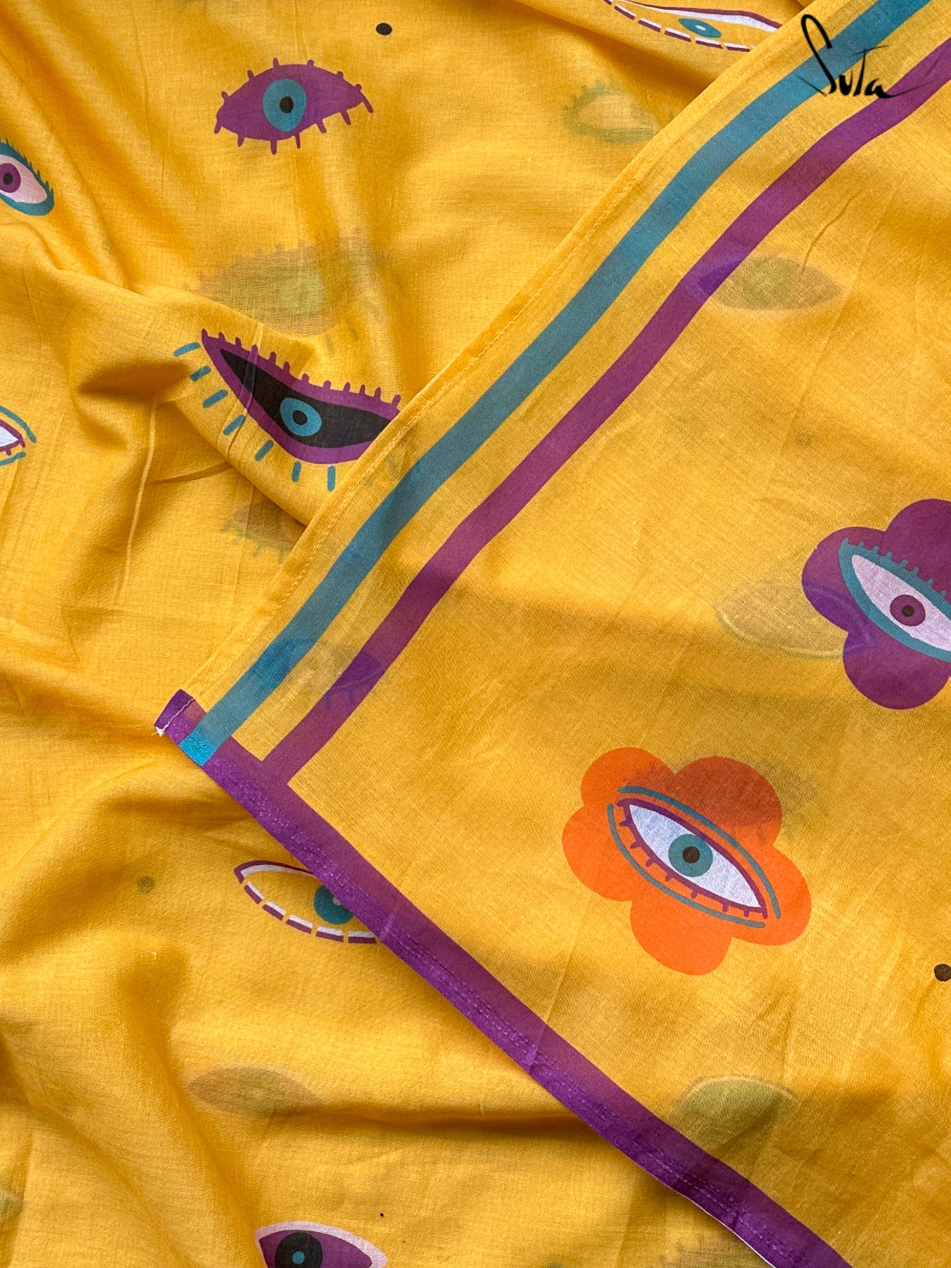 This yellow mul-mul cotton printed saree is literally an œall eyes on you drape that unapologetically makes a statement about owning who you are!