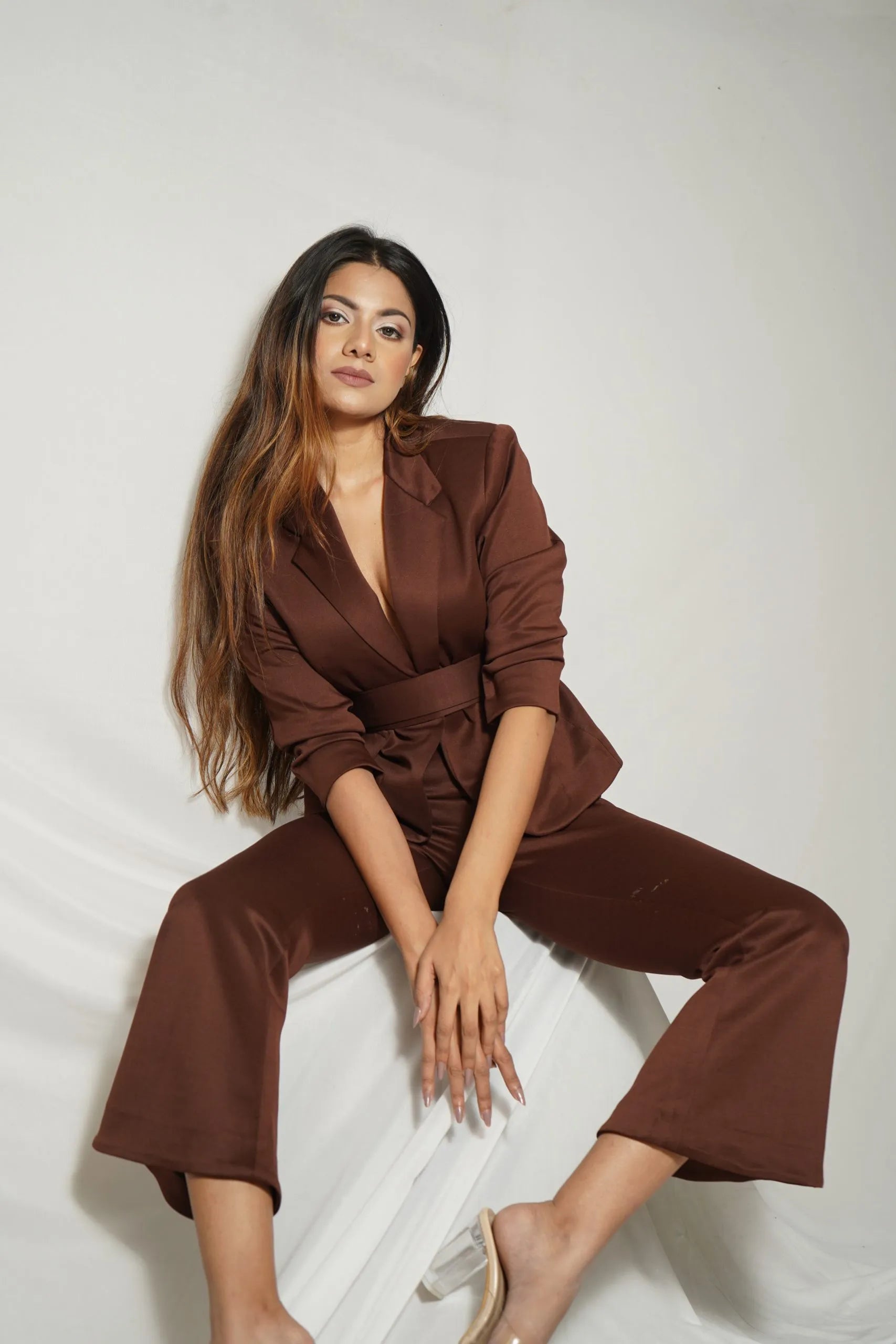 DETAIL- Brown blazer paired with matching wide leg pants and a belt.