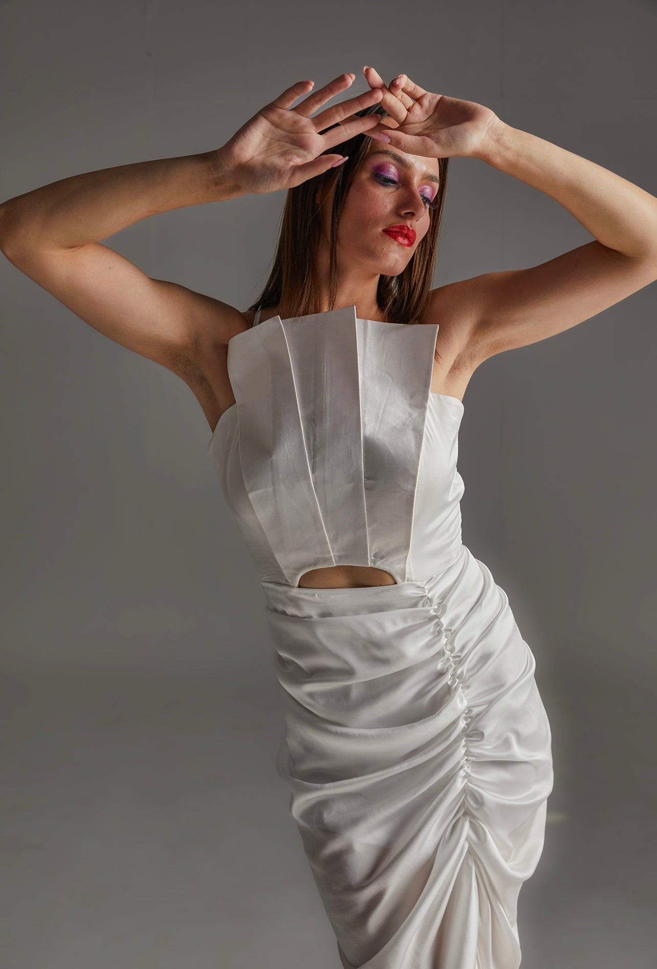 DETAIL- White satin long dress with a small keyhole at waist and gathered bottom featuring a high slit, strict drape at front, Padded and back zipper.