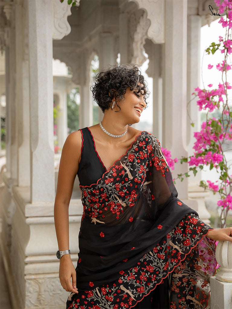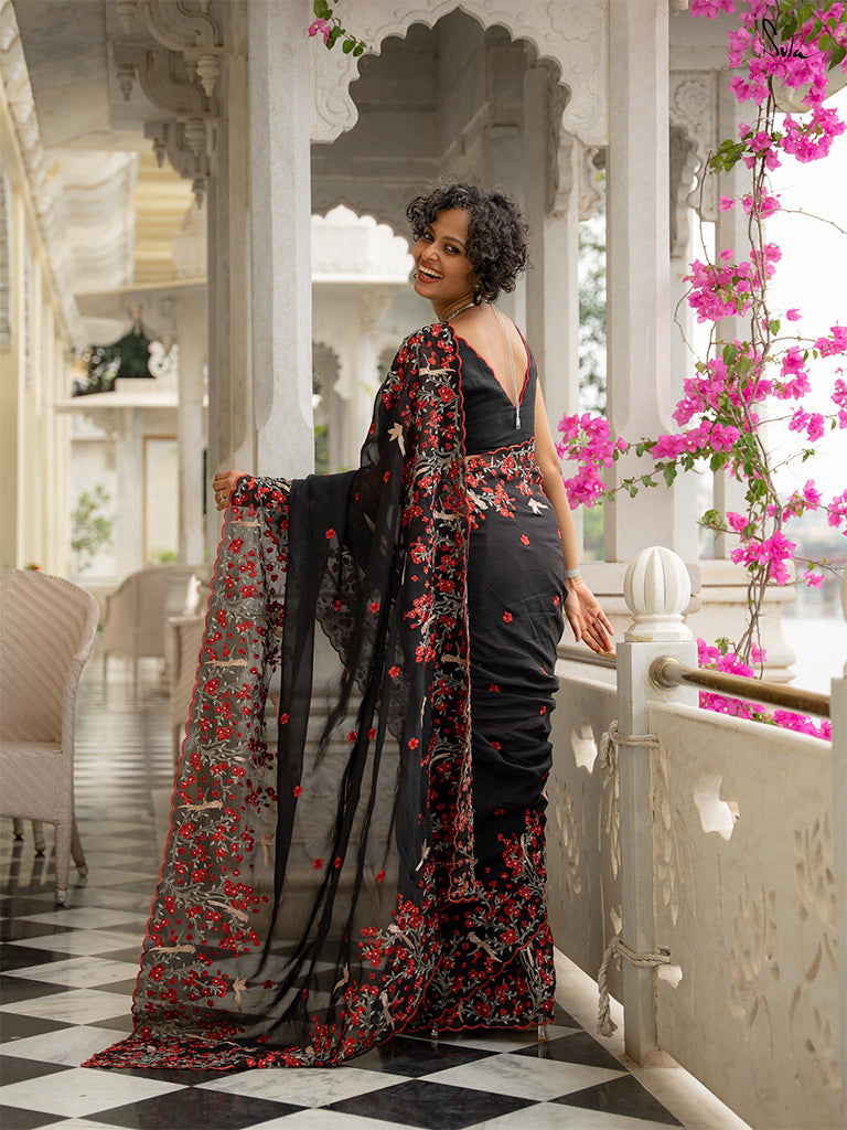 This black saree is crafted from viscose organza fabric with intricate embroidery, depicting soothing scenes of cherry blossom trees and birds. The tiny red flower buttis dancing all over the saree is the optimal final touch.