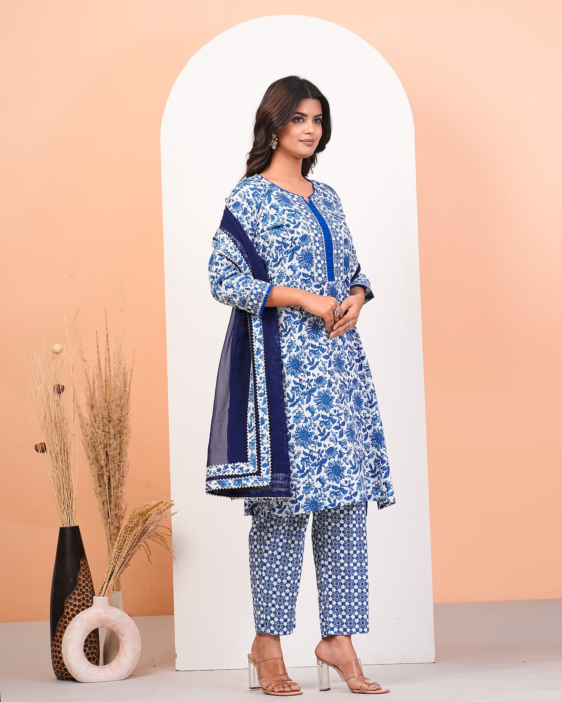 Floral Blue Katha Kurta Pant Dupatta Set With Lace Highlight