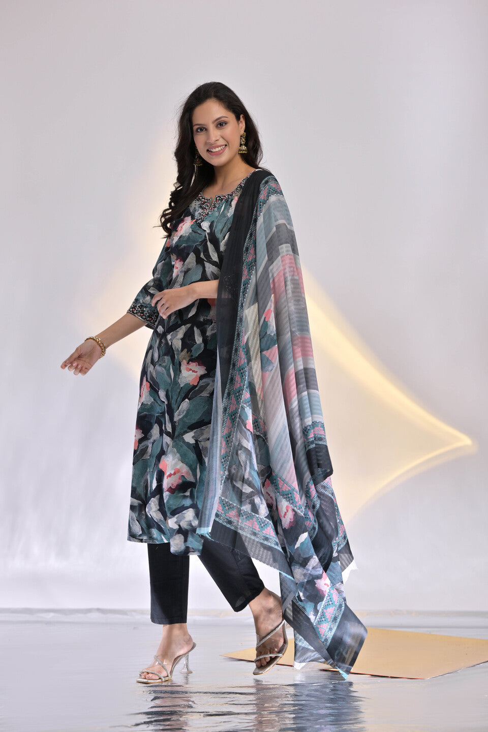 The vibrant floral print adds a touch of freshness to any occasion. Complete with a matching dupatta, this set is ideal for those who appreciate timeless beauty in their wardrobe.