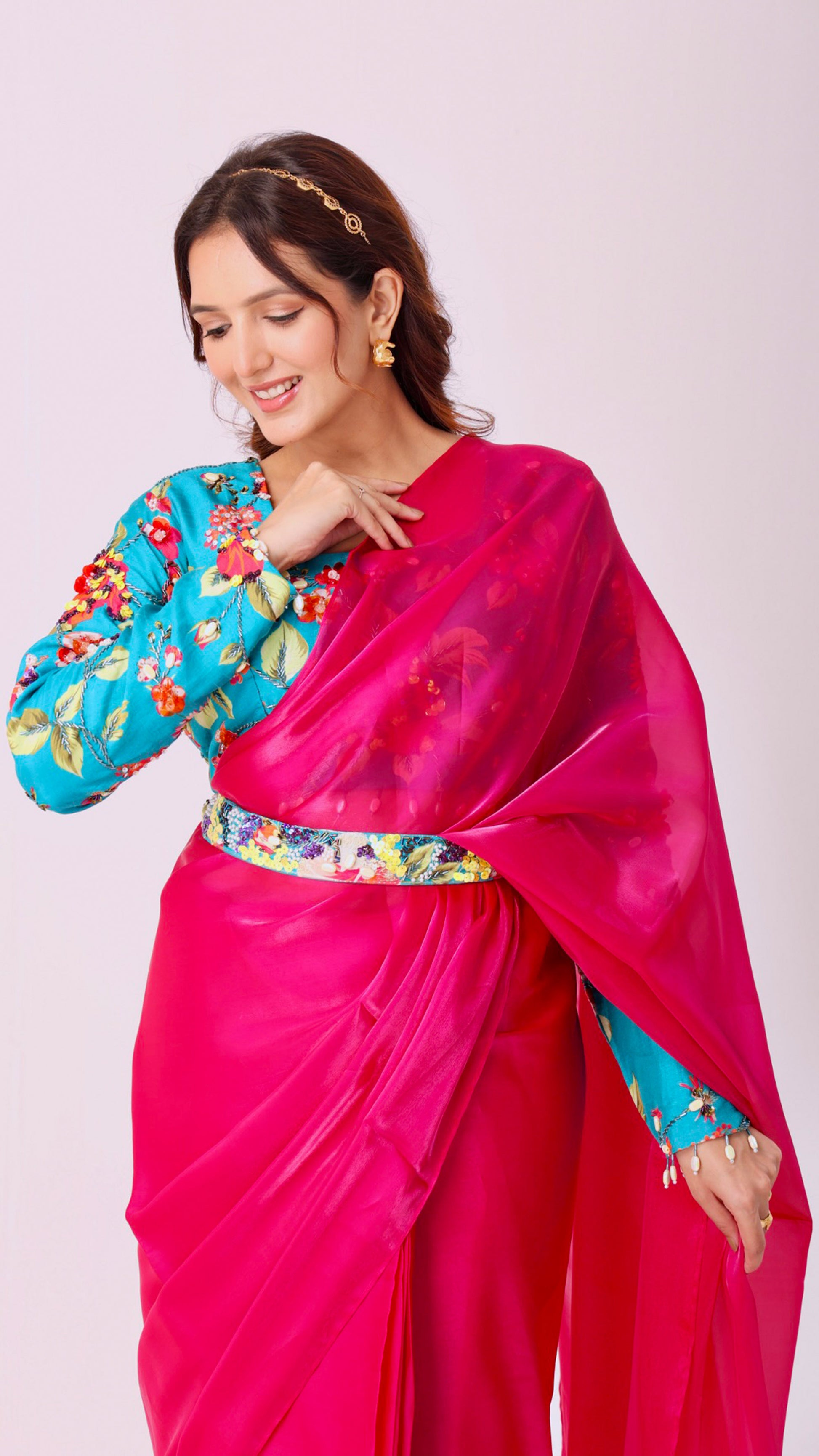 Fuchsia organza saree with floral hand-embroidered statement blouse and belt