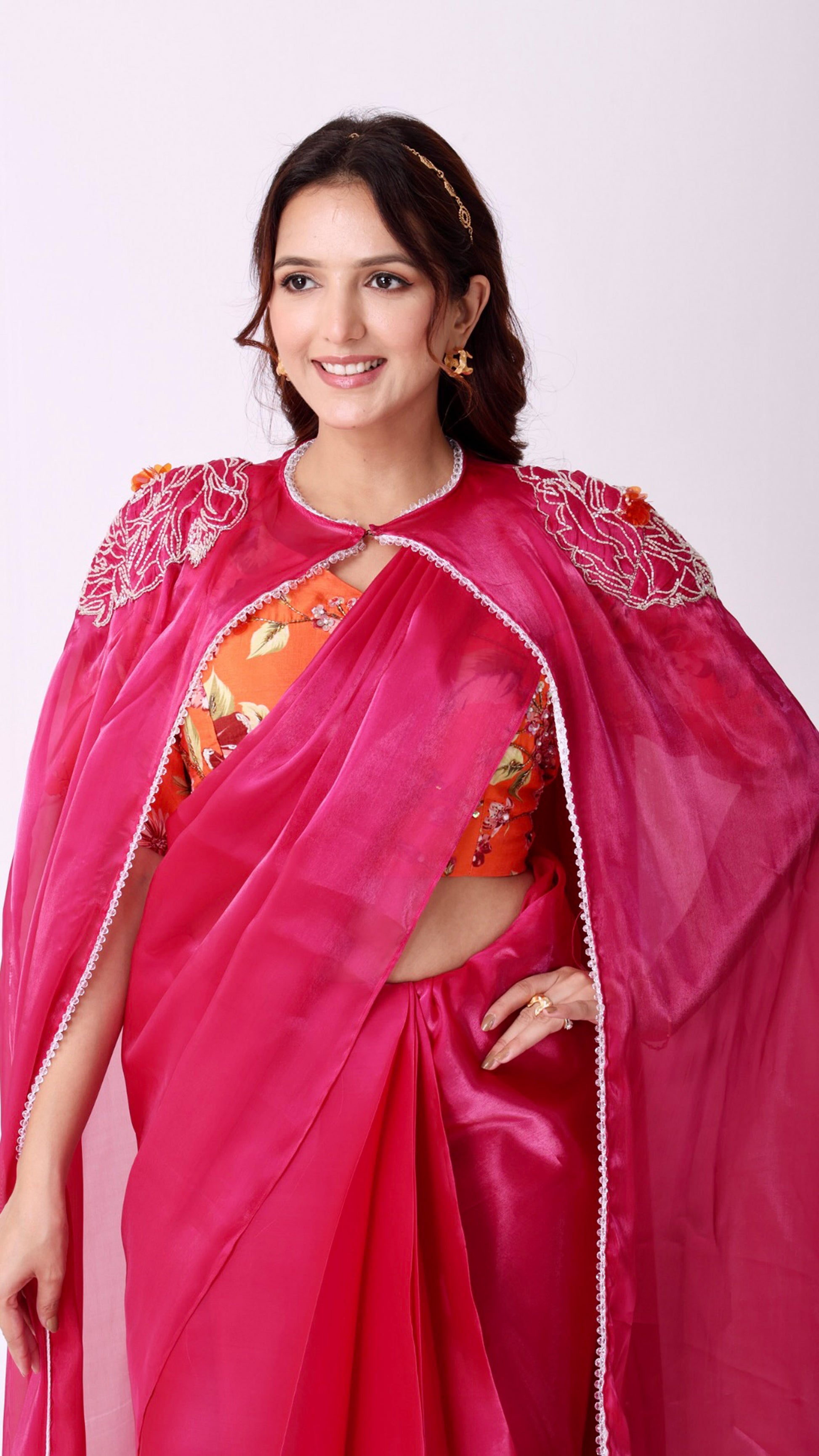 Fuchsia statement saree and embroidered cape with floral embellished blouse