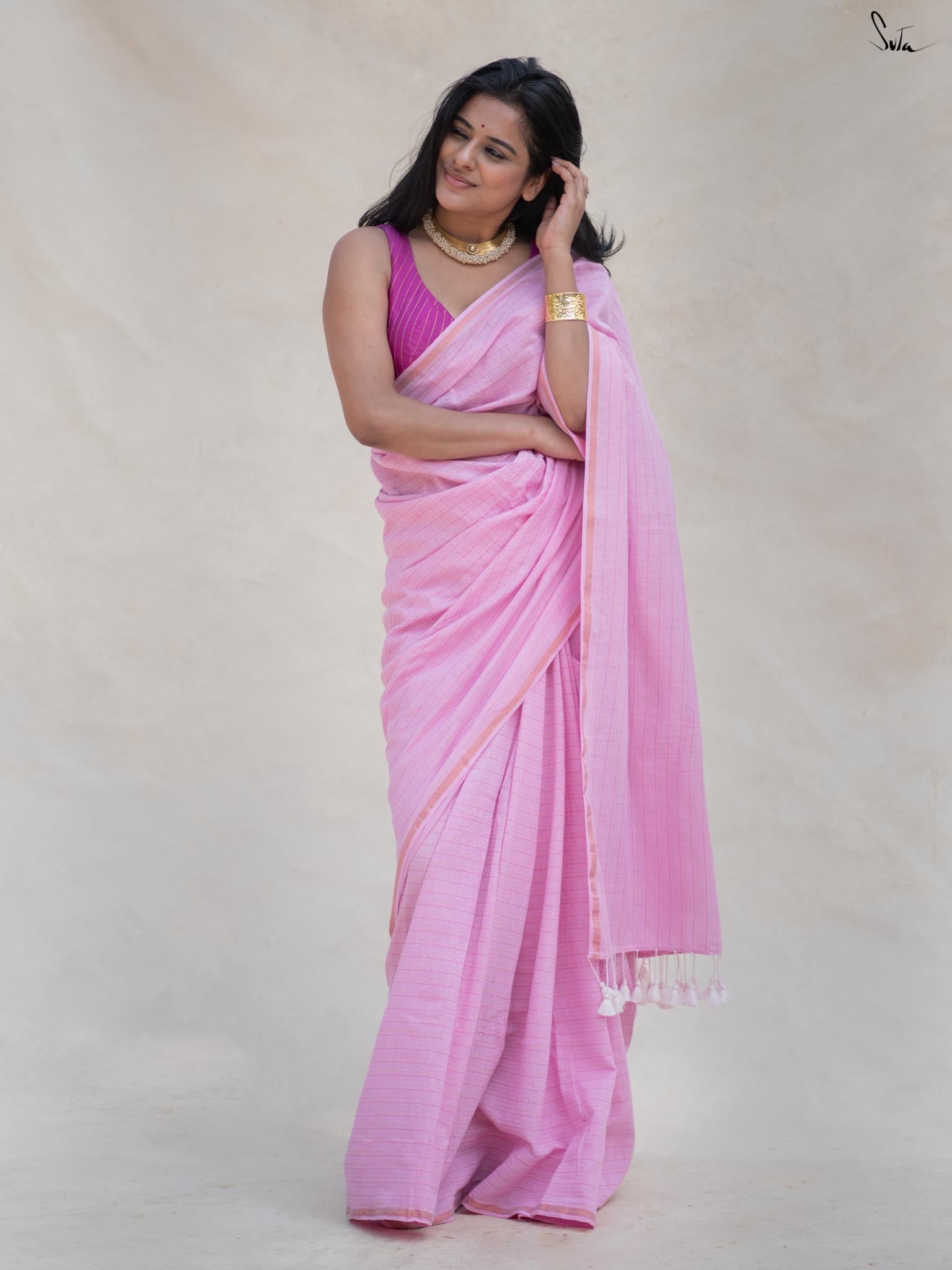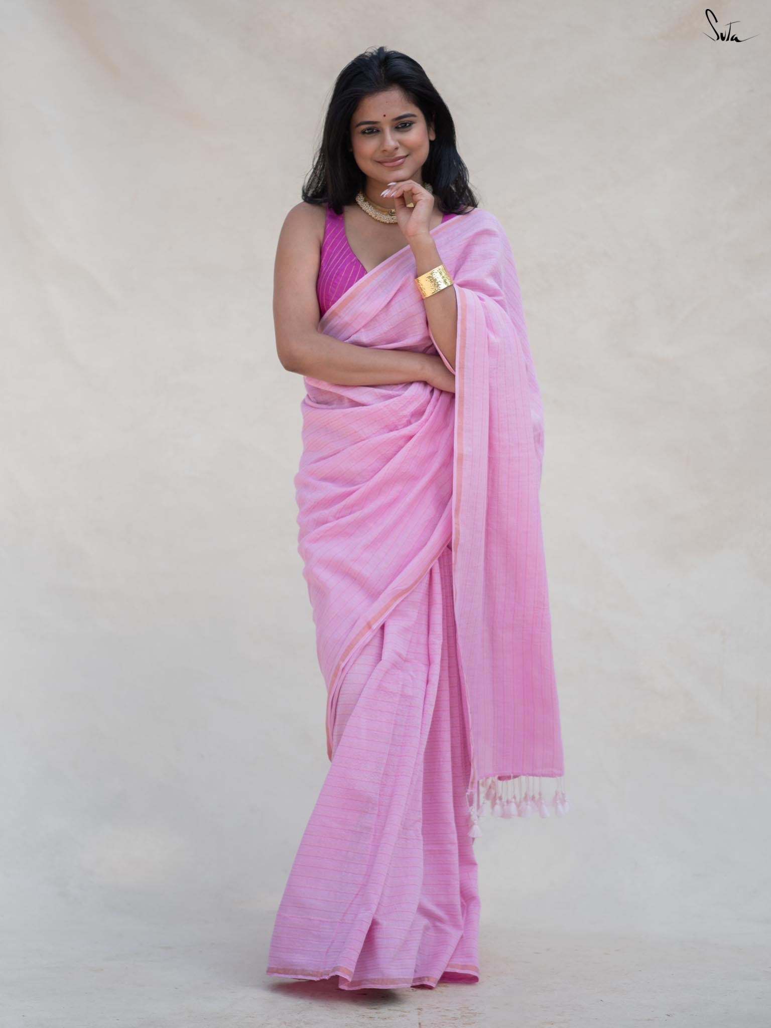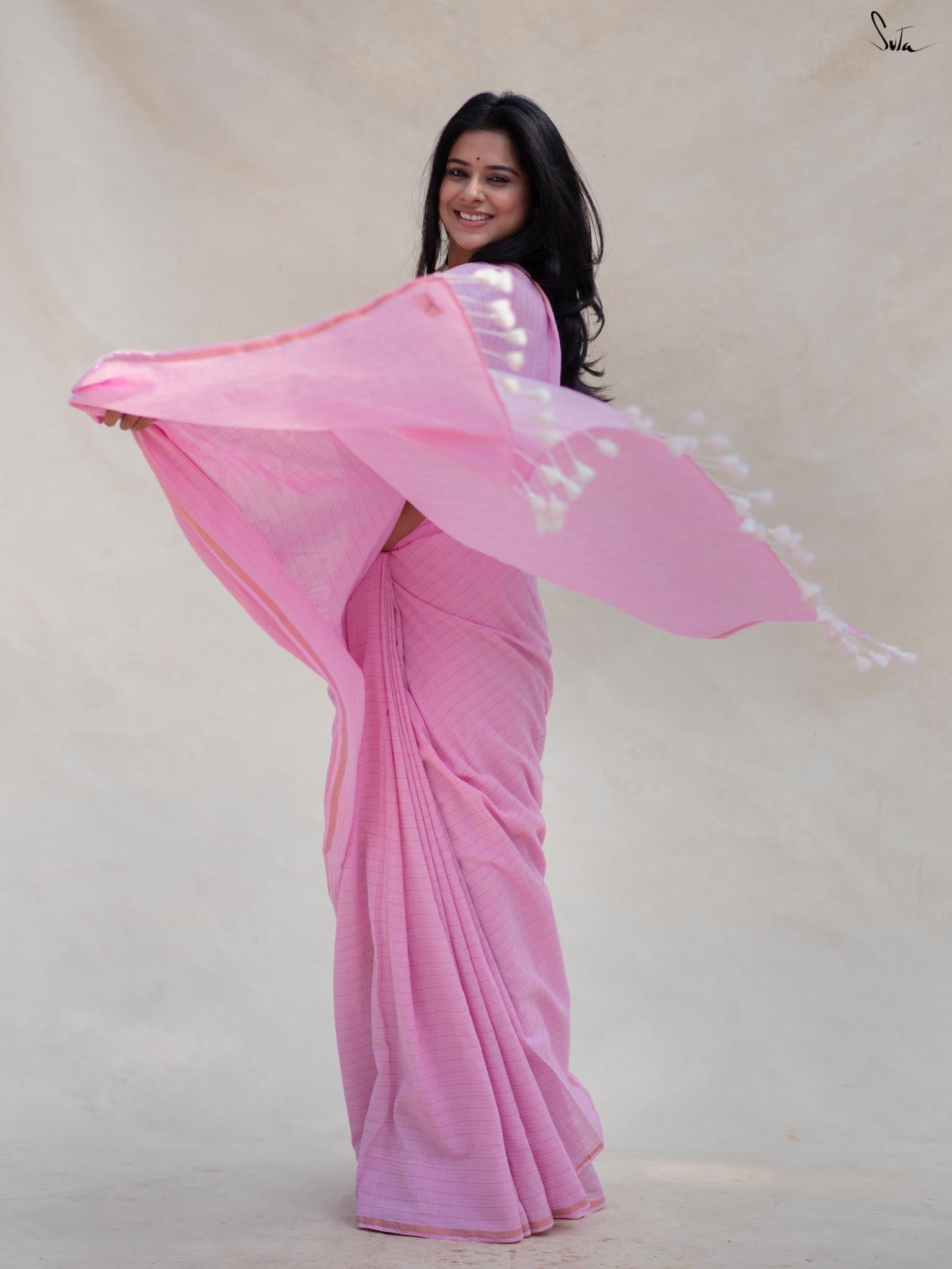 Galaxy Glamour, a stunning baby pink saree, crafted from soft, breathable cotton, celebrates playful romance with intricate zari stripes that turn it into a masterpiece. Whether it's a casual gathering or a special celebration, Galaxy Glamour ensures you feel confident and stylish all day long. A perfect blend of comfort and chic fashion, this saree is a must-have in your wardrobe for every occasion.
