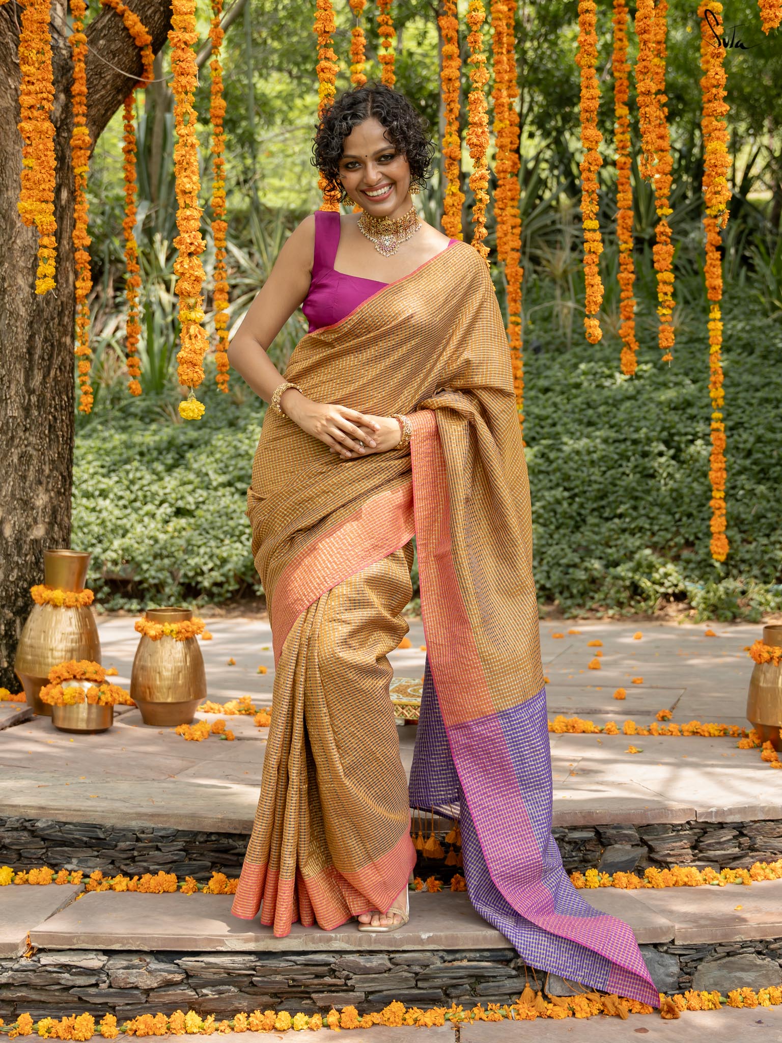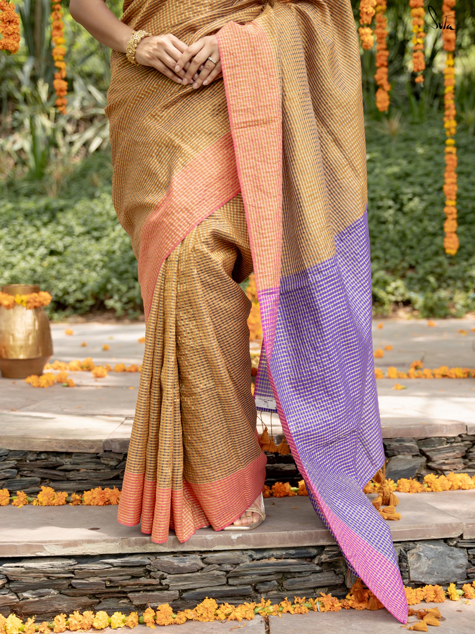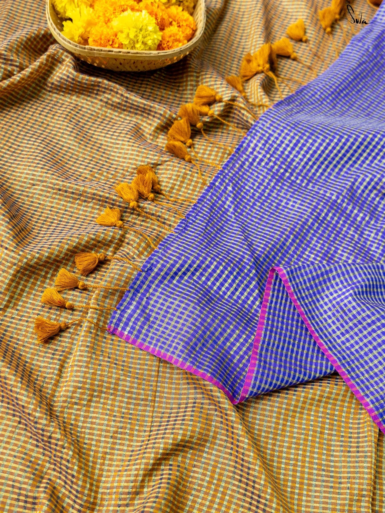 Crafted from rich cotton acrylic zari, this saree features a beige-colored base with contrasting border and pallu. It has zari lines running in both warp and weft throughout the saree, transforming it into a work of art. Pair this saree with Suta's 'Amaaya' blouse and explore the colorful magic in you!