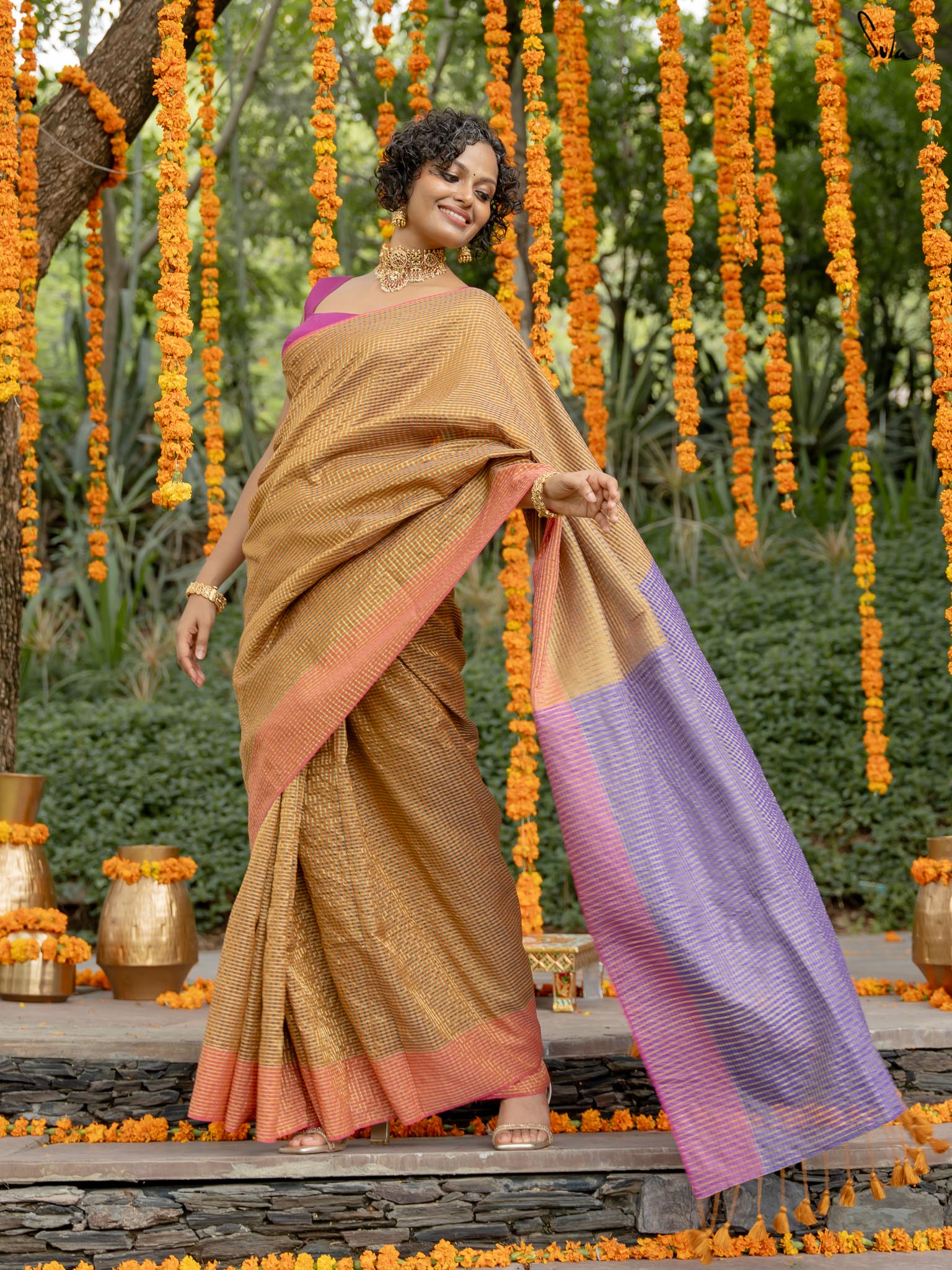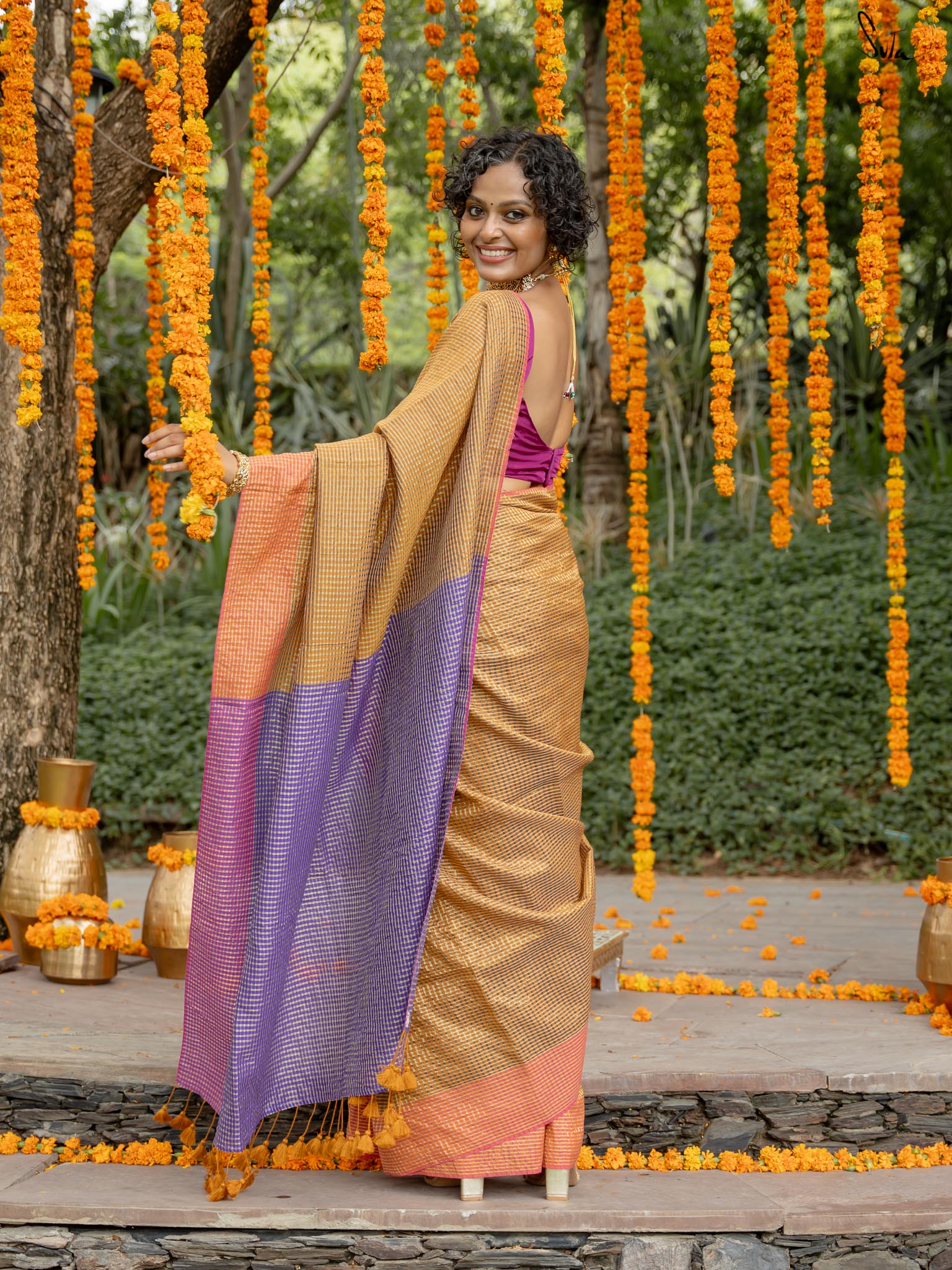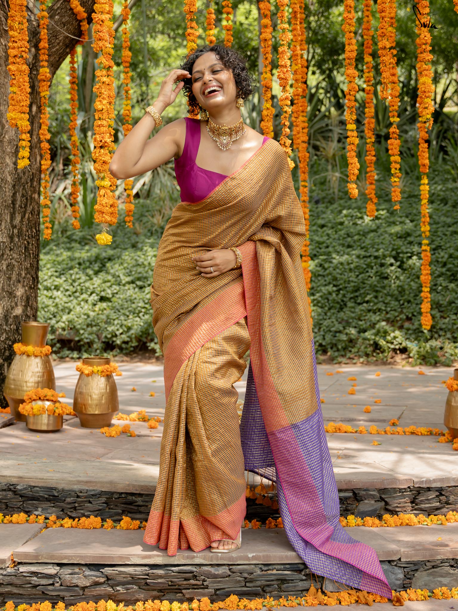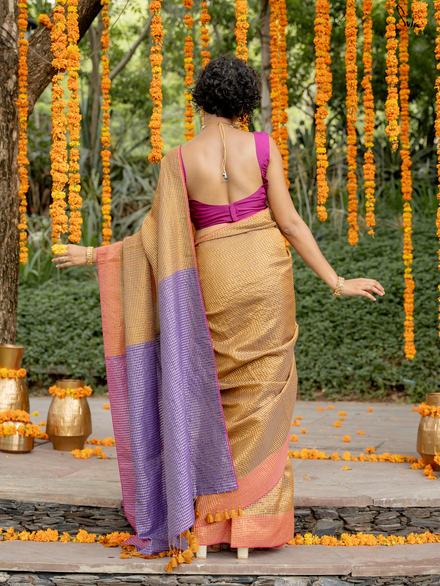 Crafted from rich cotton acrylic zari, this saree features a beige-colored base with contrasting border and pallu. It has zari lines running in both warp and weft throughout the saree, transforming it into a work of art. Pair this saree with Suta's 'Amaaya' blouse and explore the colorful magic in you!