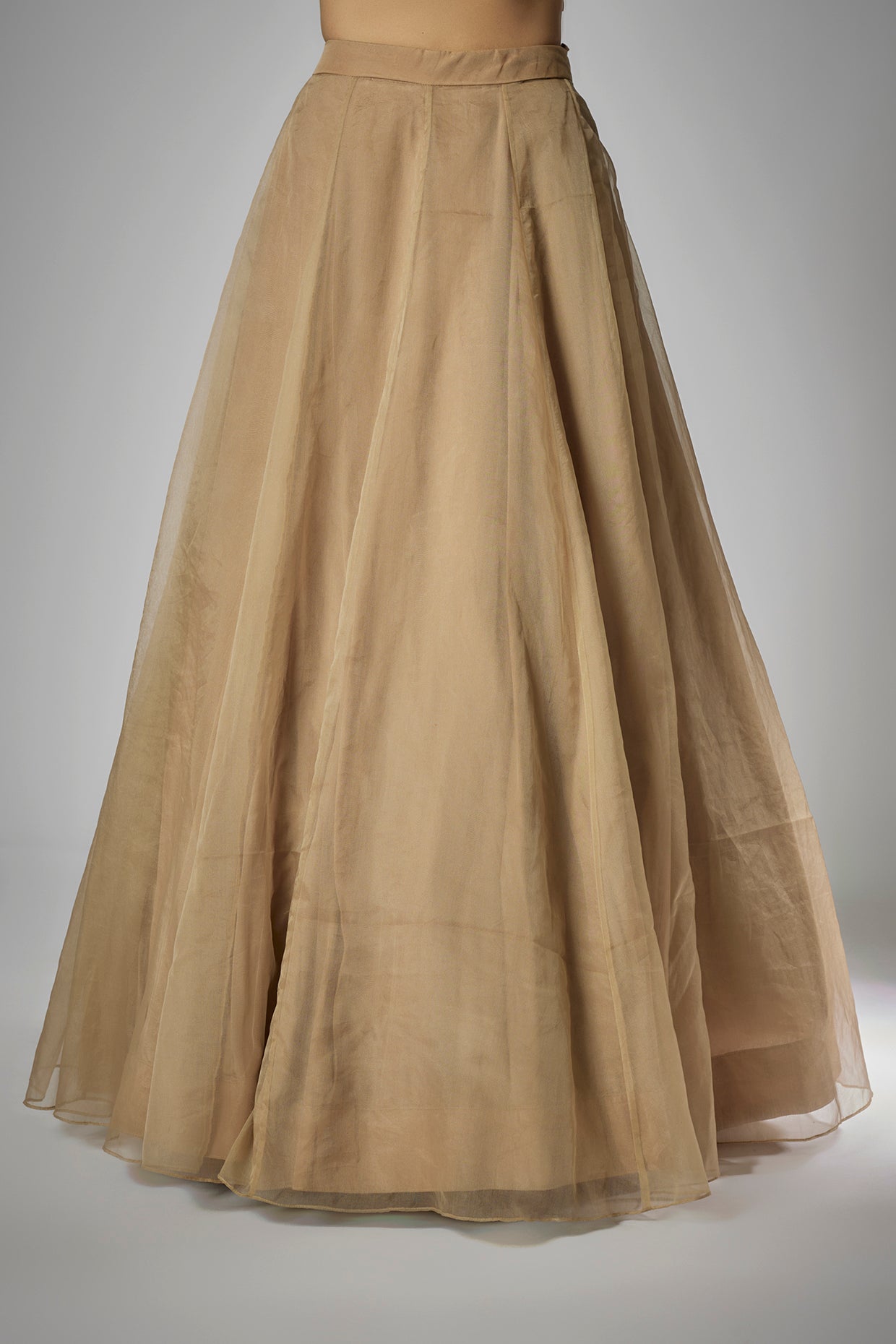 Featuring A Gold Jacket In Net Base With Sequins And Cutdana Hand Embroidery. It Is Paired With A Matching Organza Skirt, A Blouse And A Dupatta. Perfect For Bridal Wear.