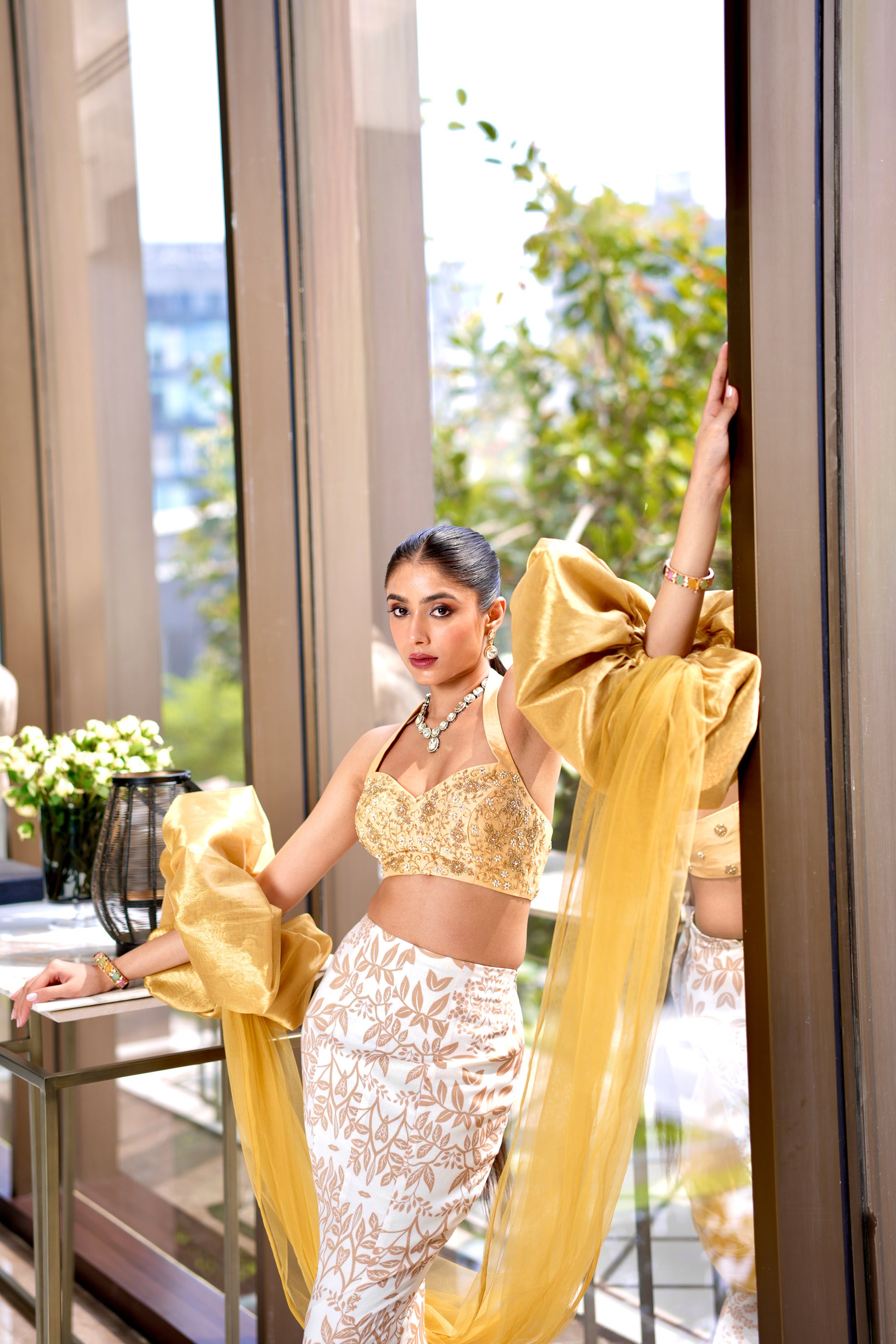 Hand embroidered silk halter necked blouse with printed modal silk fishtale lehenga paired with tissue puffed drape dupatta