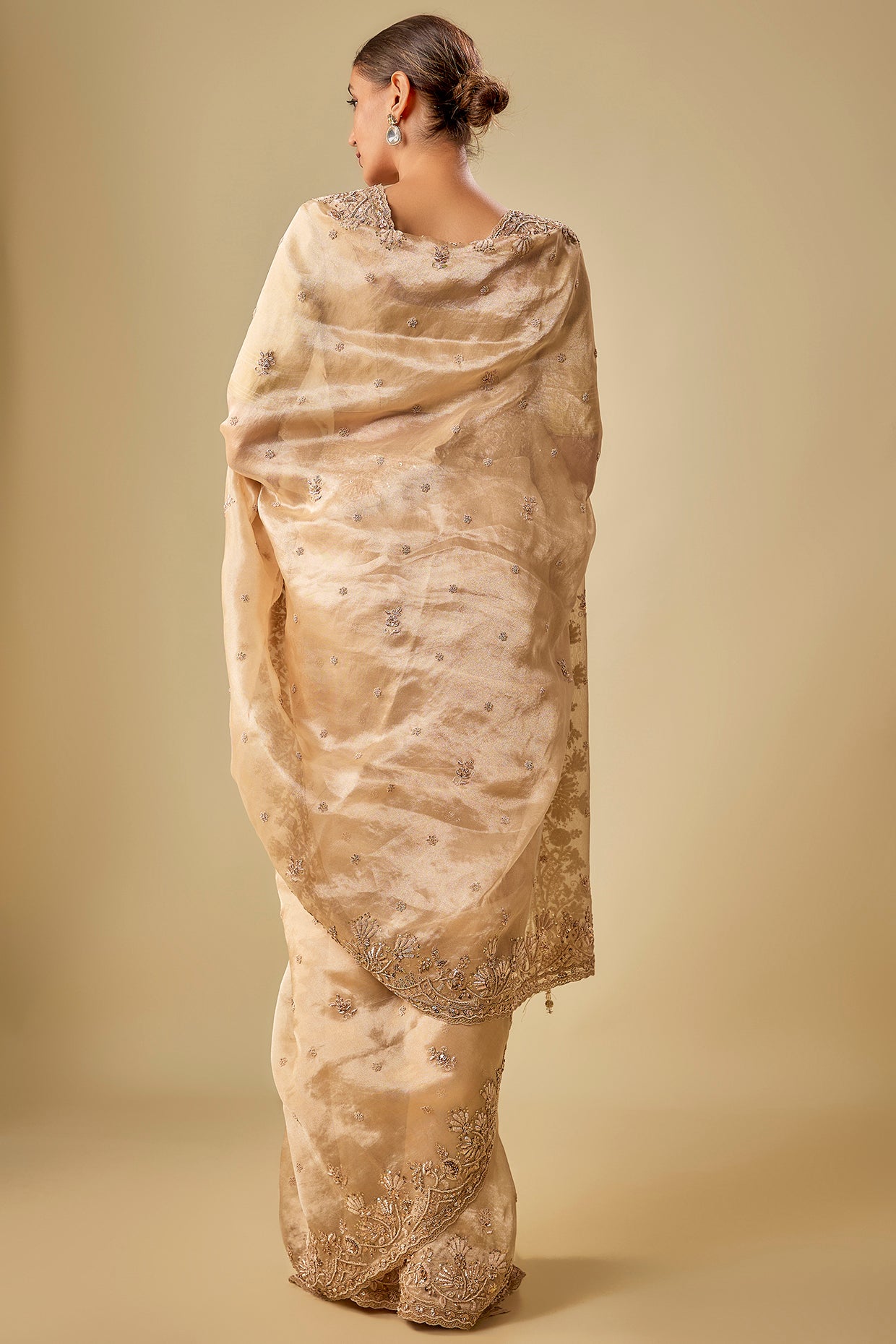 Featuring A Gold Saree In Tissue Base With Hand And Machine Embroidery. It Is Paired With An Unstitched Blouse. Accentuate It With Diamond Jewellery And Heels For An Engagement Ceremony Or Weddings.