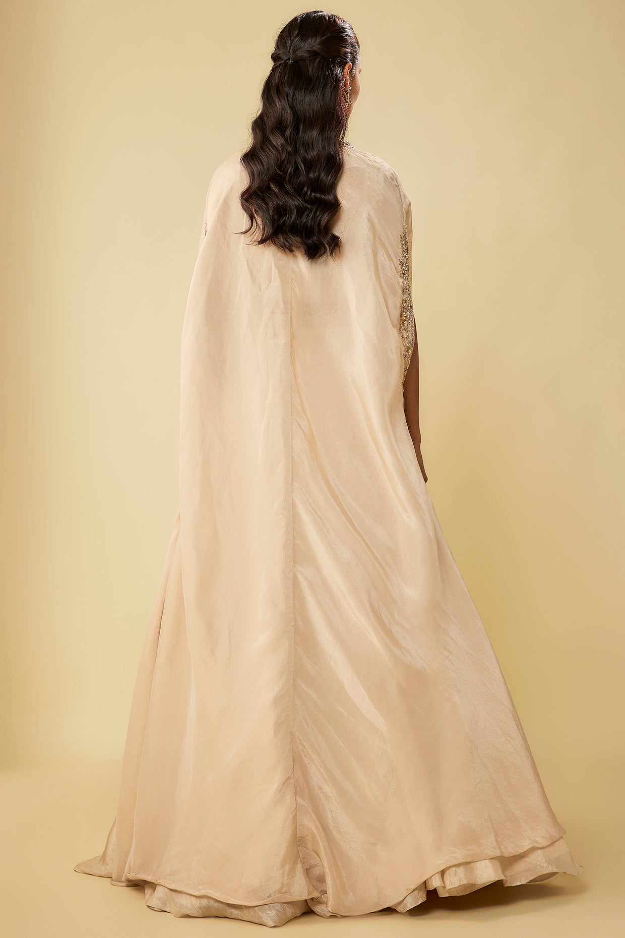 Featuring A Gold Bustier In Tissue Base With Aari, Sequins, Zardosi Hand And Machine Embroidery. It Is Paired With A Lehenga And An Organza Cape Having Boota Detailing. Accentuate It With Statement Earrings, Heels, And A Sleek Clutch For A Sangeet Or Engagement Ceremony.