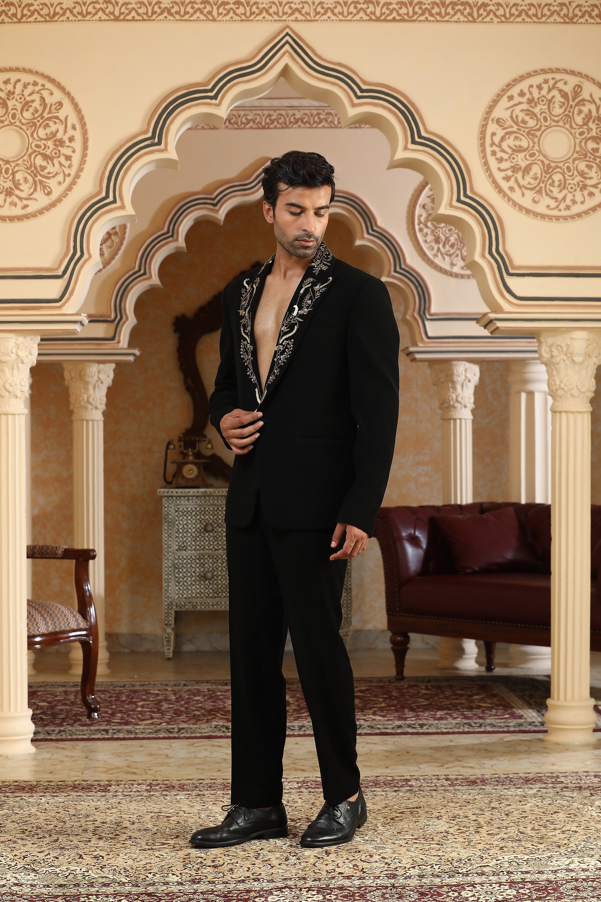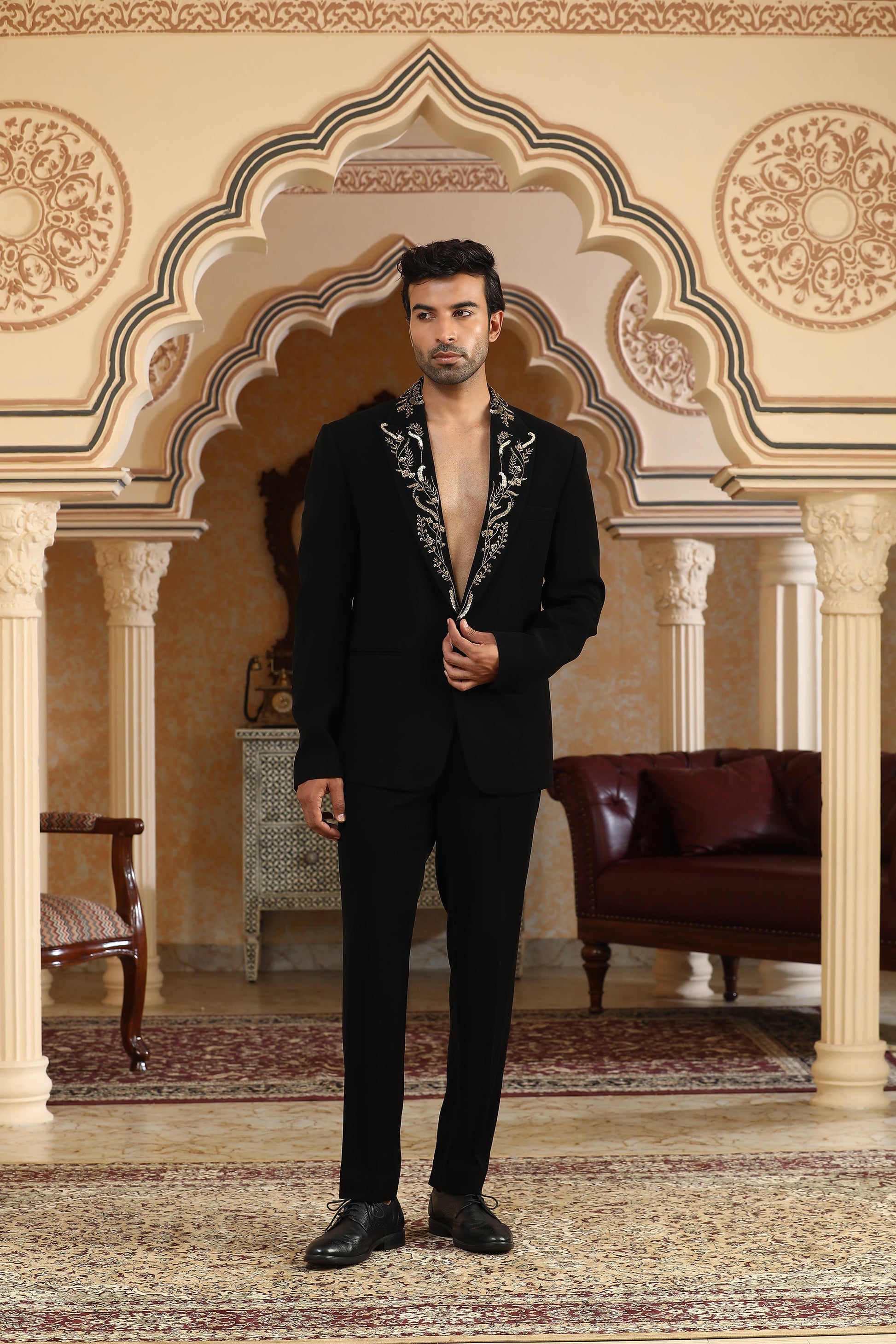An ode to opulence, the Gold Vines suit set is crafted in luxurious black Italian viscose and intricately adorned with gilded threads. Zardozi, zari, sequins, and moti form delicate, meandering vines that shimmer like gold in moonlight. The embroidery grows across the coat like an enchanted forest—elegant, regal, and unapologetically bold. Paired with sleek black trousers, this set is perfect for those who believe subtlety should still make a statement.