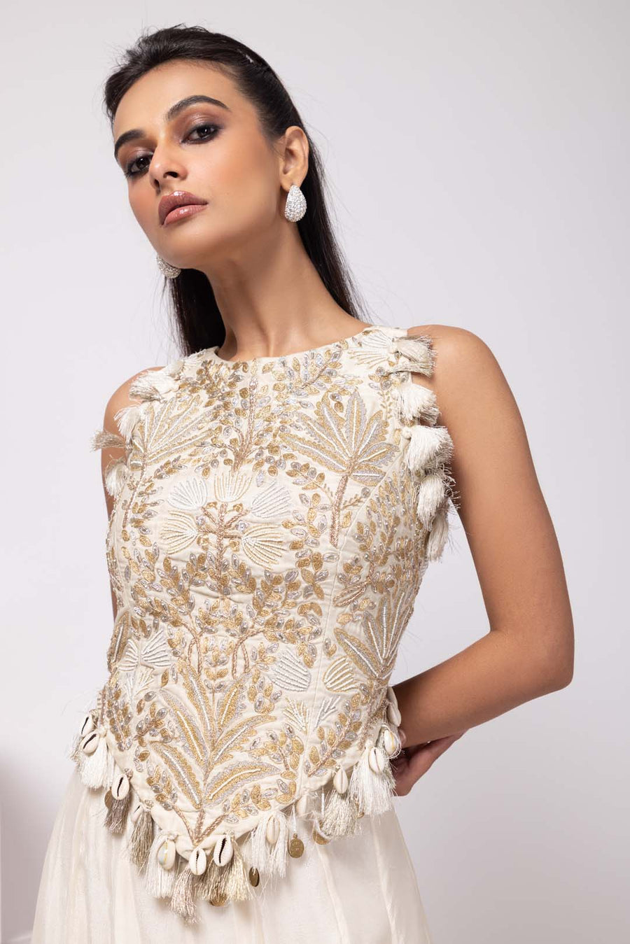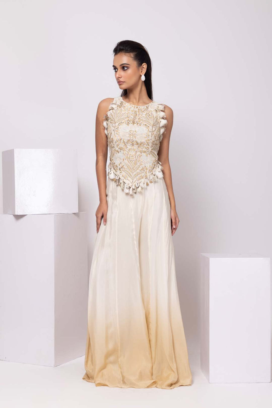 This ethereal ensemble features a beautifully embroidered sleeveless top with intricate gold threadwork, evoking a regal yet modern aesthetic. The fitted bodice is adorned with delicate tassel embellishments along the edges, adding movement and texture. The flowing pant transitions seamlessly from soft ivory to a warm golden hue, creating a dreamy ombré effect.