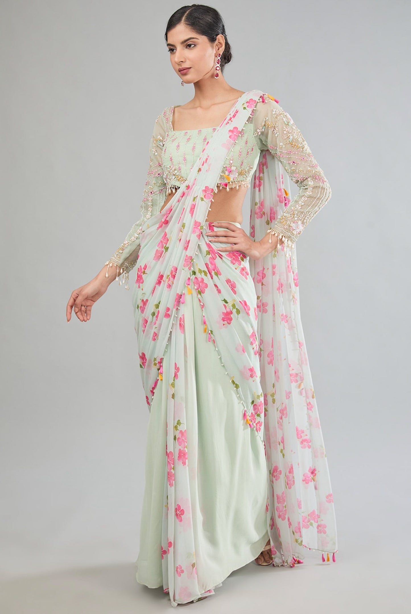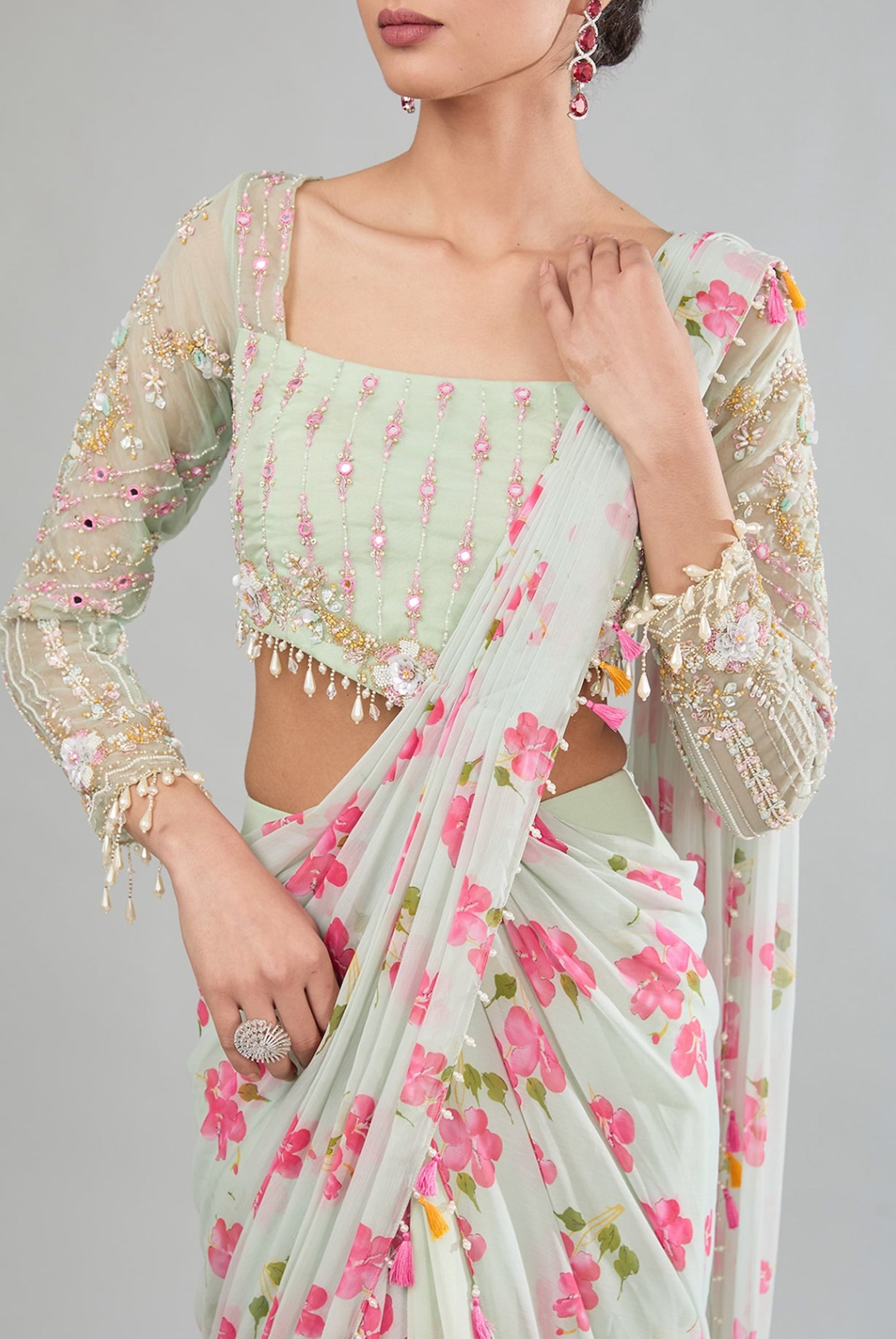 Georgette Pre- Drape Saree with Bias flare and pallu of floral Printed chiffon. Paired with heavily embroidered blouse with pearl details on hem