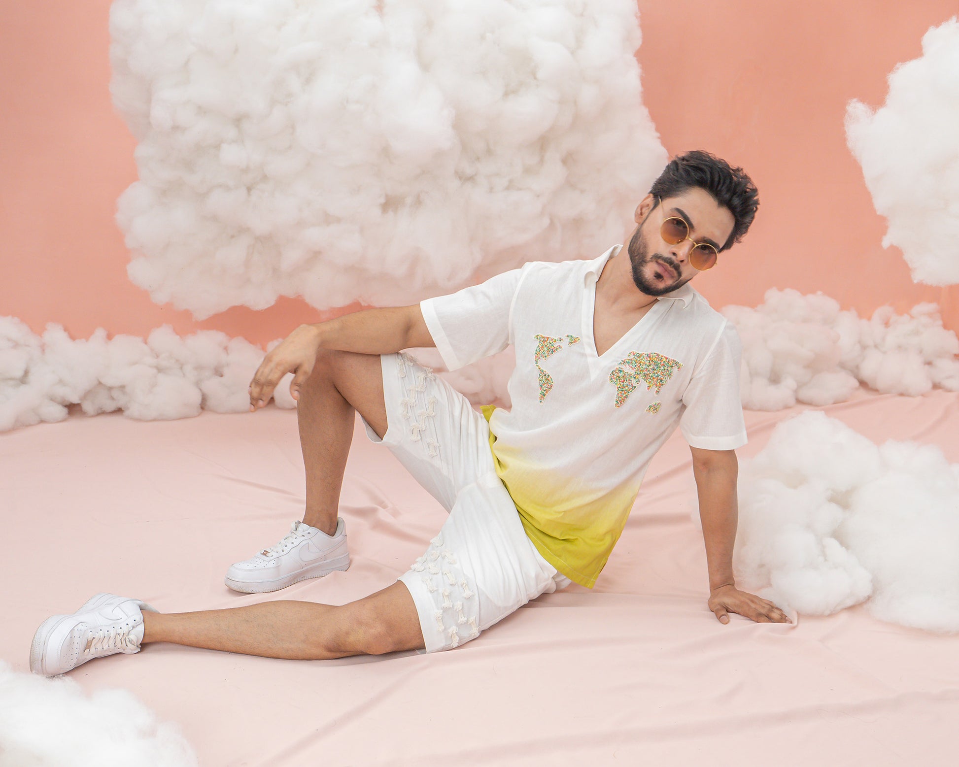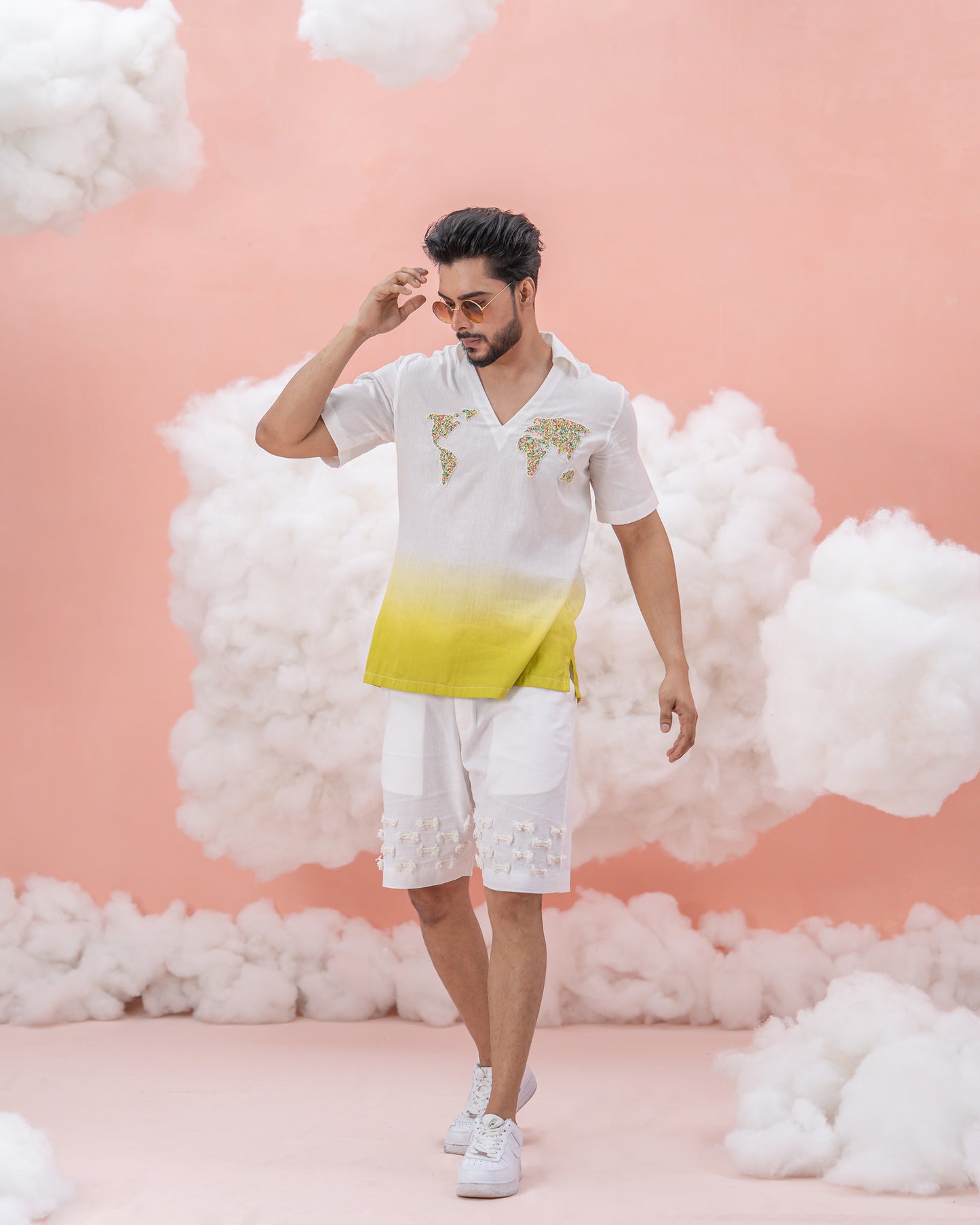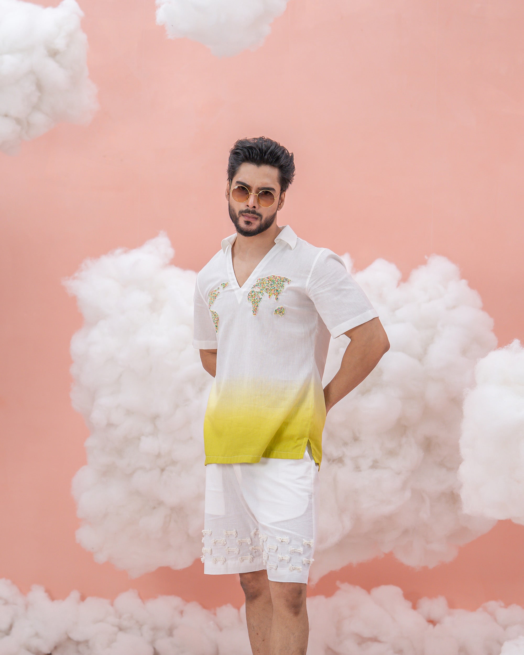 A linen cotton shirt, hand-dyed in ombré of green, adorned with intricate beadwork flaunting the world traveler in you. This design beautifully symbolizes the spirit of travel and exploration, glancing at the time spent journeying across the globe. Perfect for adventurers who wear their wanderlust with ease.