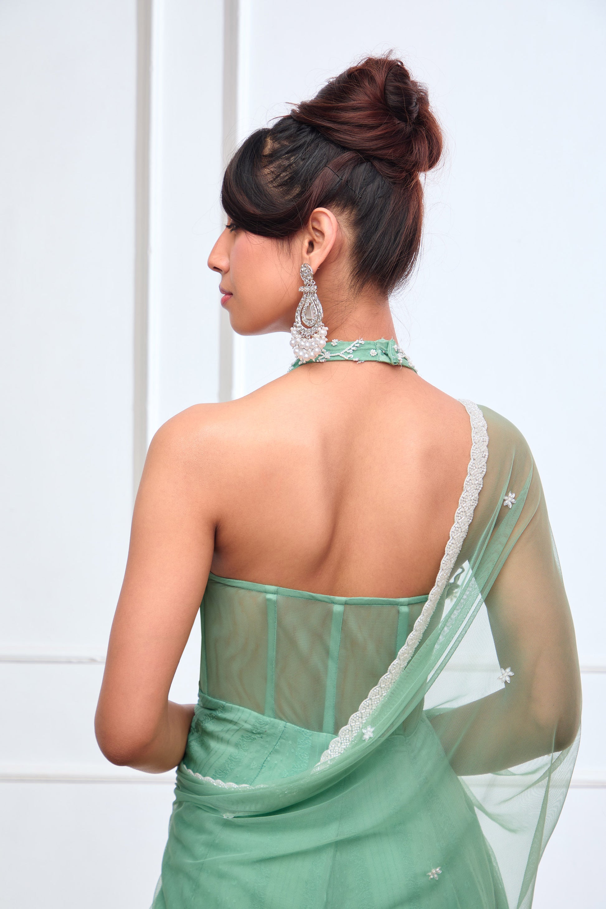 Green Organza jamdani halter corset Anarkali
