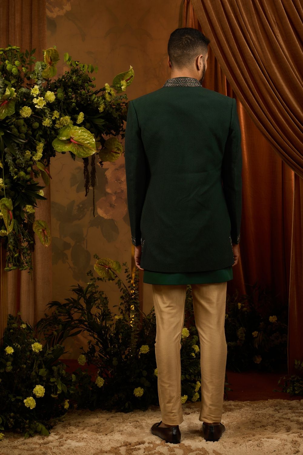 This striking green silk open Indo-western is beautifully adorned with intricate golden embroidery, blending traditional opulence with contemporary style. Perfect for weddings or festive occasions, it offers a refined, royal look with a modern touch.