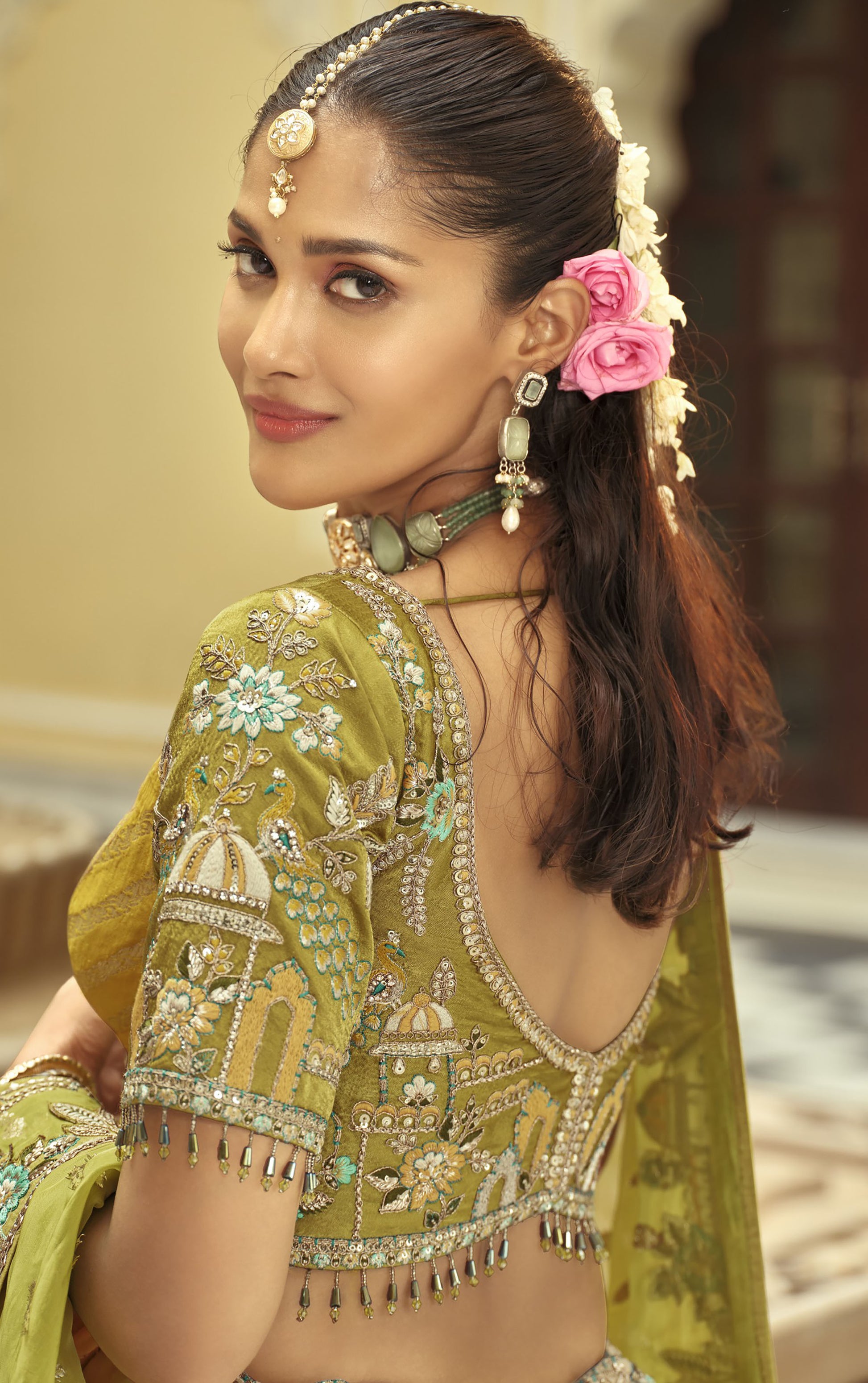 Green & Yellow Silk Heavy Cut Work and Mirror Embroidery Mehendi Lehenga for Bride
