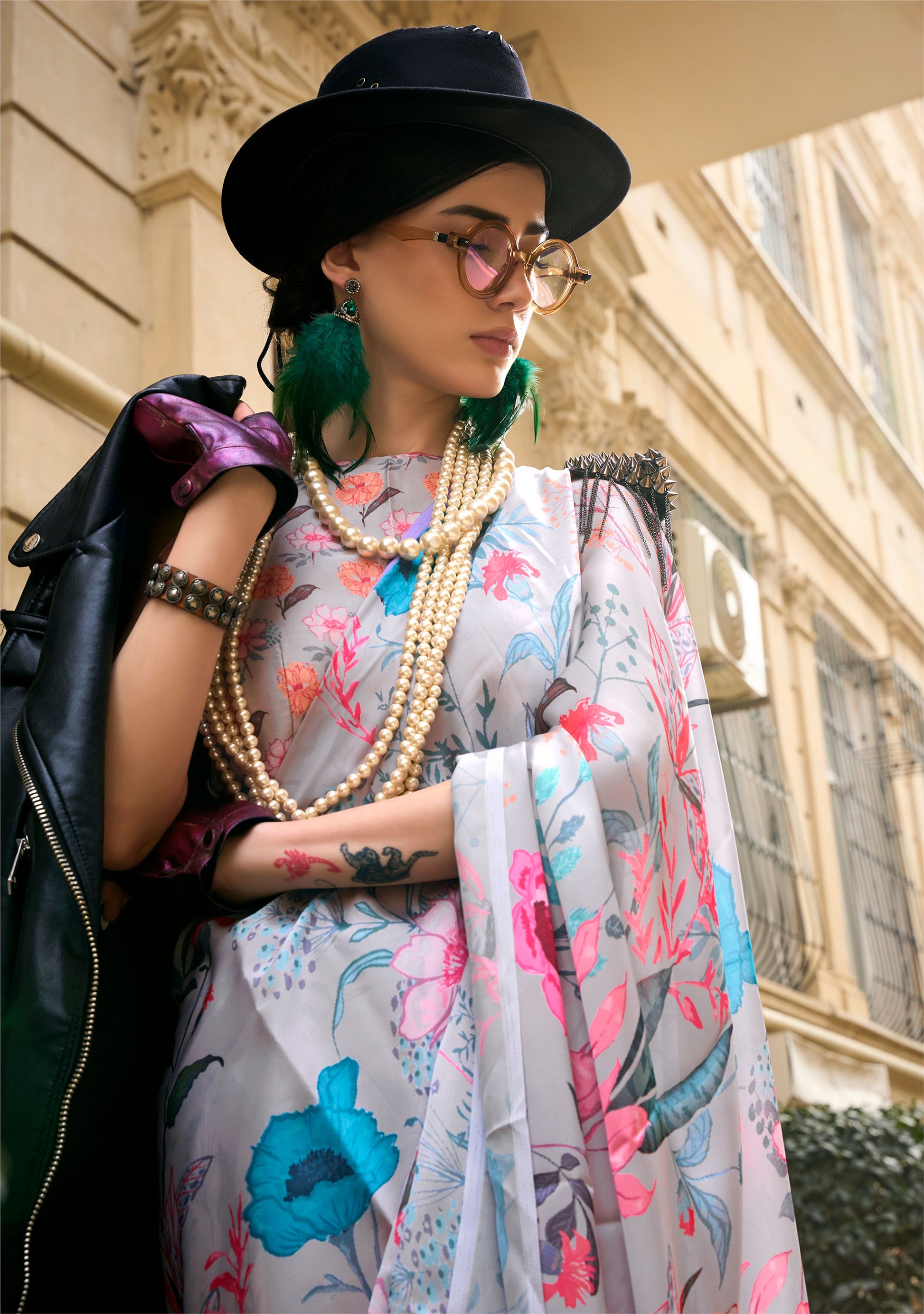 Grey Floral Kolombus Satin Georgette Printed Saree