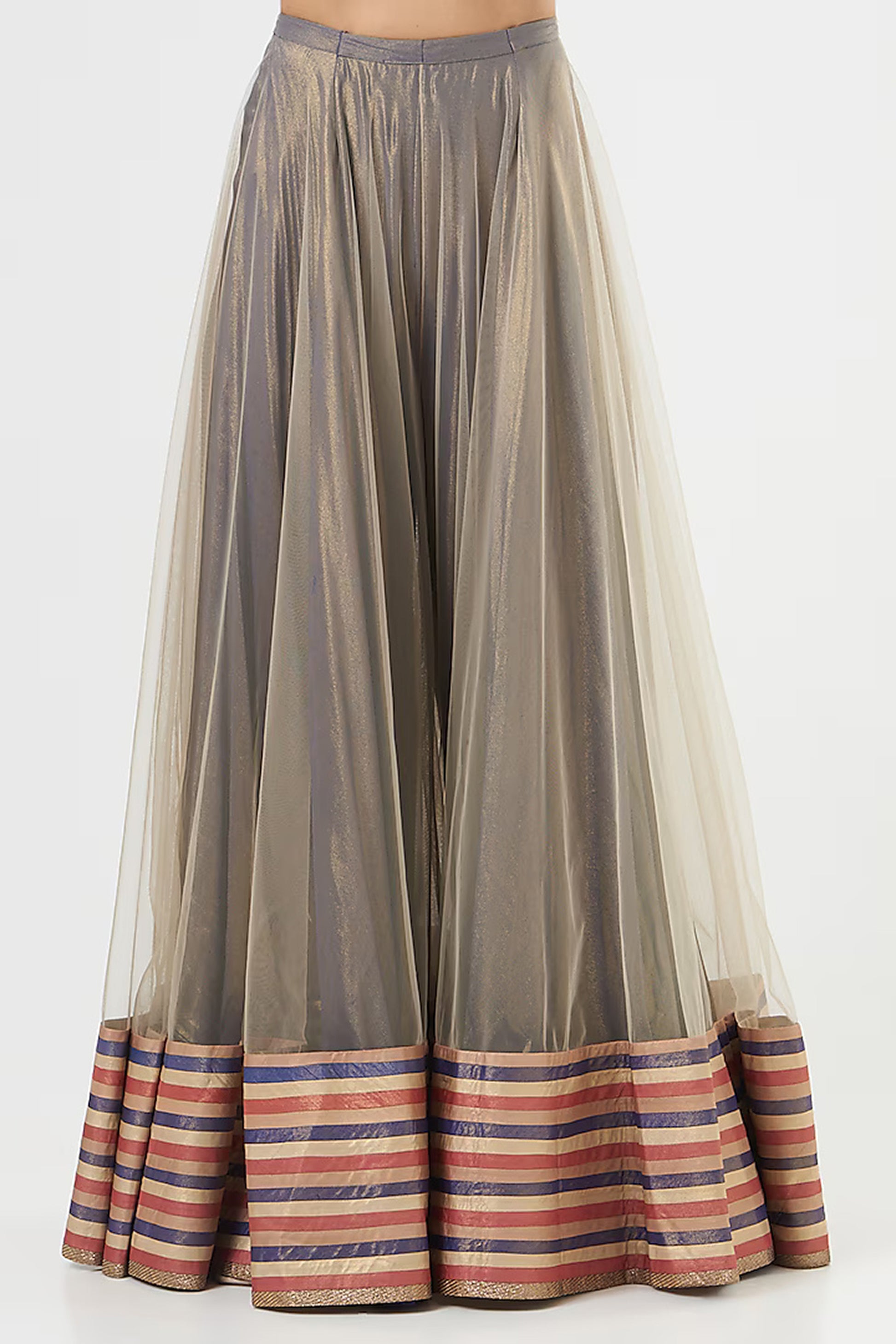 Featuring a grey lehenga in french net base with brocade applique work. It is paired with a contrasting kurti and a hand embroidered dupatta.