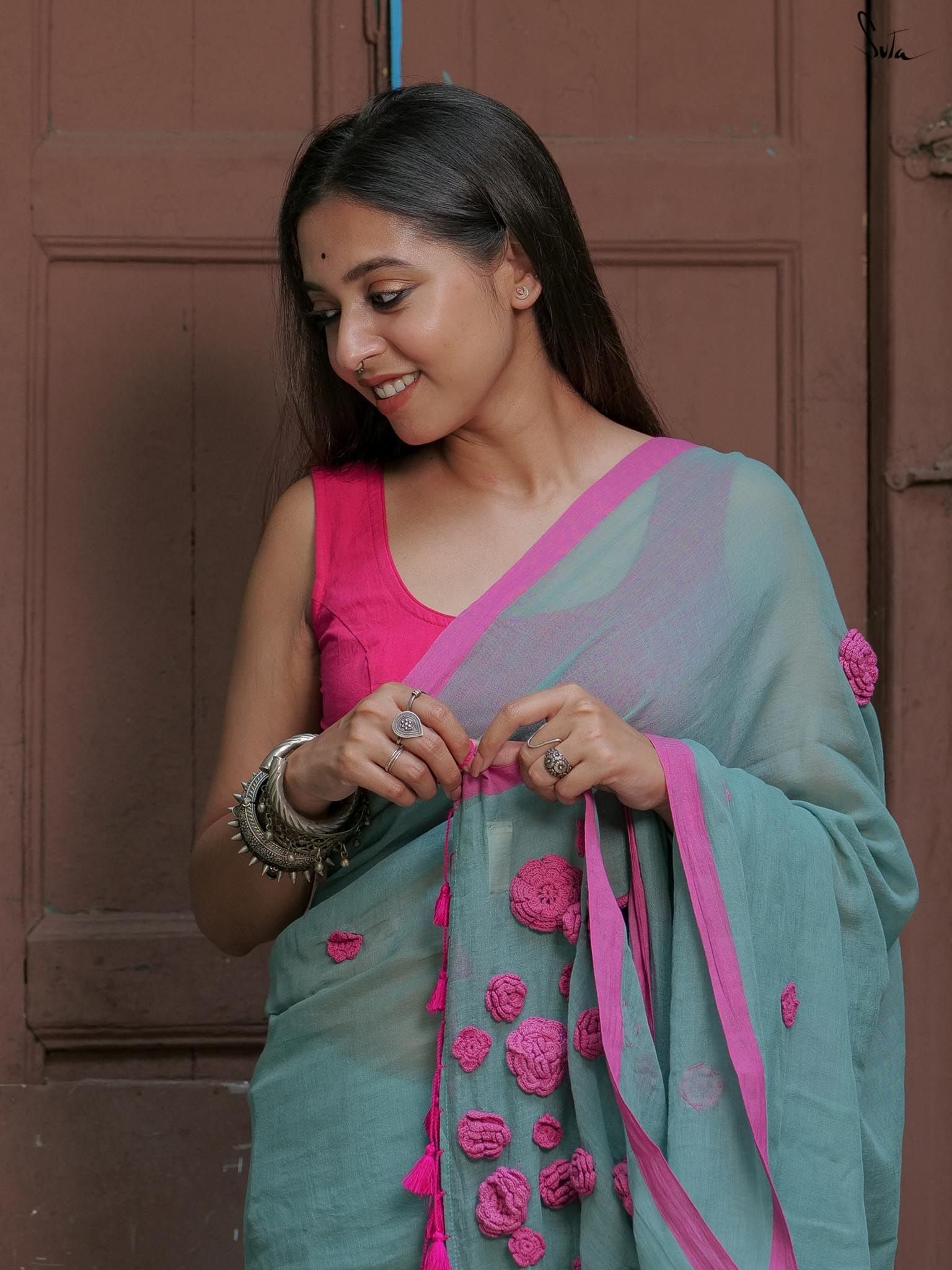 The Gul Noor Mul cotton saree is your summer dream. Breathable Mul fabric keeps you cool, while hand-crafted 3D crochet flowers add whimsical charm and texture. The contrasting colors create a captivating look. Perfect for summer soirees, Holi celebrations, or radiating effortless elegance any sunny day.