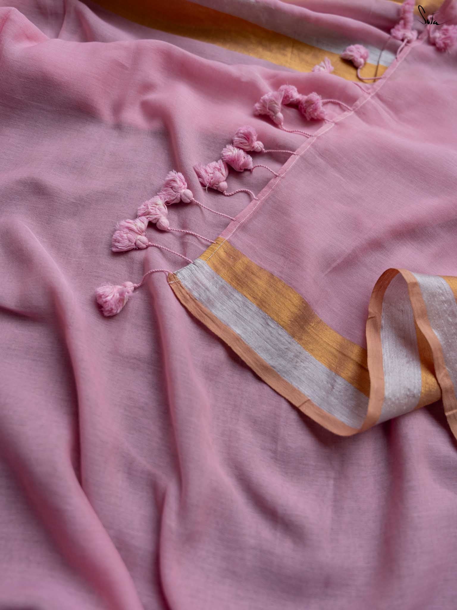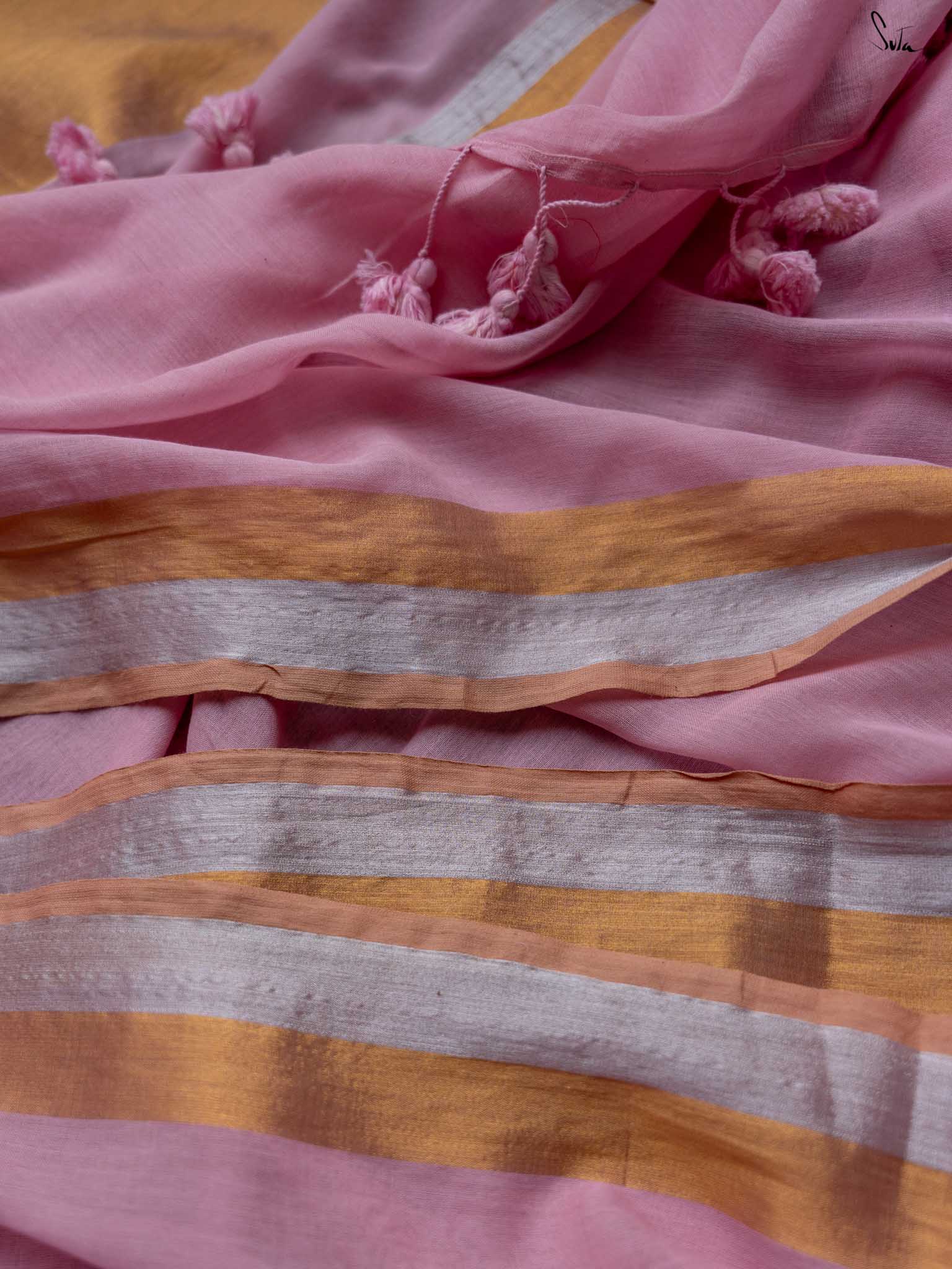 Gulabi Moti is a heartwarming baby pink saree, crafted from delicate mul cotton. Consisting of a contrasting broad gold border and pallu, it has zari lines running all over, adding shimmering grace to the ensemble. Weave a tapestry of exquisite style with the 'Gulabi Moti' saree.