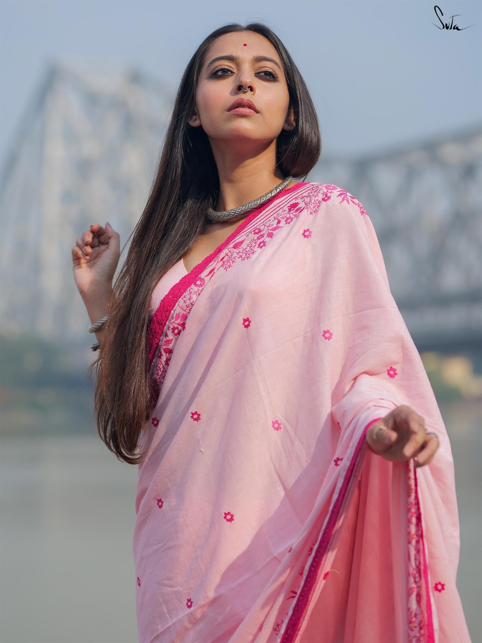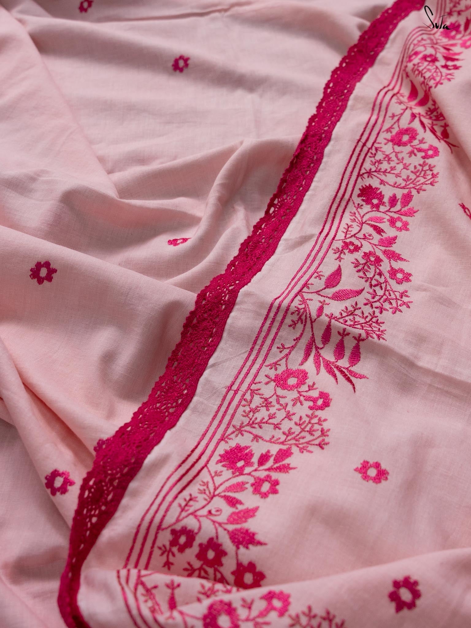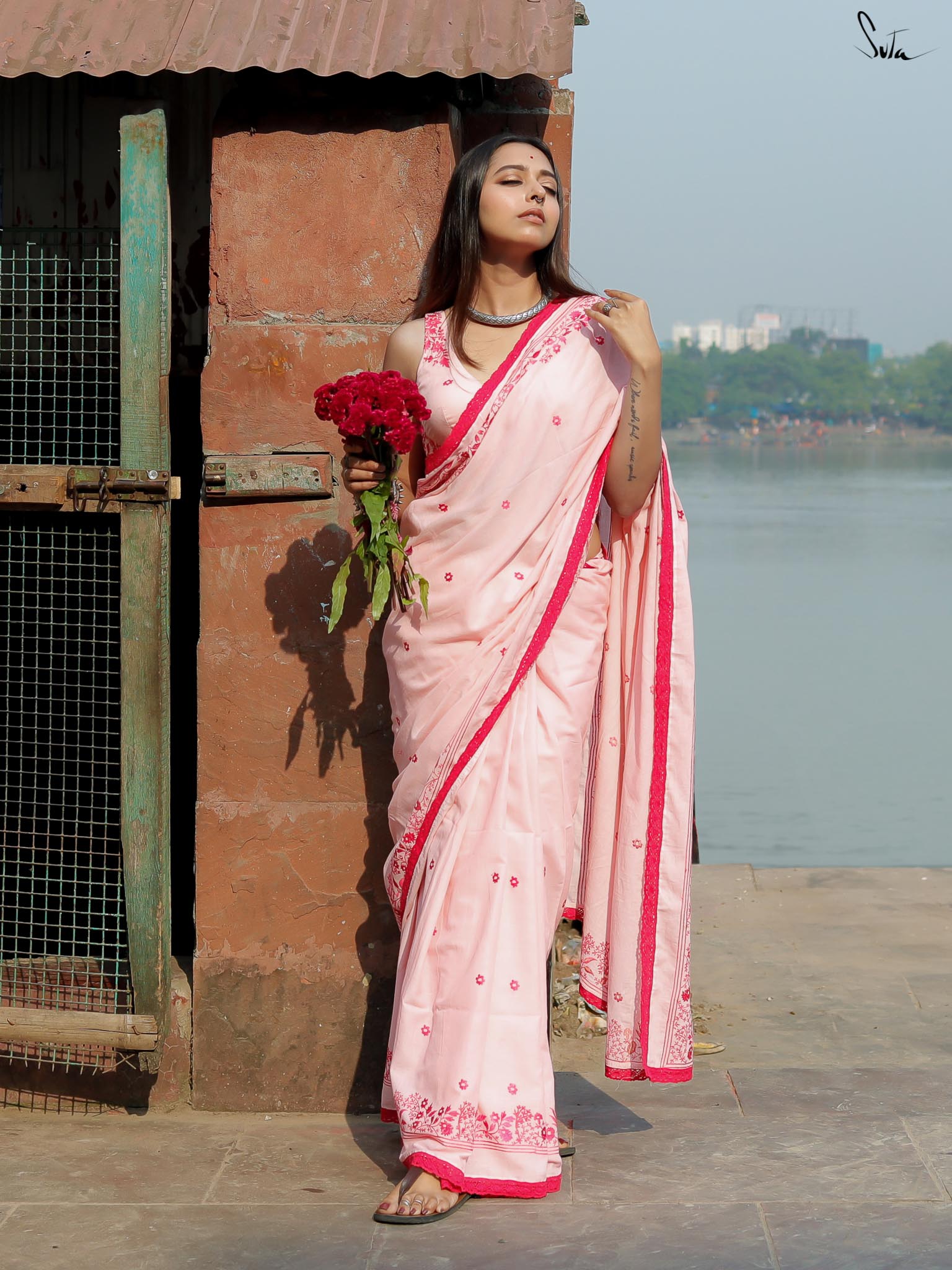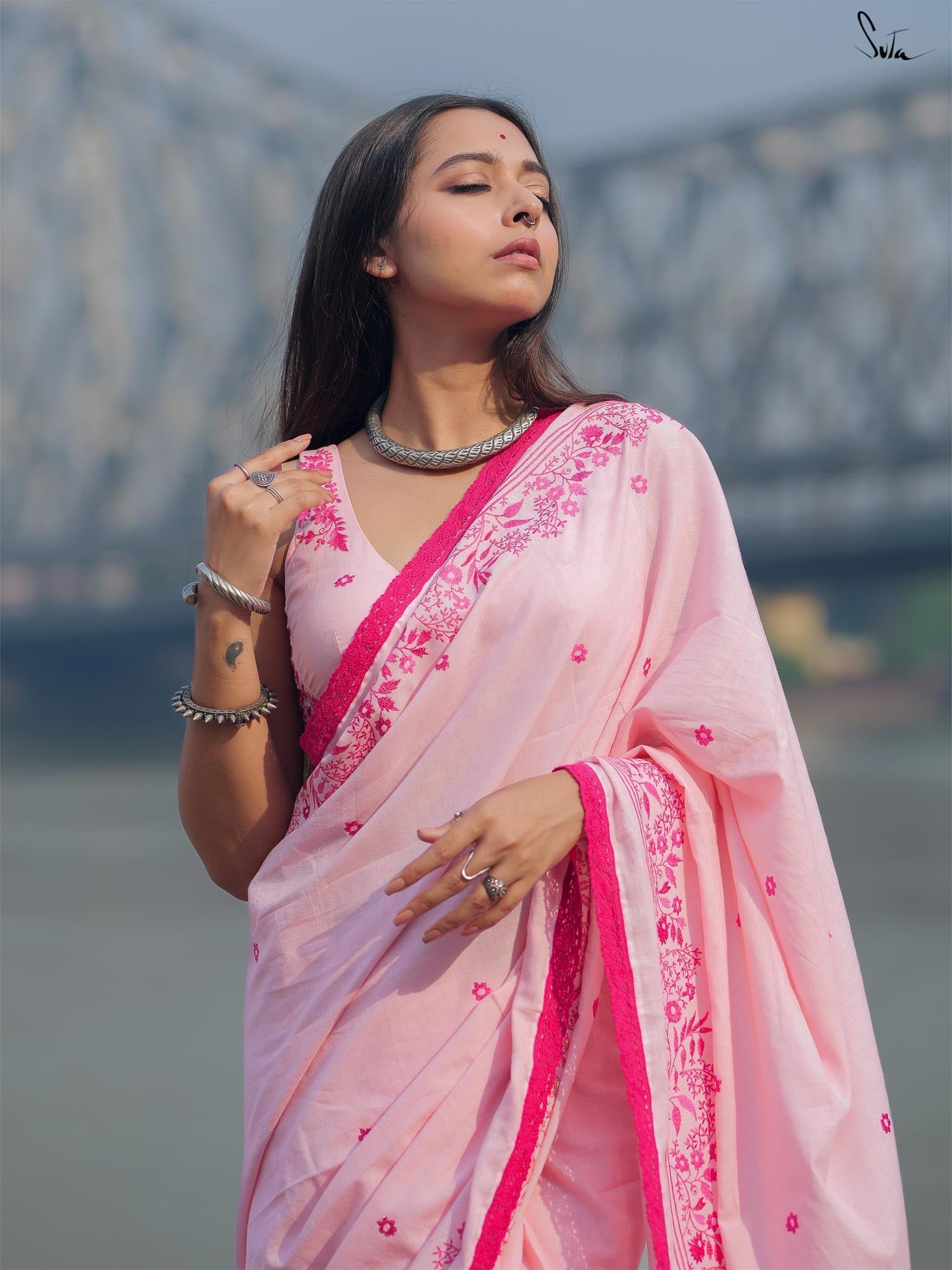 Unfold a story of summer with Guldasta. This cotton saree is a cool canvas adorned with a mesmerizing tale told through machine-embroidered floral butis. The story continues on the borders, outlined with beautiful pink lace. Guldasta is more than a saree, it's a testament to the art of summer dressing, proving that comfort and intricate embroidery can create a look that's both beautiful and breathable.