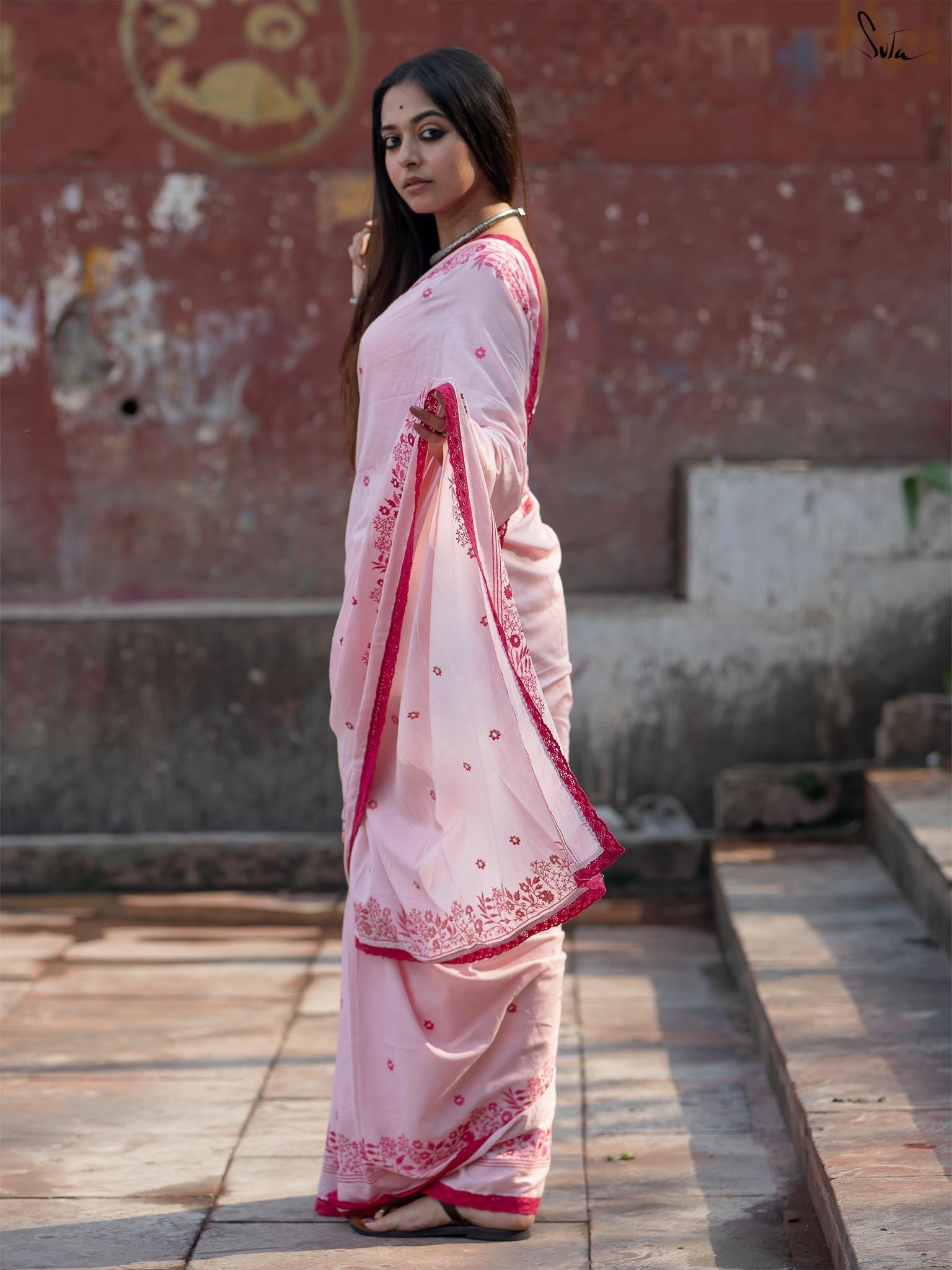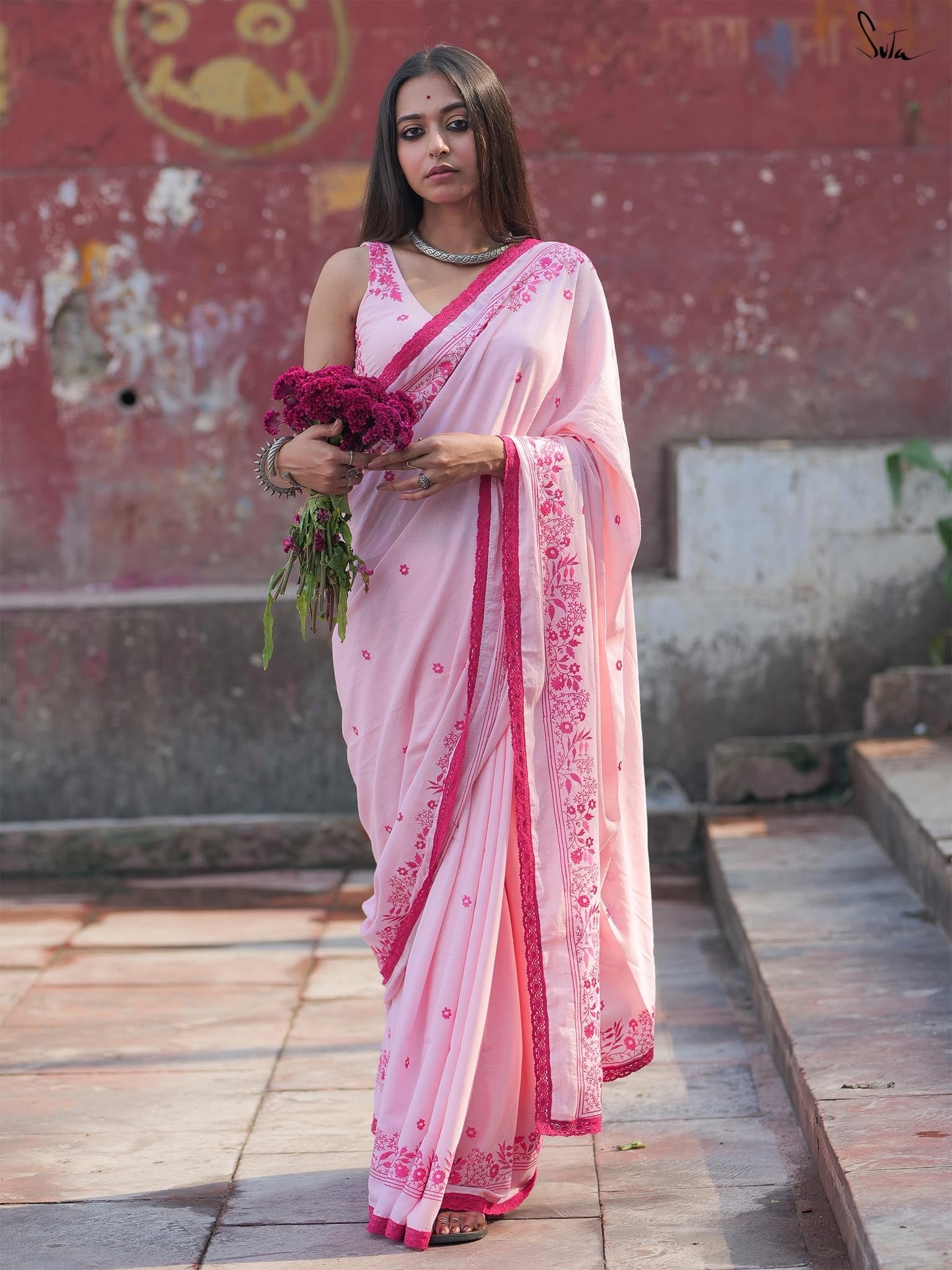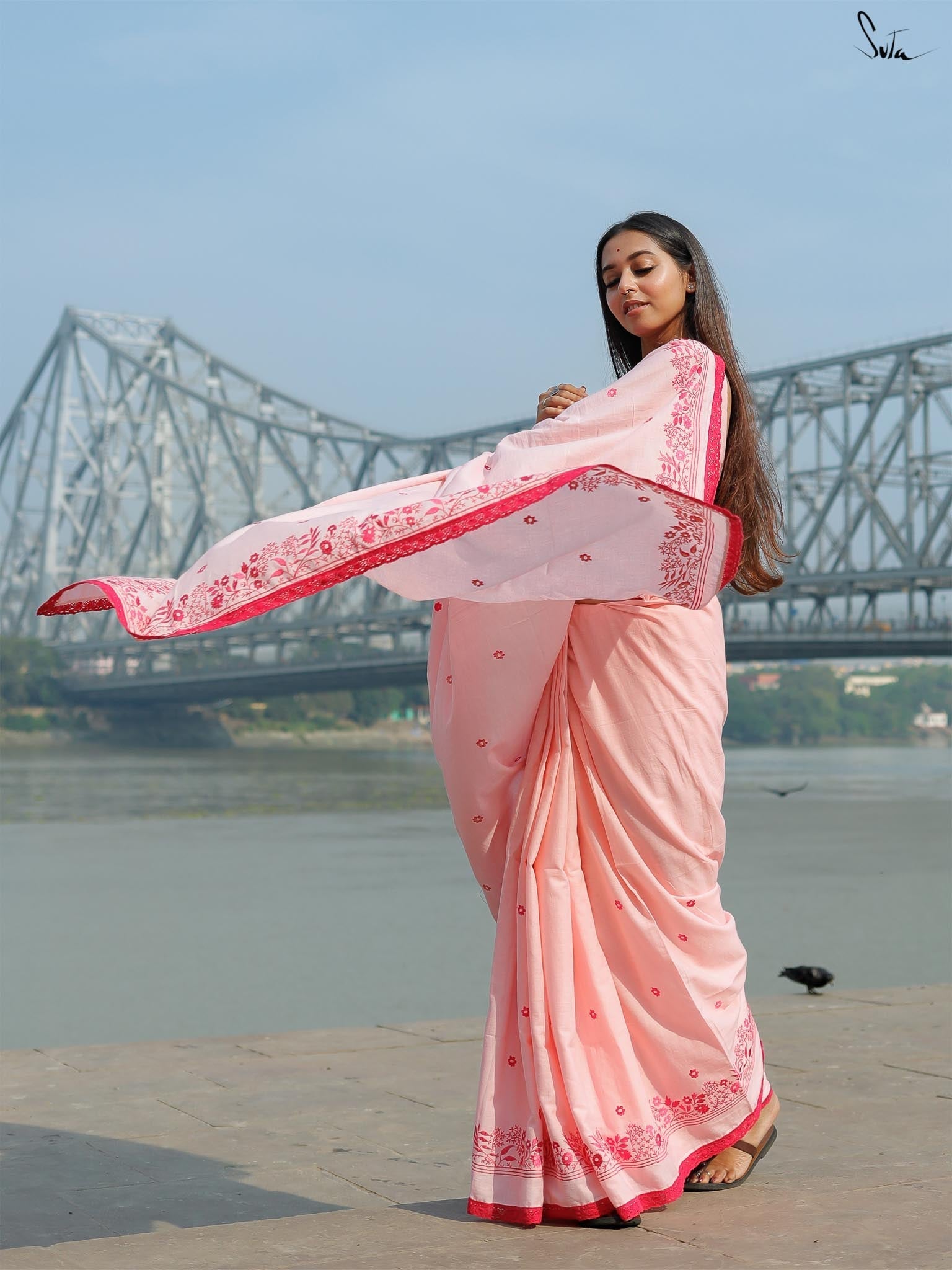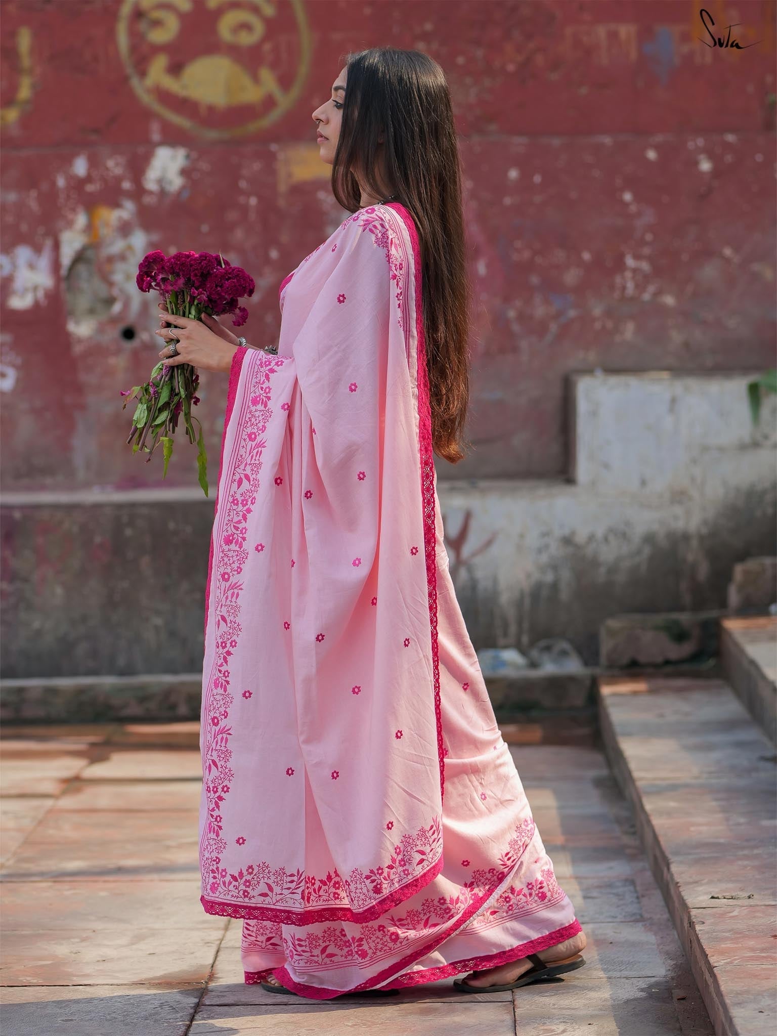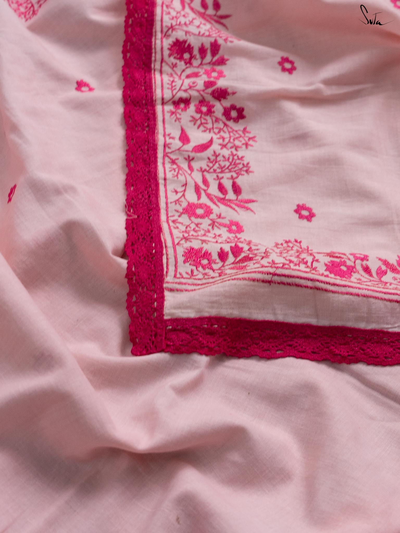 Unfold a story of summer with Guldasta. This cotton saree is a cool canvas adorned with a mesmerizing tale told through machine-embroidered floral butis. The story continues on the borders, outlined with beautiful pink lace. Guldasta is more than a saree, it's a testament to the art of summer dressing, proving that comfort and intricate embroidery can create a look that's both beautiful and breathable.