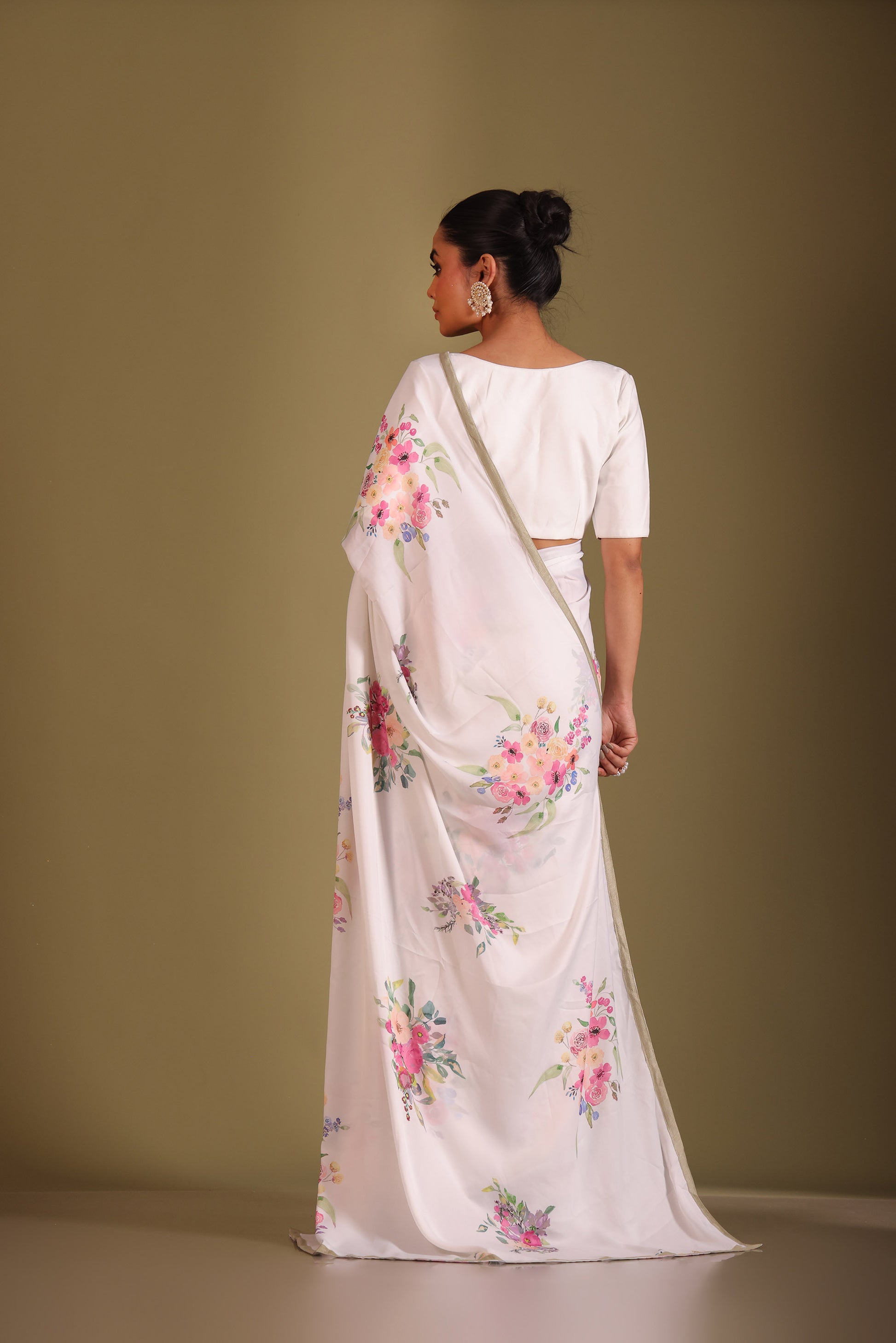 The saree is crafted in soft crepe, featuring delicate floral prints that lend an elegant, timeless charm.