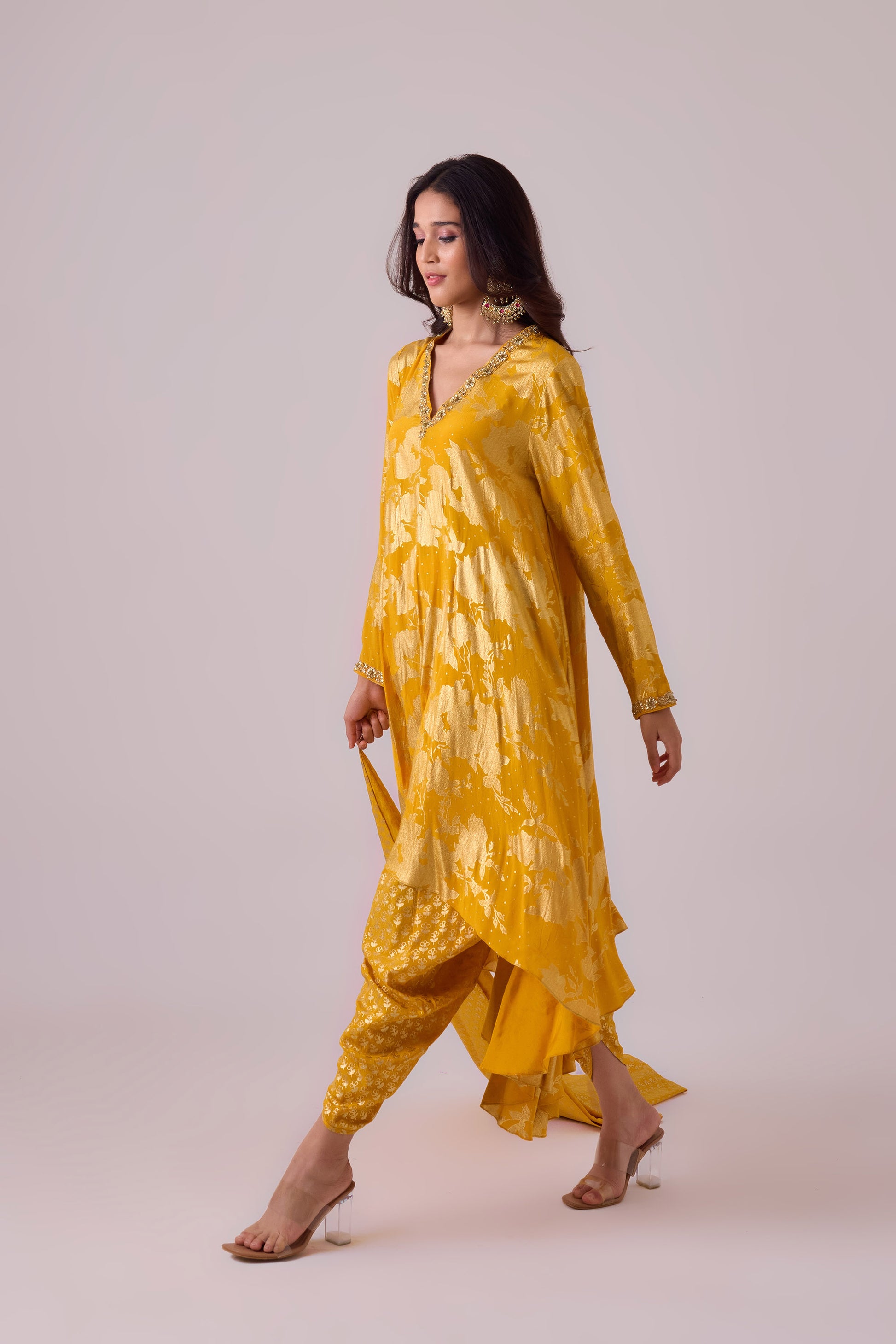 Haldi phool long asymmetrical foil printed kurta with intricate hand embroidery paired with foil printed crepe pleated dhoti pants and beautiful scarf with handcrafted intricate thread tassels.