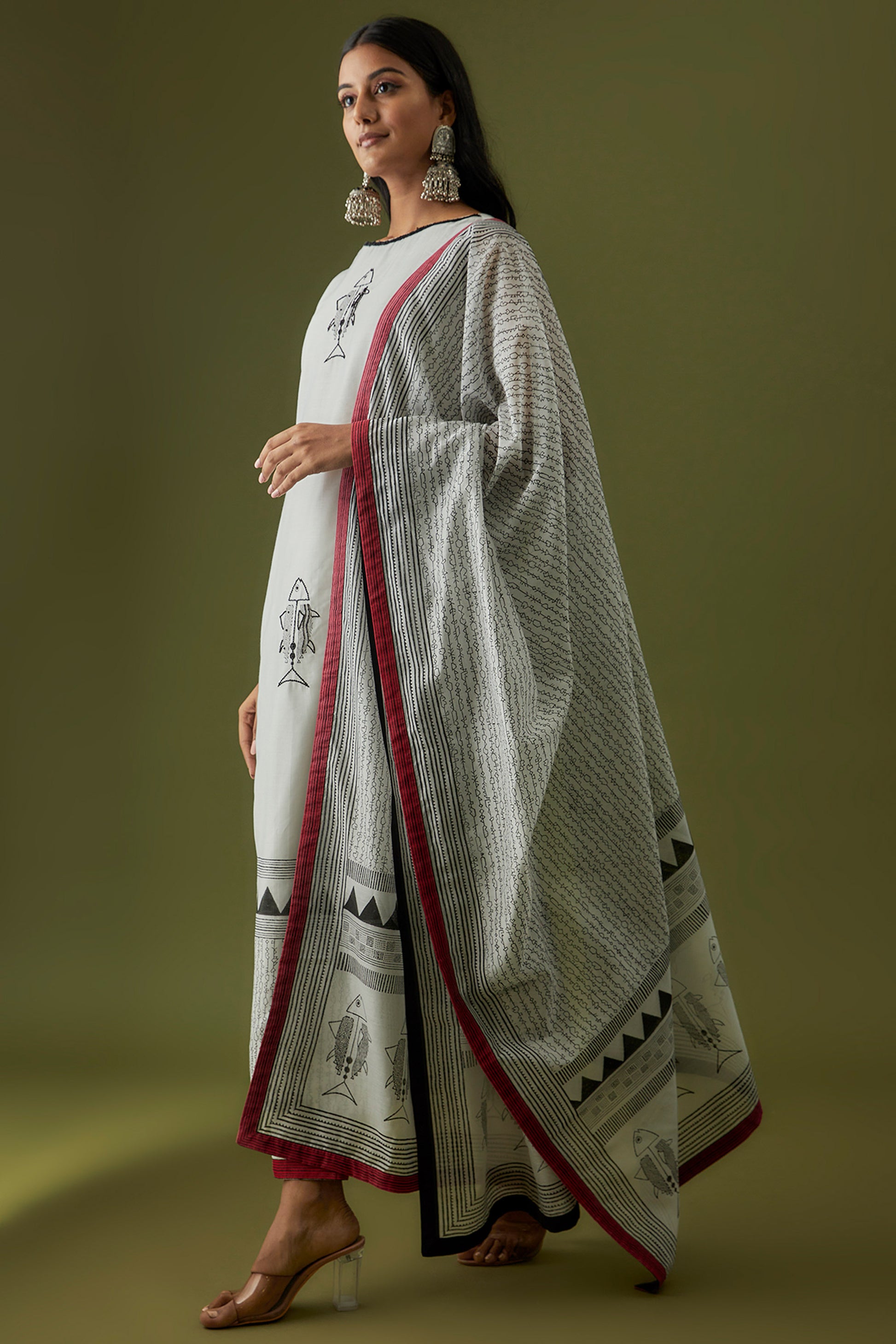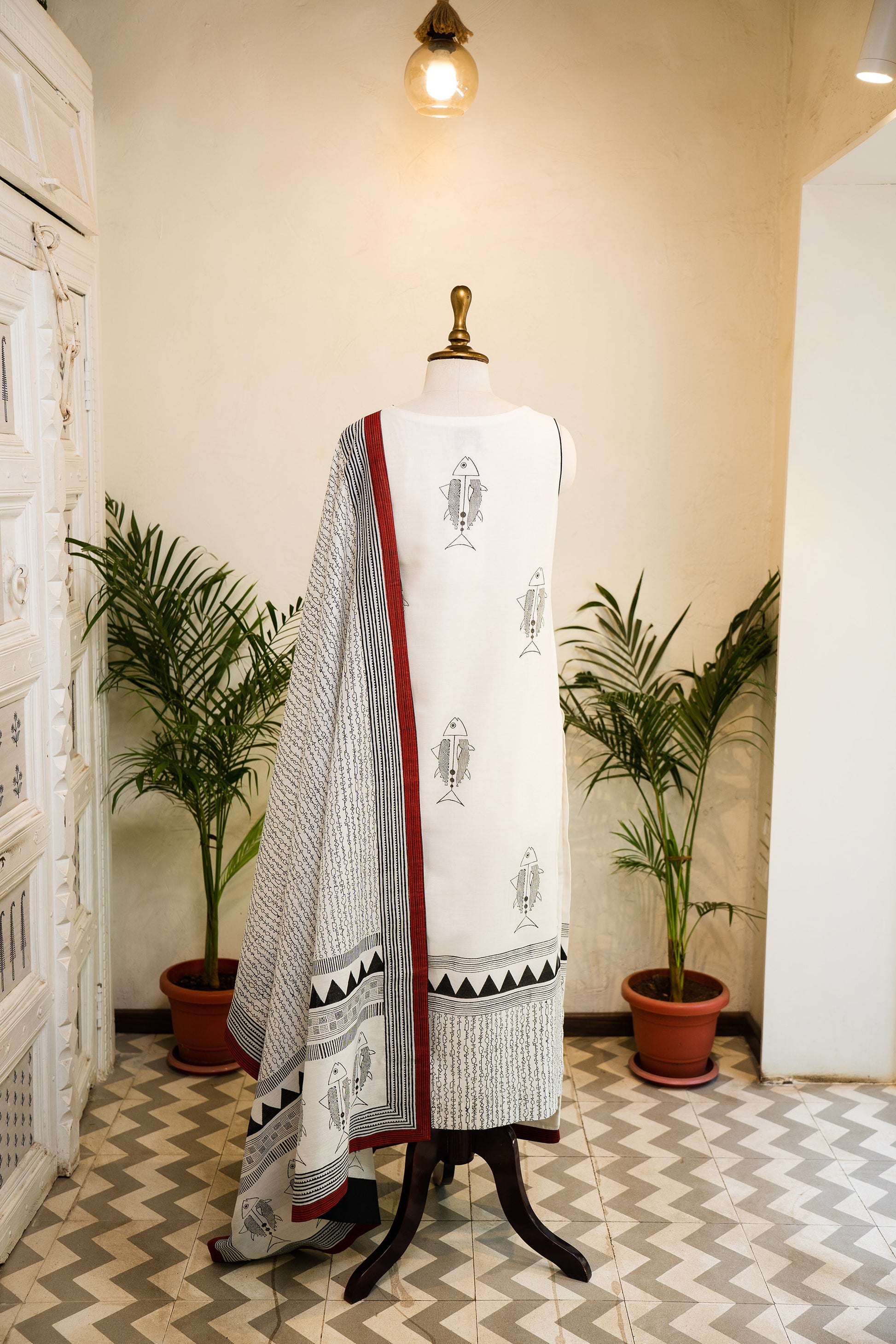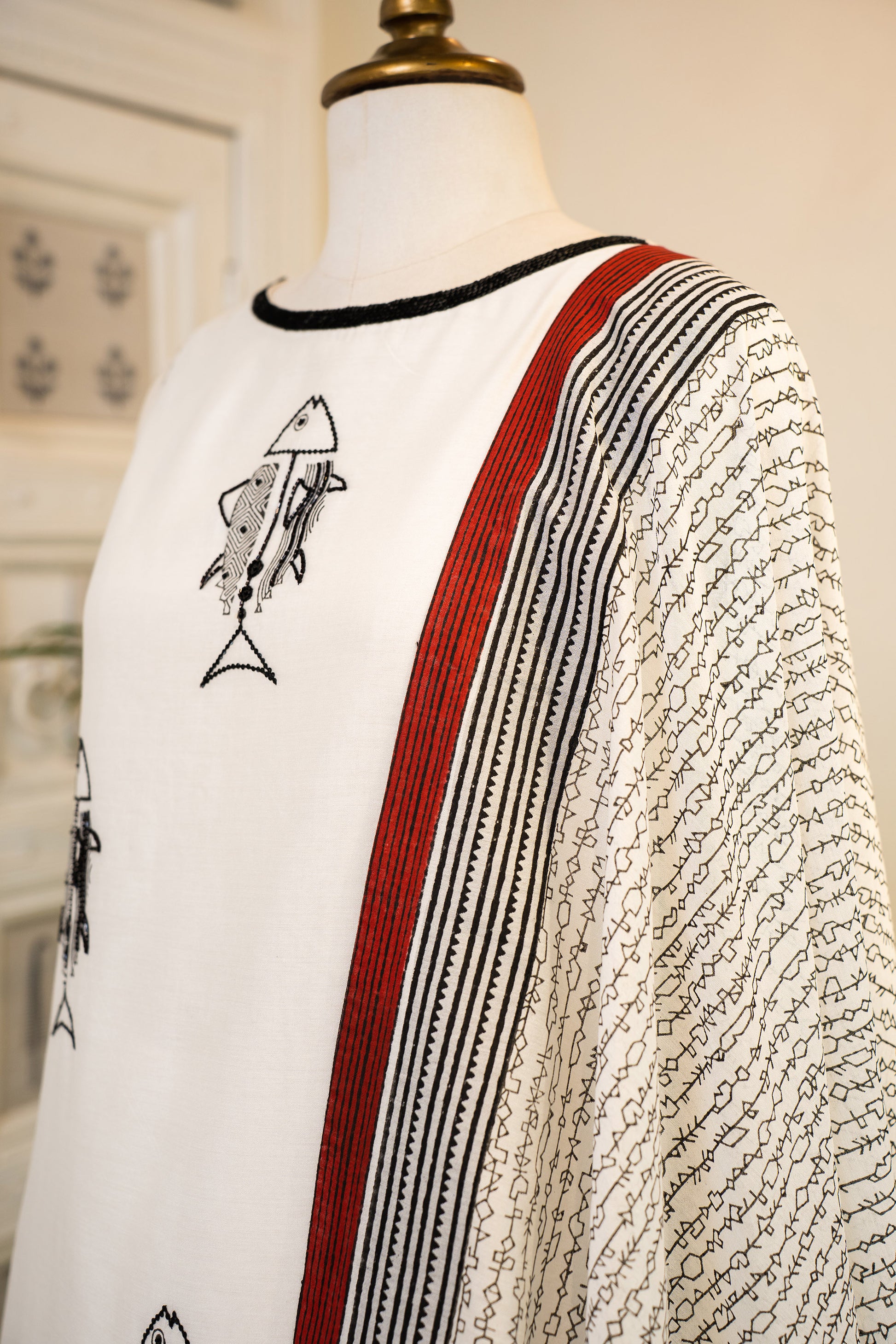 Hand Block Printed and Embroidered Ivory Designer Kurta Set
