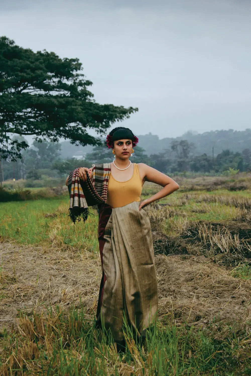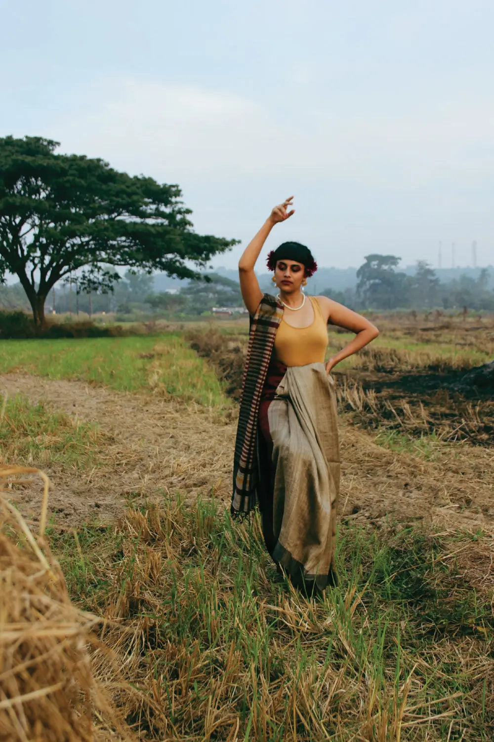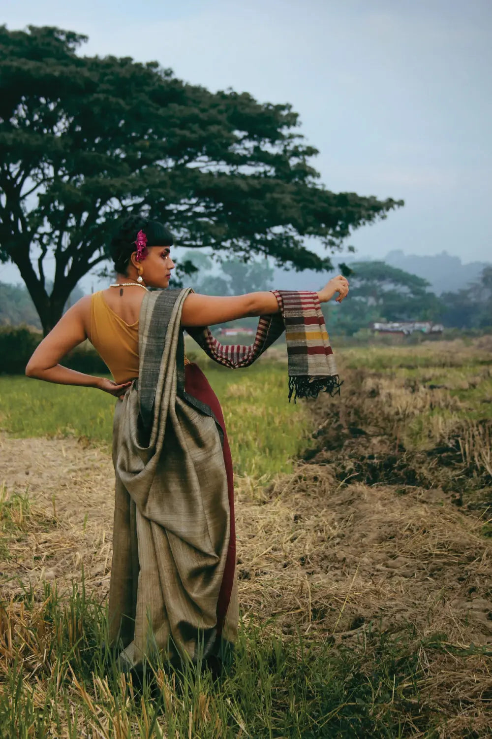 Explore sophistication with our Handloom Light Brown Kosa Silk Saree, an ode to timeless allure. Enhanced by a deep Maroon pallu, this saree harmonizes tradition with contemporary flair. Draping it uniquely, inspired by the provided picture, unveils a modern, avant-garde style. The delicate light brown Kosa silk radiates refinement, adding a unique and modern touch to classic saree aesthetics. Embrace a fashion statement that transforms your look, seamlessly blending the grace of handloom craftsmanship with a modern edge. Redefine your style effortlessly with this distinctive piece.