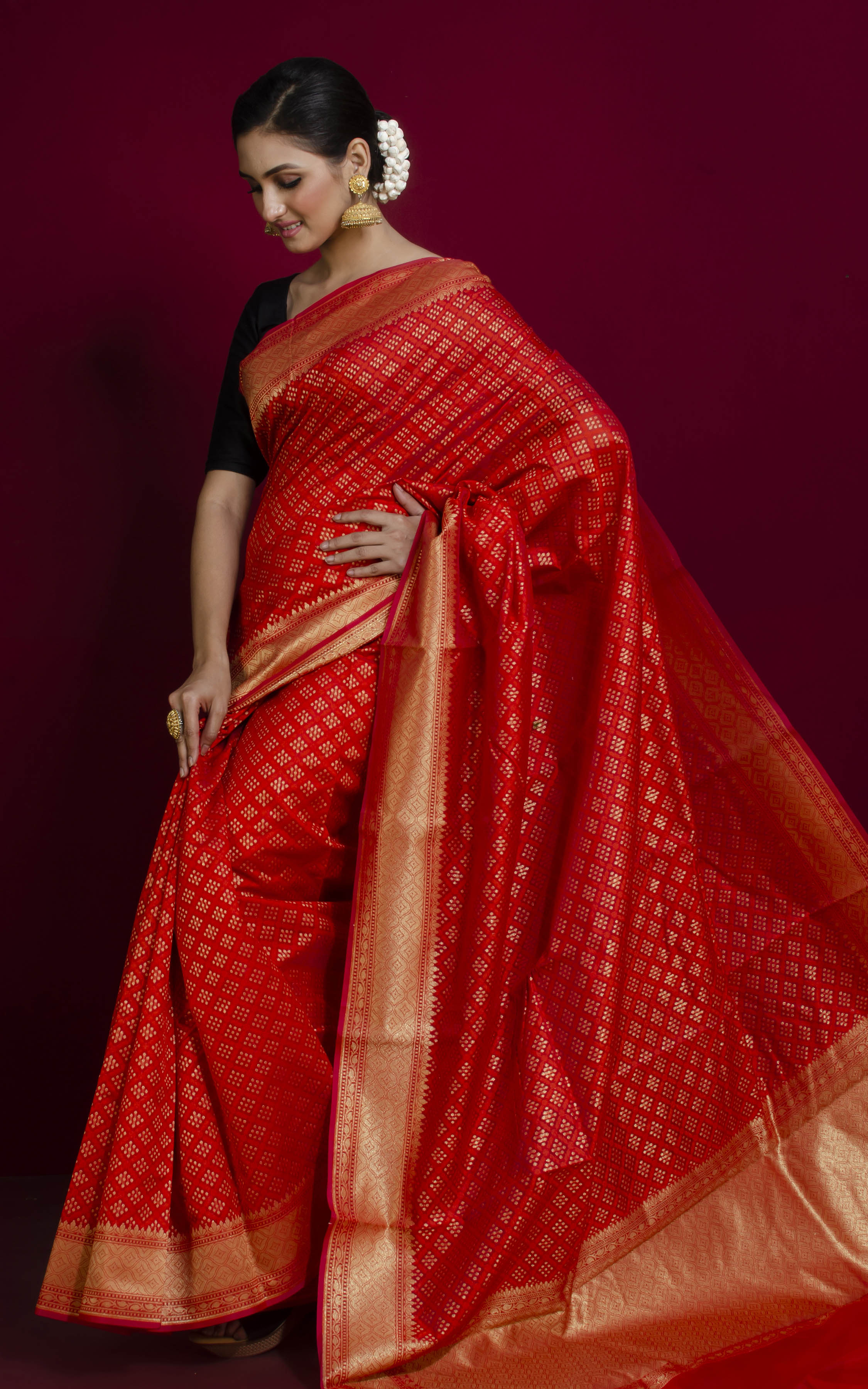Handwoven Bandhani Pattern Work Cotton Chanderi Saree in Red, Hot Pink and Gold Matte Zari Work