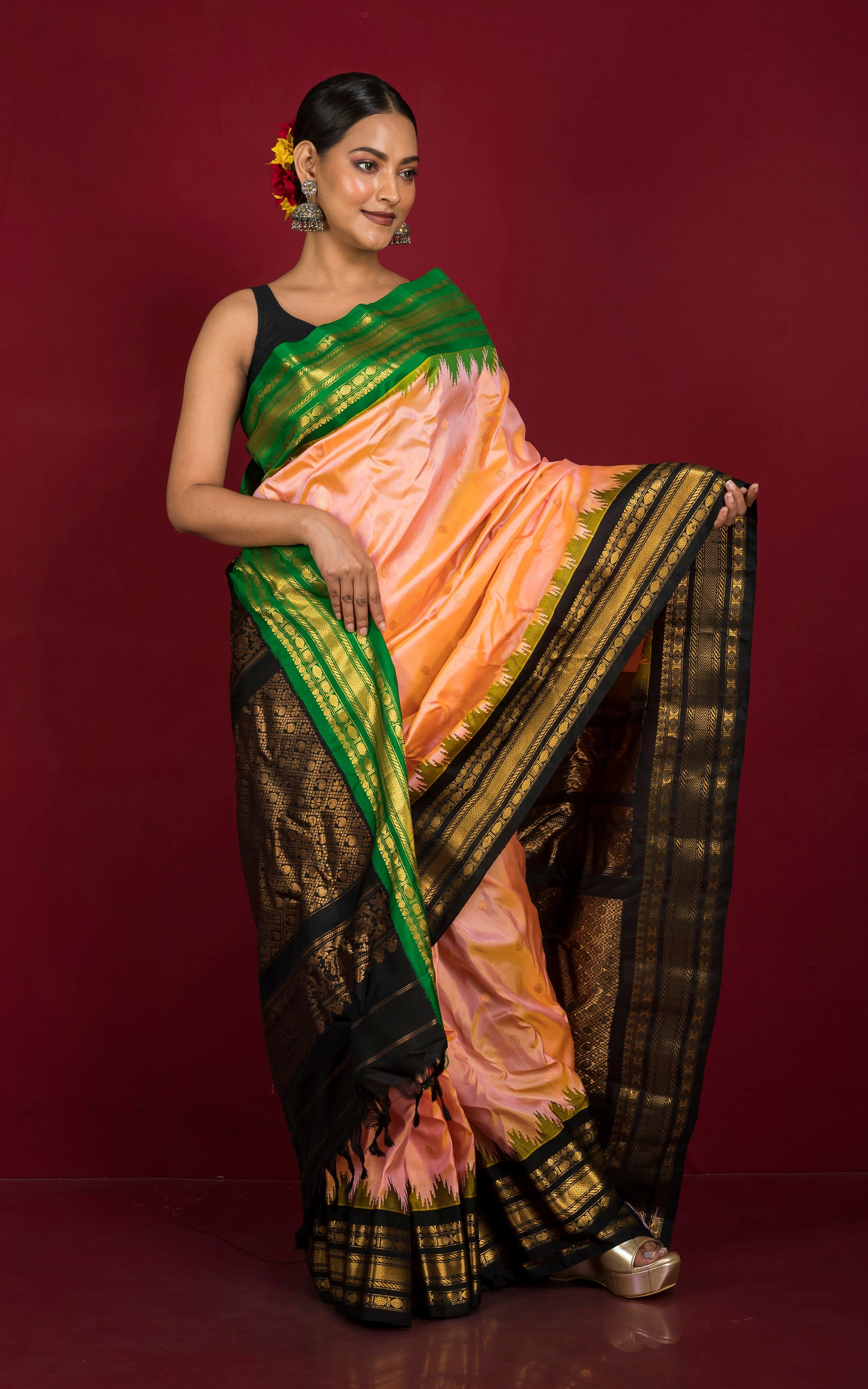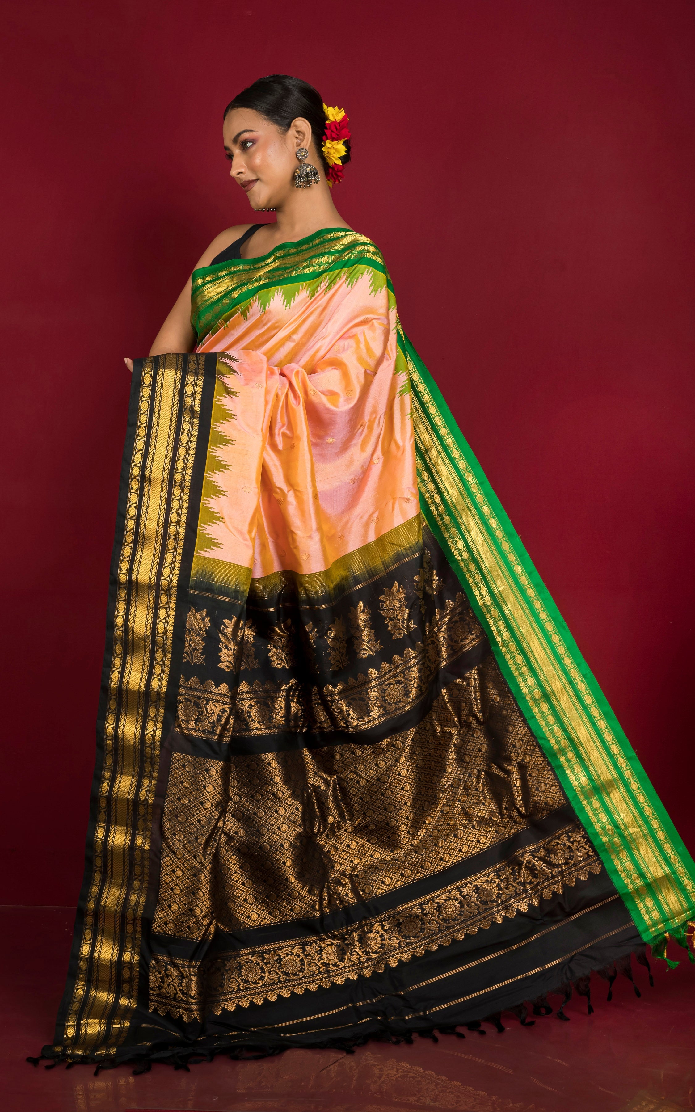 Handwoven Exclusive Gadwal Silk Saree in Peach, Bright Green, Black and Golden Zari Work