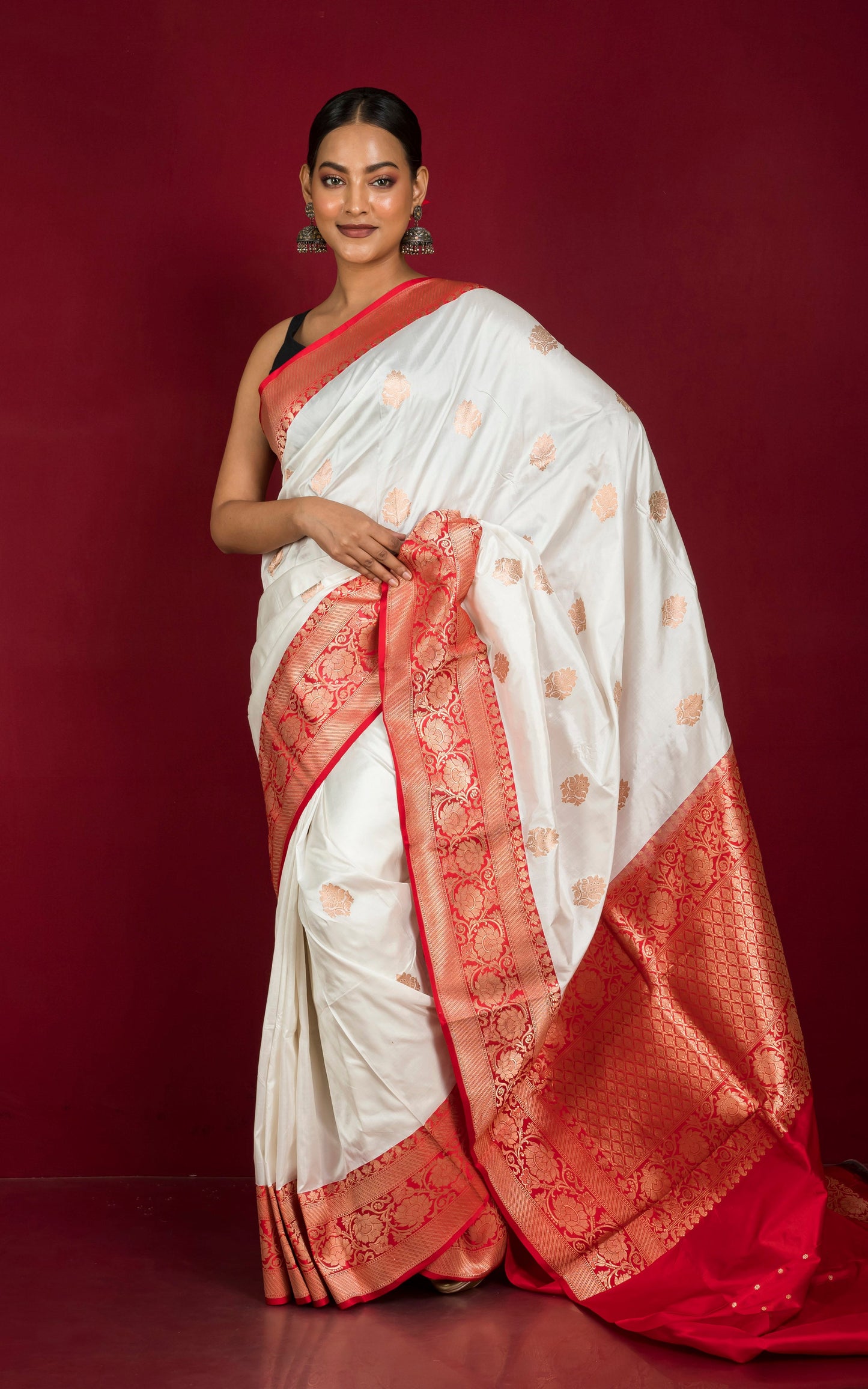 Handwoven Pure Katan Banarasi Silk Saree in White, Red and Antique Gold
