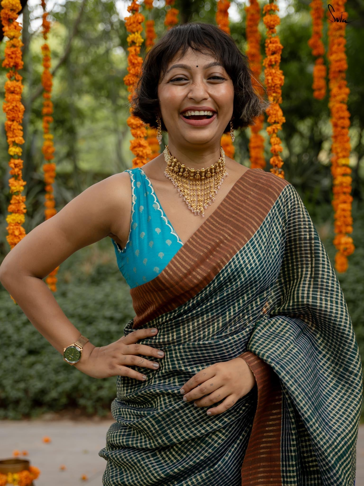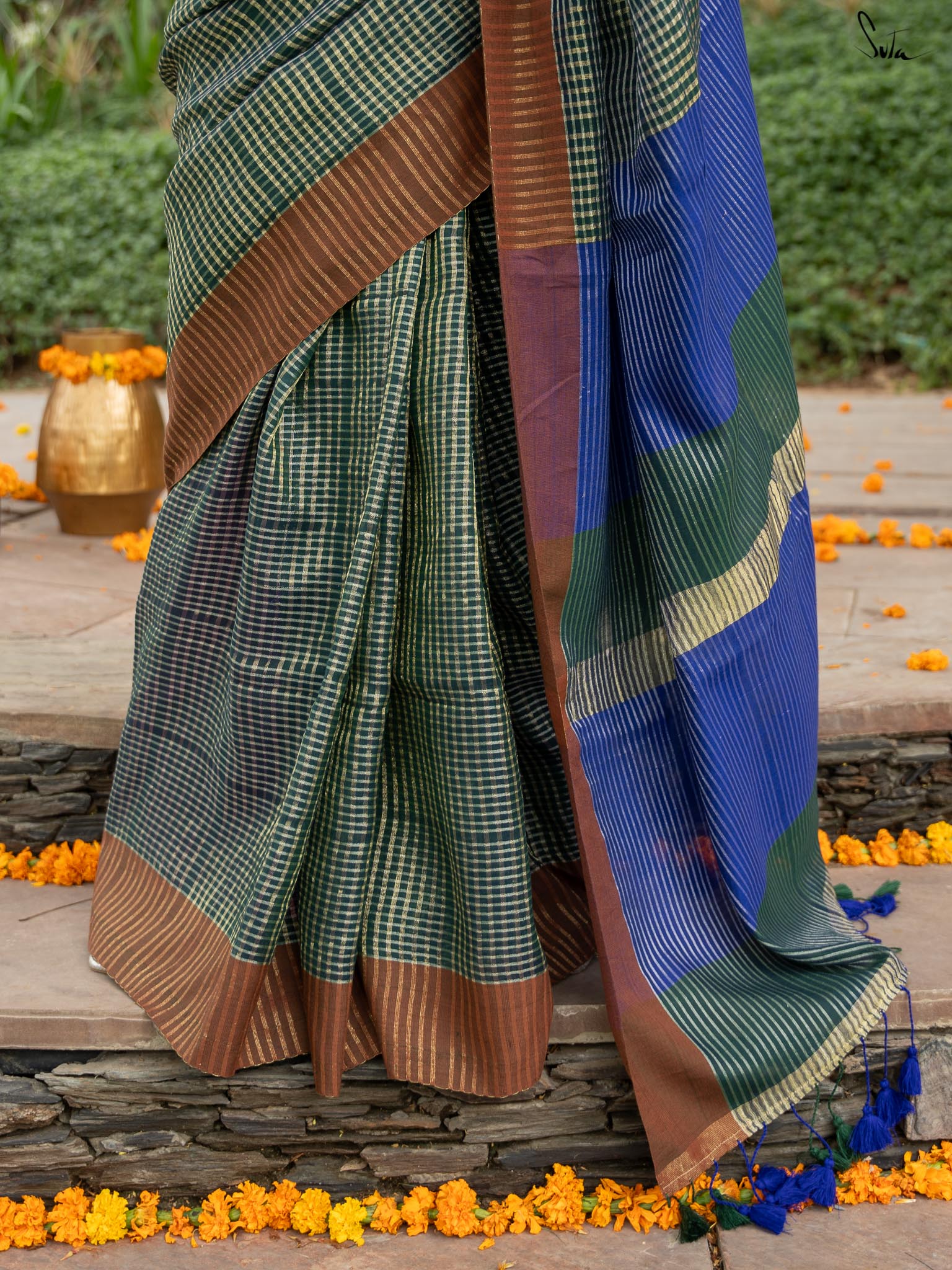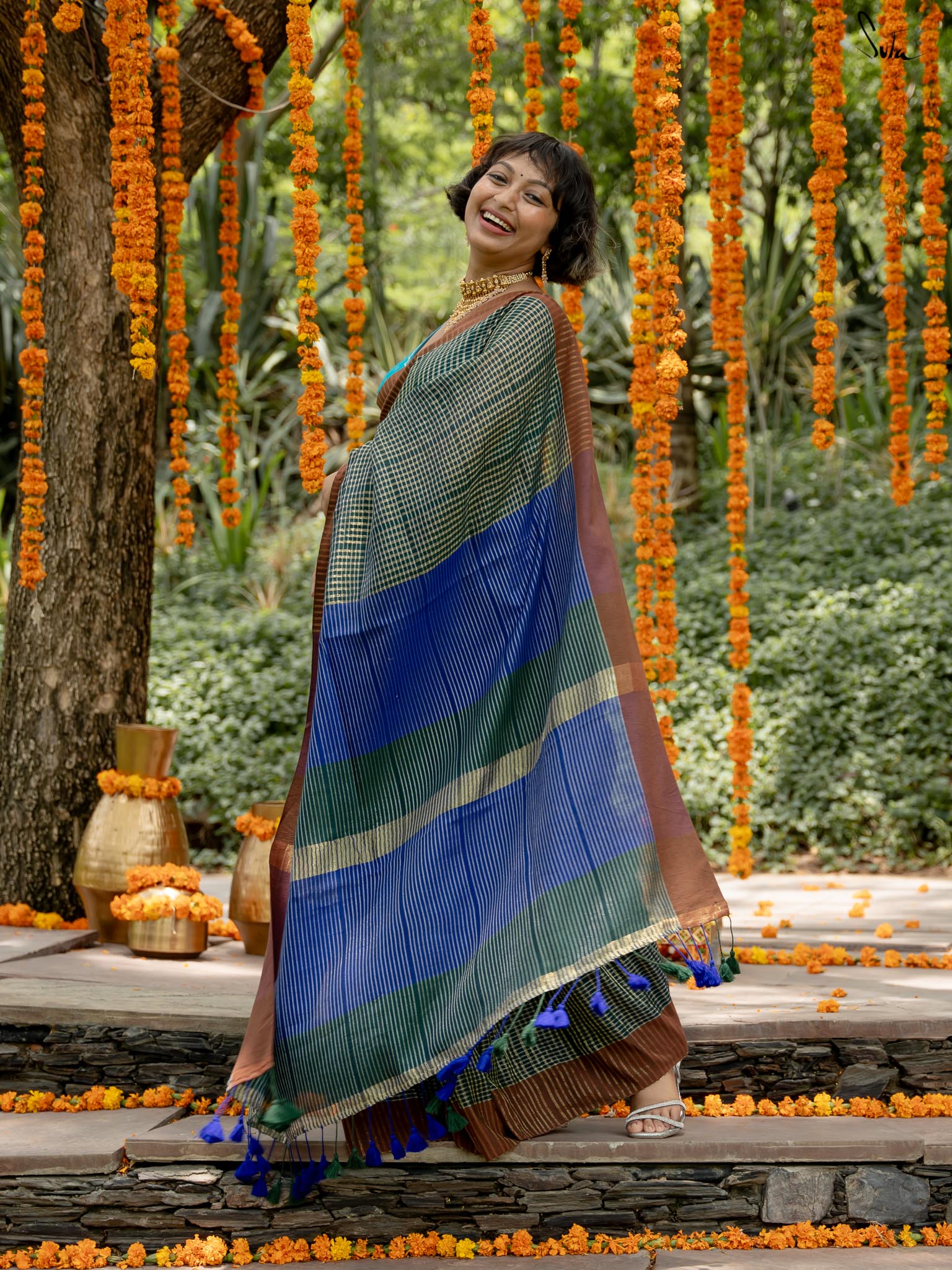 Made up of rich acrylic cotton zari, the 'Hara Asman' saree is a visual beauty! Featuring an intriguing green base with contrasting border and pallu, it has zari lines running through the warp and weft of the saree, adding a sophisticated charm to the ensemble. Drape it up with the 'Subha-E-Varanasi' blouse from Suta for a complete look.
