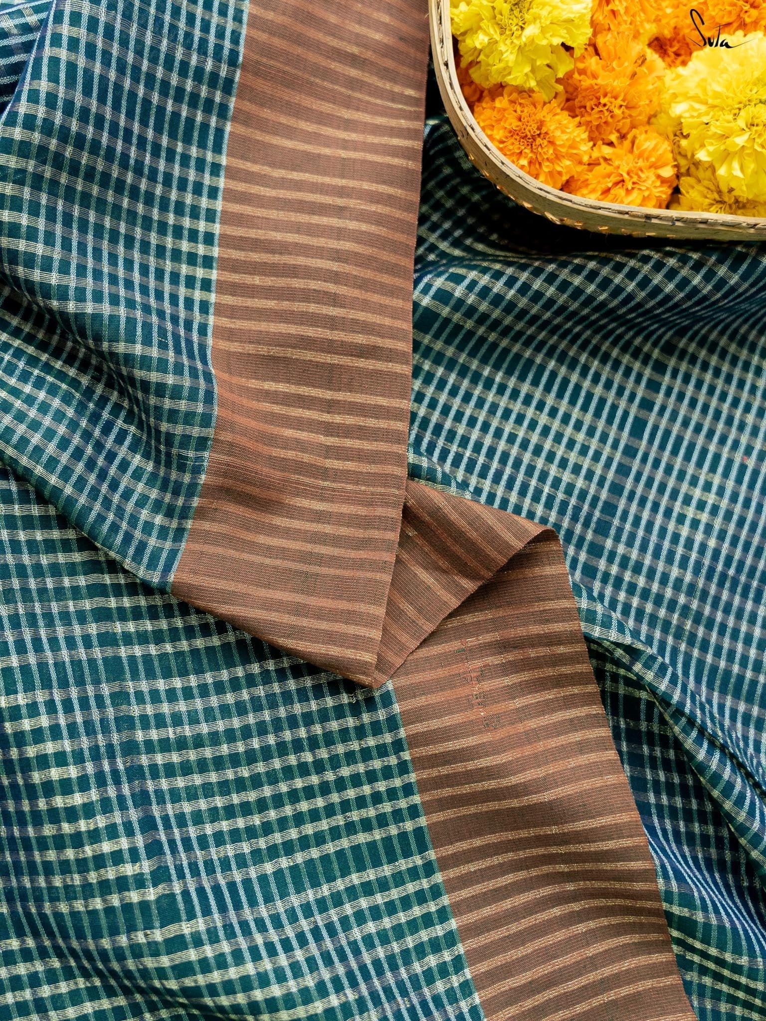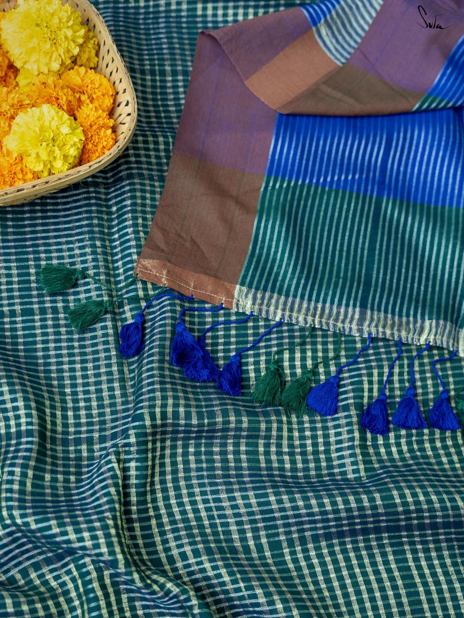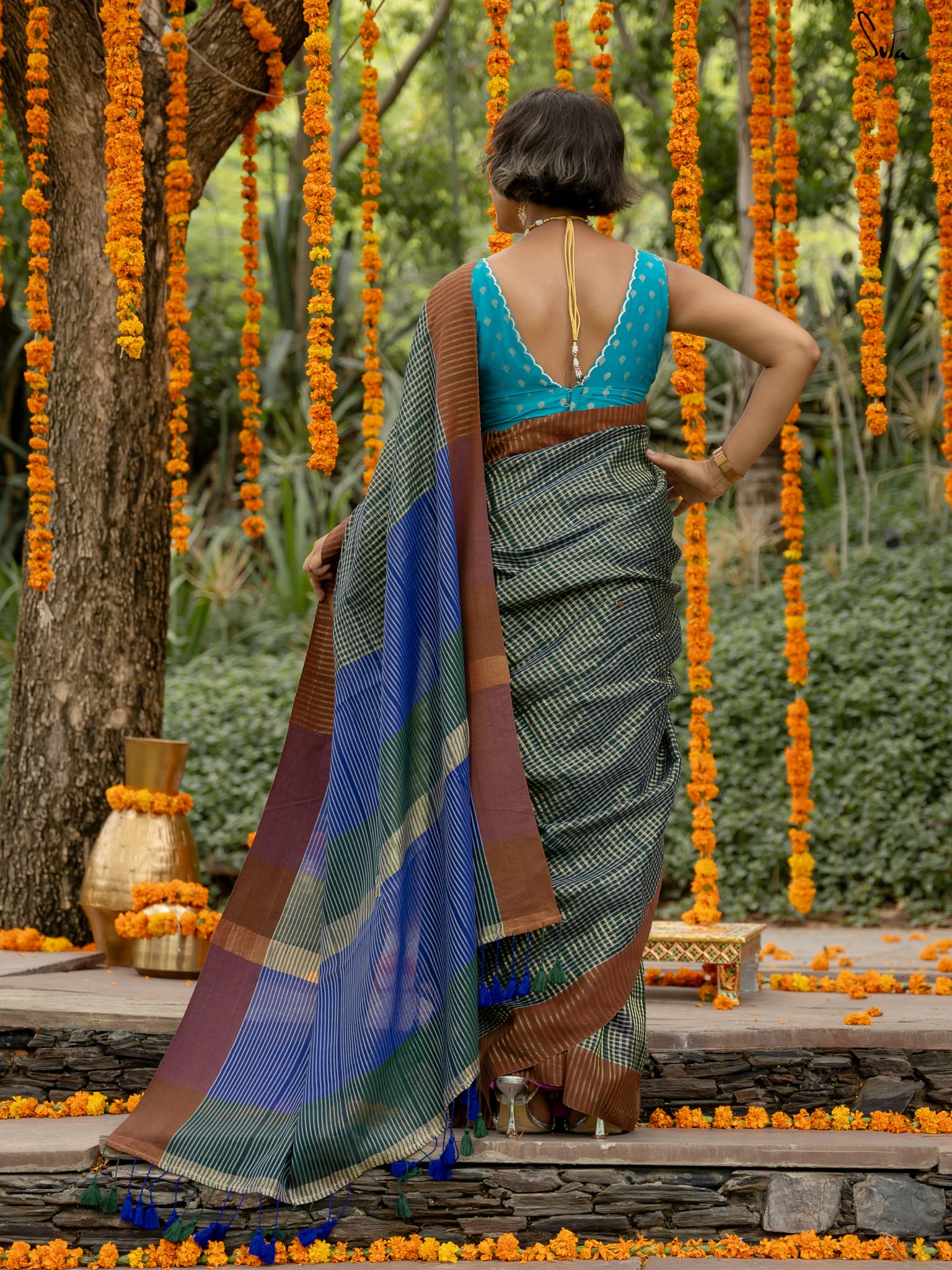 Made up of rich acrylic cotton zari, the 'Hara Asman' saree is a visual beauty! Featuring an intriguing green base with contrasting border and pallu, it has zari lines running through the warp and weft of the saree, adding a sophisticated charm to the ensemble. Drape it up with the 'Subha-E-Varanasi' blouse from Suta for a complete look.