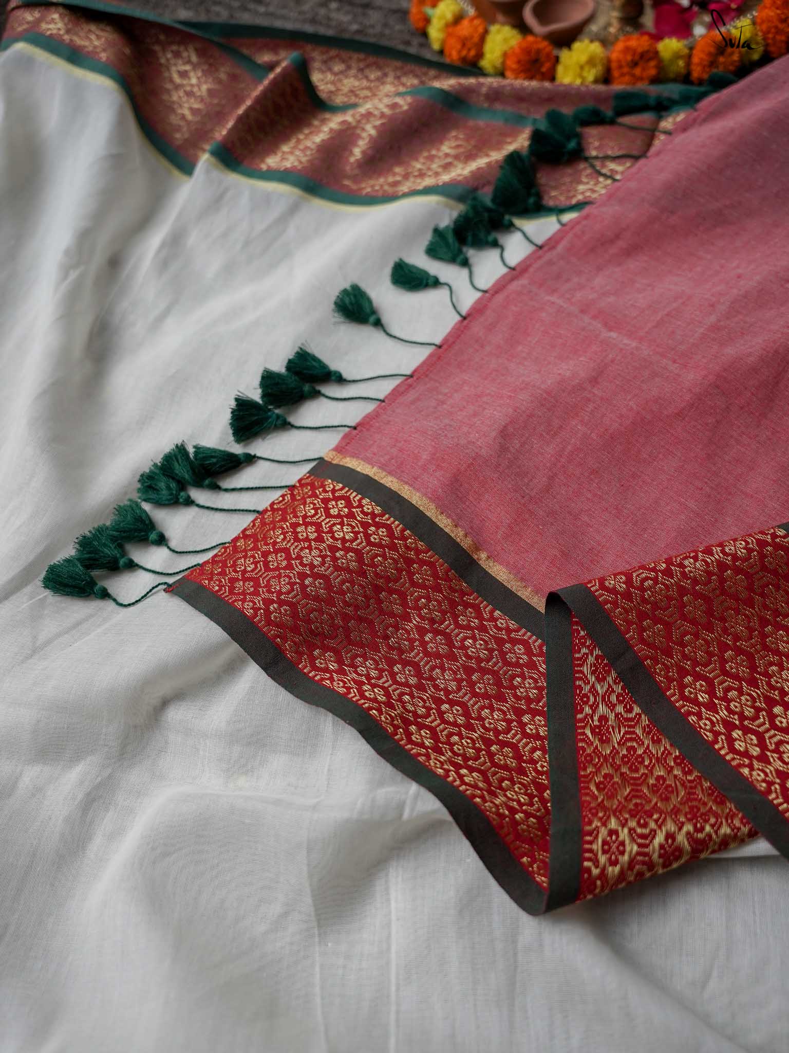 Imagine yourself in this beautiful Hariyali Banno Suta saree, featuring a rich white color crafted from soft cotton-acrylic fabric. Ideal for special occasions, this saree blends elegance with comfort. It has a green and pale red border with detailed zari work and a pale red pallu. This saree is a perfect choice to embrace the festive spirit.