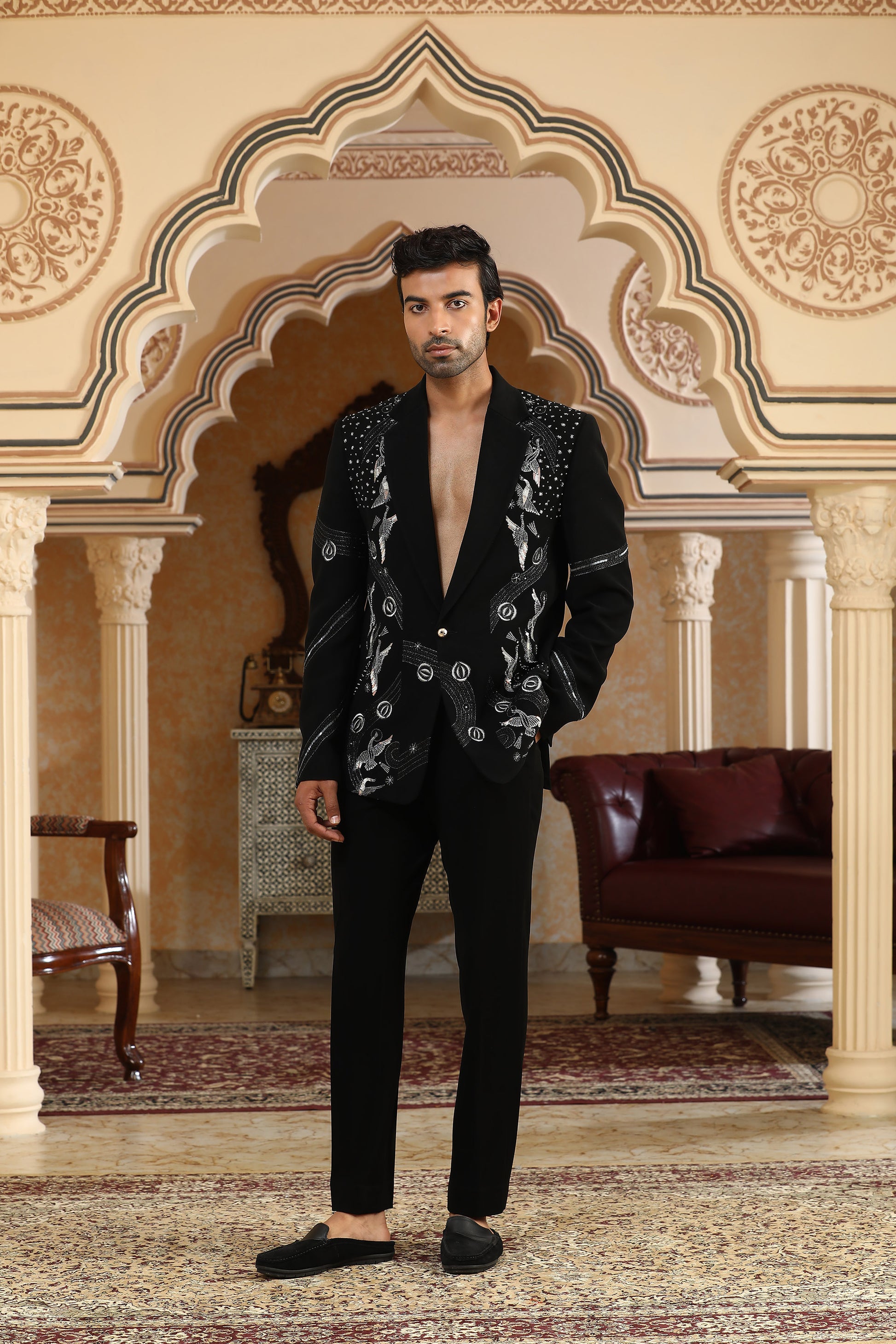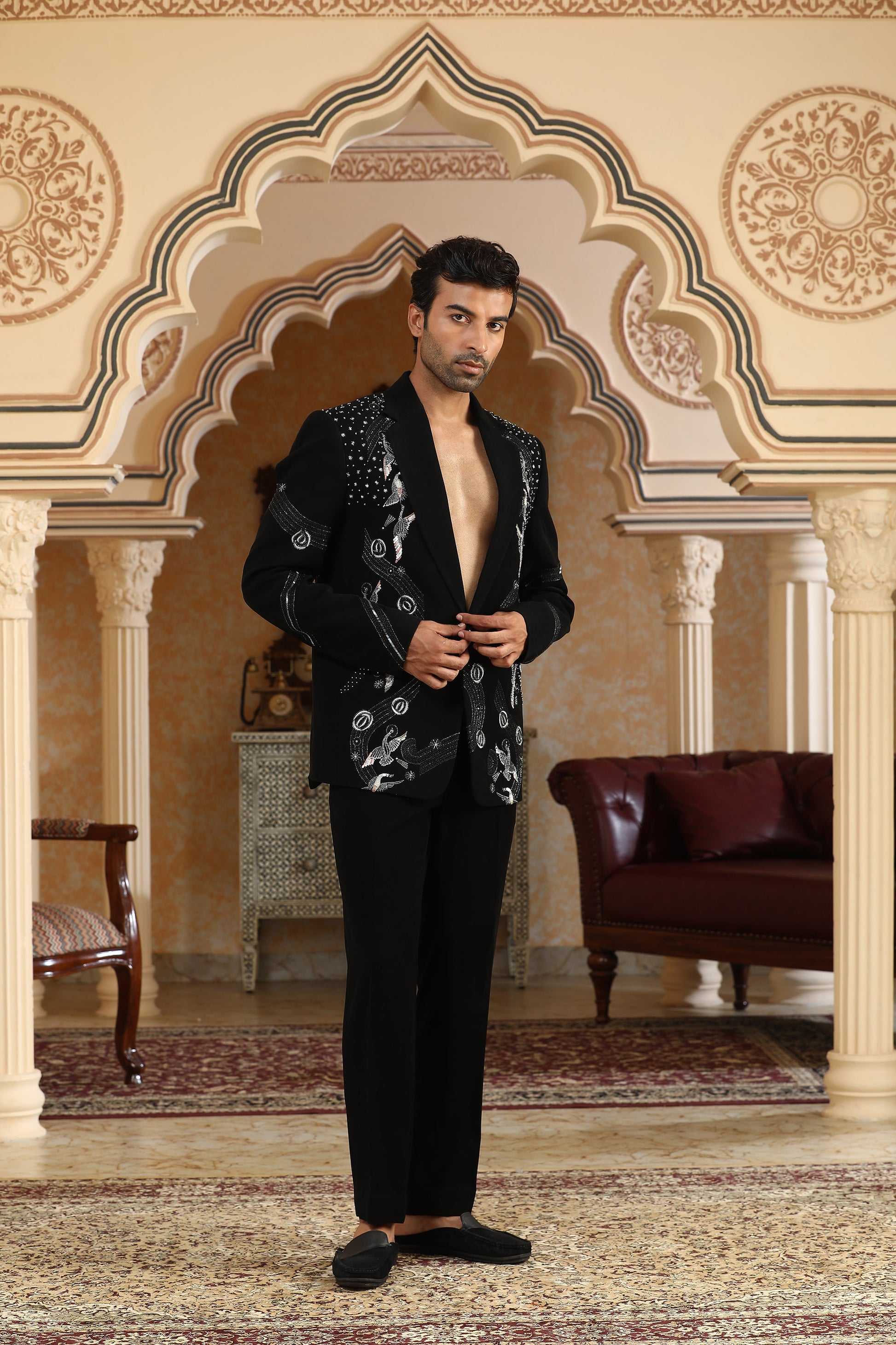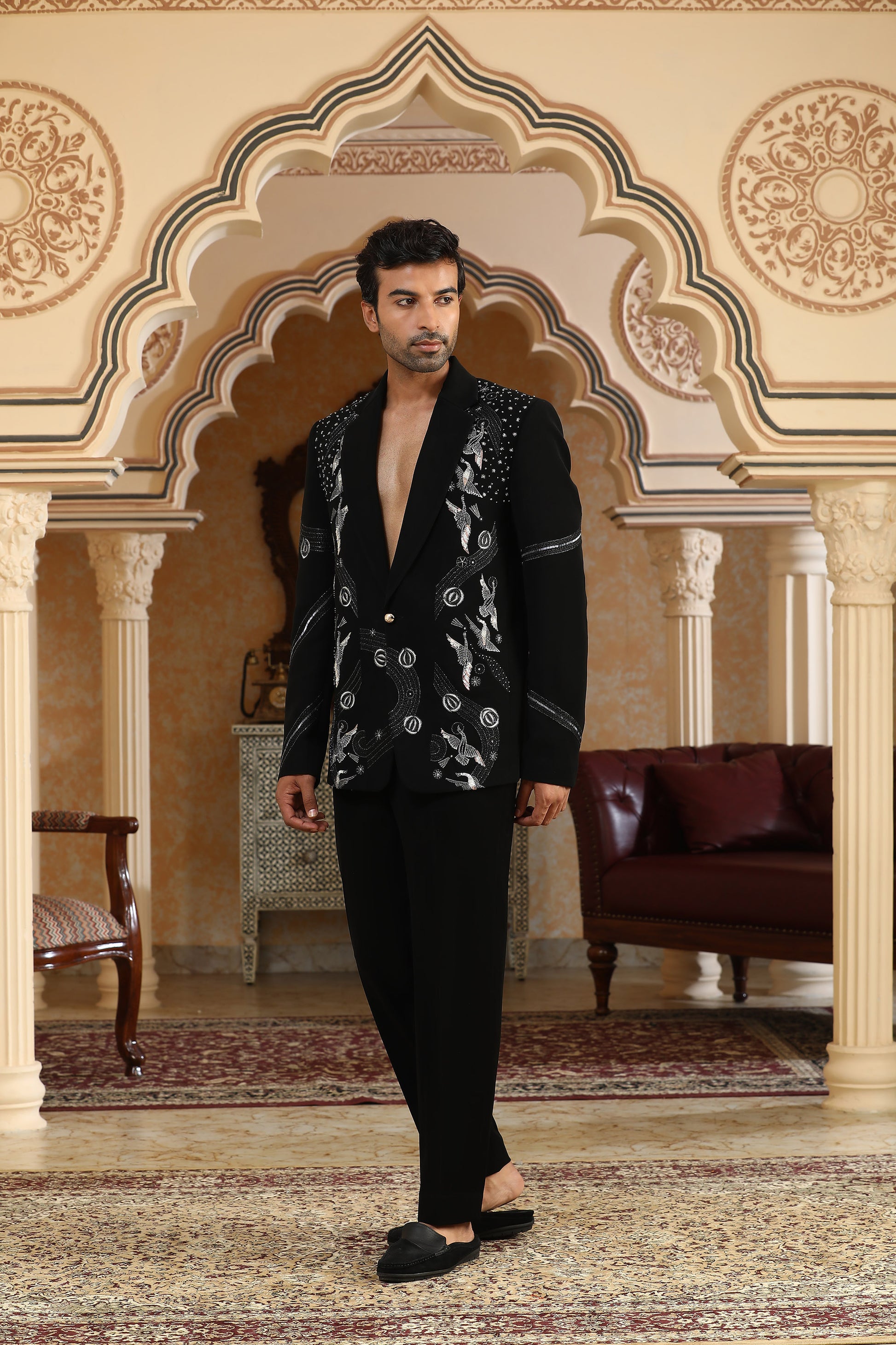 A celestial masterpiece in black Italian viscose, the Heaven suit set brings together the shimmer of sequins, cutdana, pearl motis, crystals, zari, and zardozi to create an ensemble that feels like stardust woven into fabric. The coat is intricately hand-embroidered in tonal layers, giving it a luxurious, luminous finish perfect for celebratory evenings. Paired with matching black trousers, this set is designed for those who want to command attention with quiet elegance and refined drama.