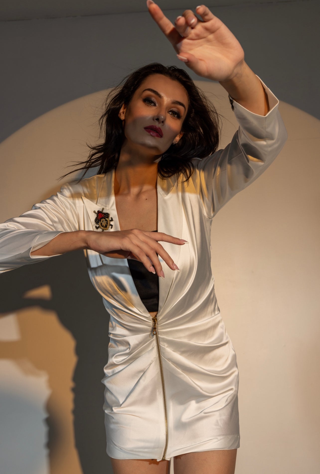 DETAIL- White colour front zipper blazer dress with hand embroidered flies and shoulder pad and metallic zipper.