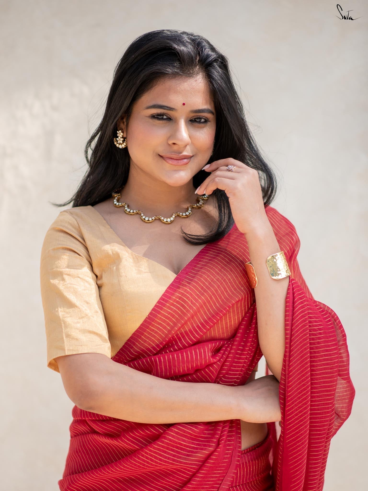 Hottest Sitara, crafted from maroon mul cotton, is designed for those who want to make a bold statement. Zari stripes add a mysterious allure, while maroon tassels and a stylish pocket complete the look. With adjustable loops, and attached lining this saree promises effortless elegance and a perfect drape in just 30 seconds.