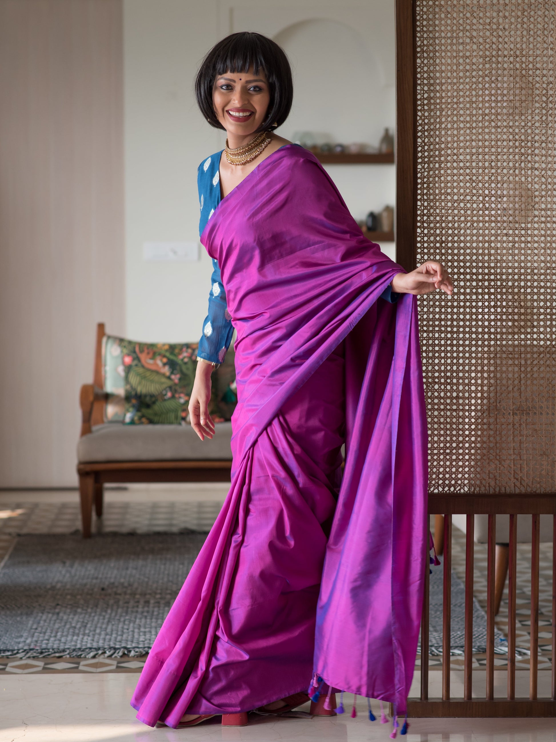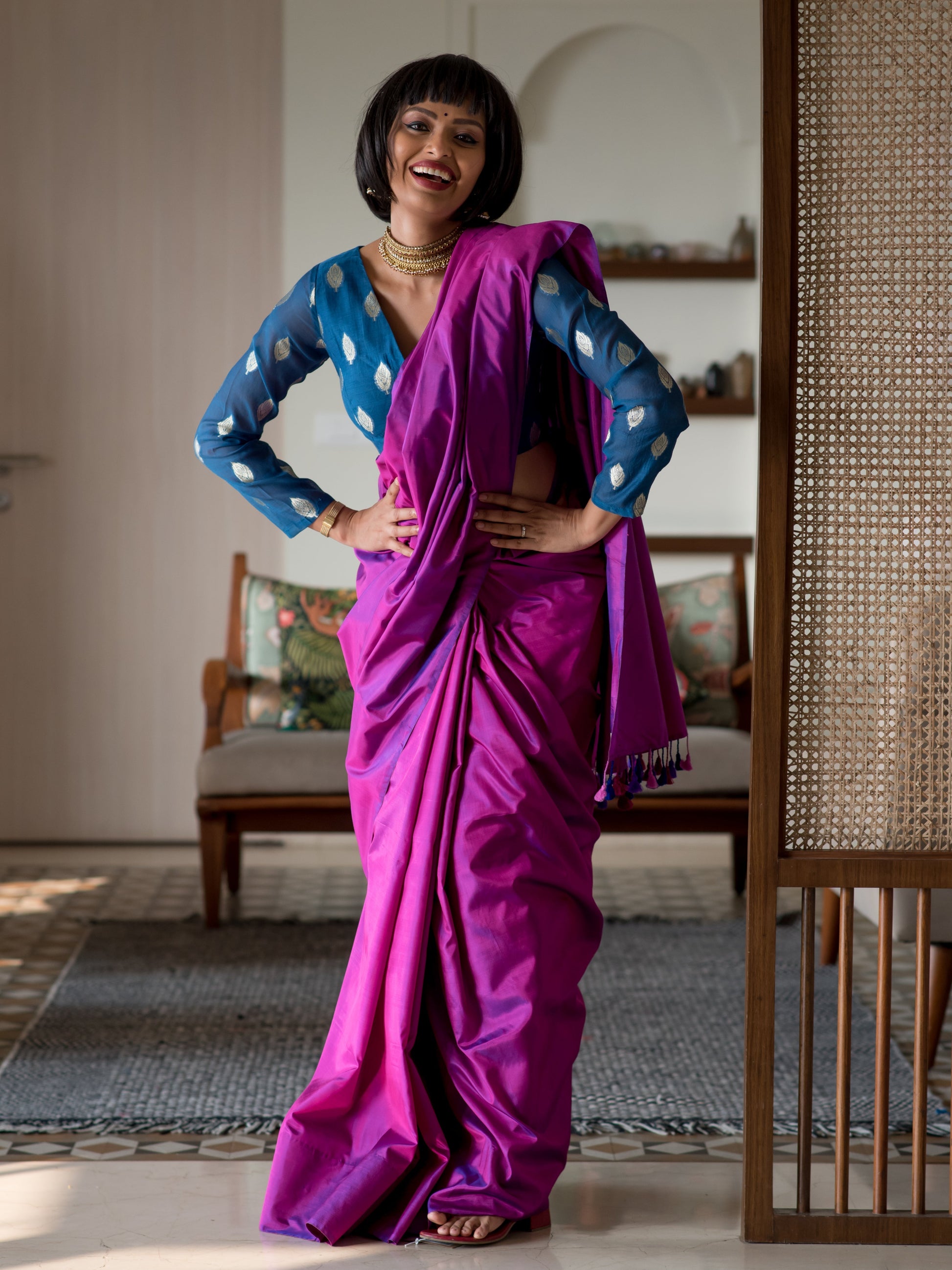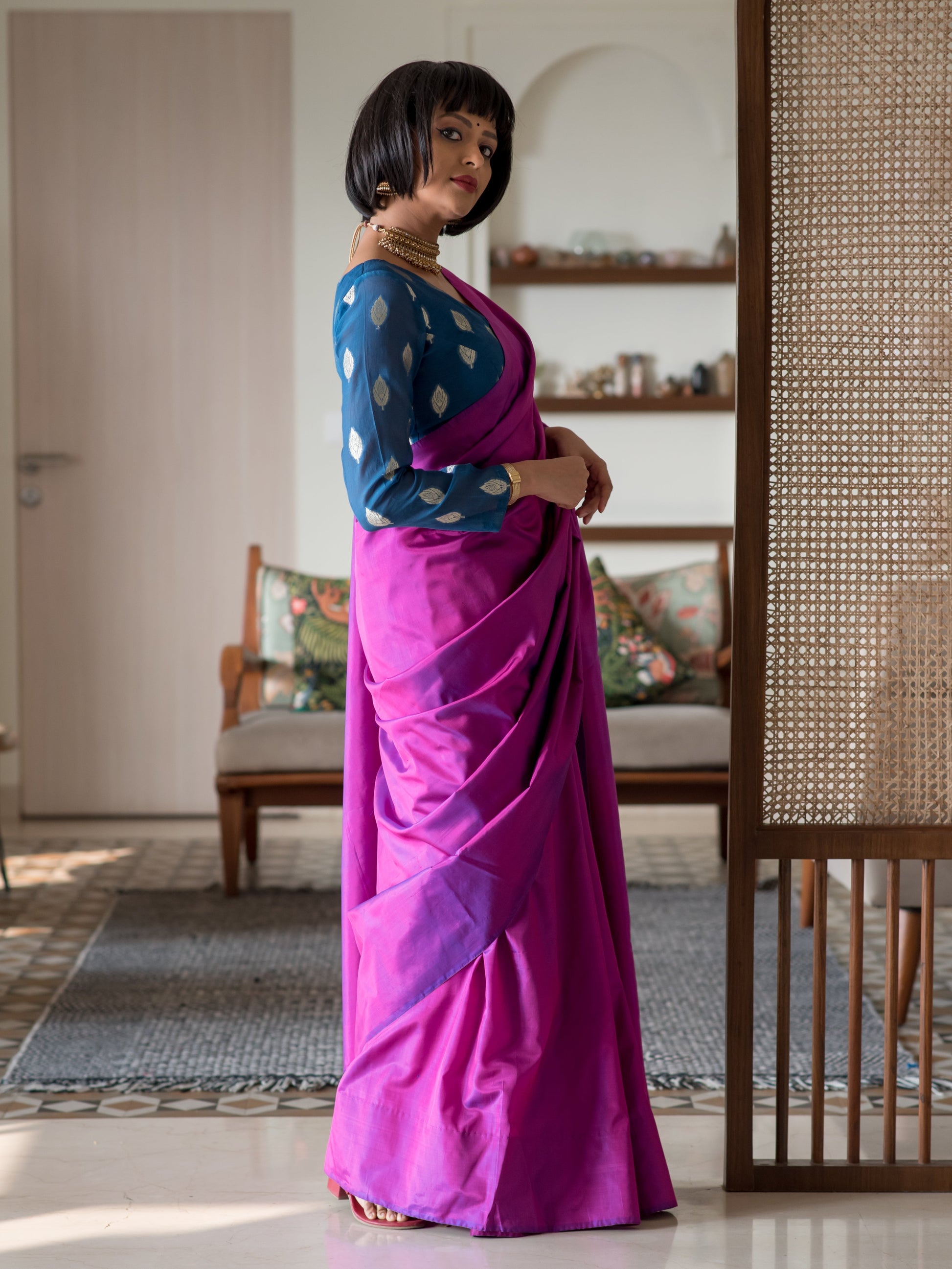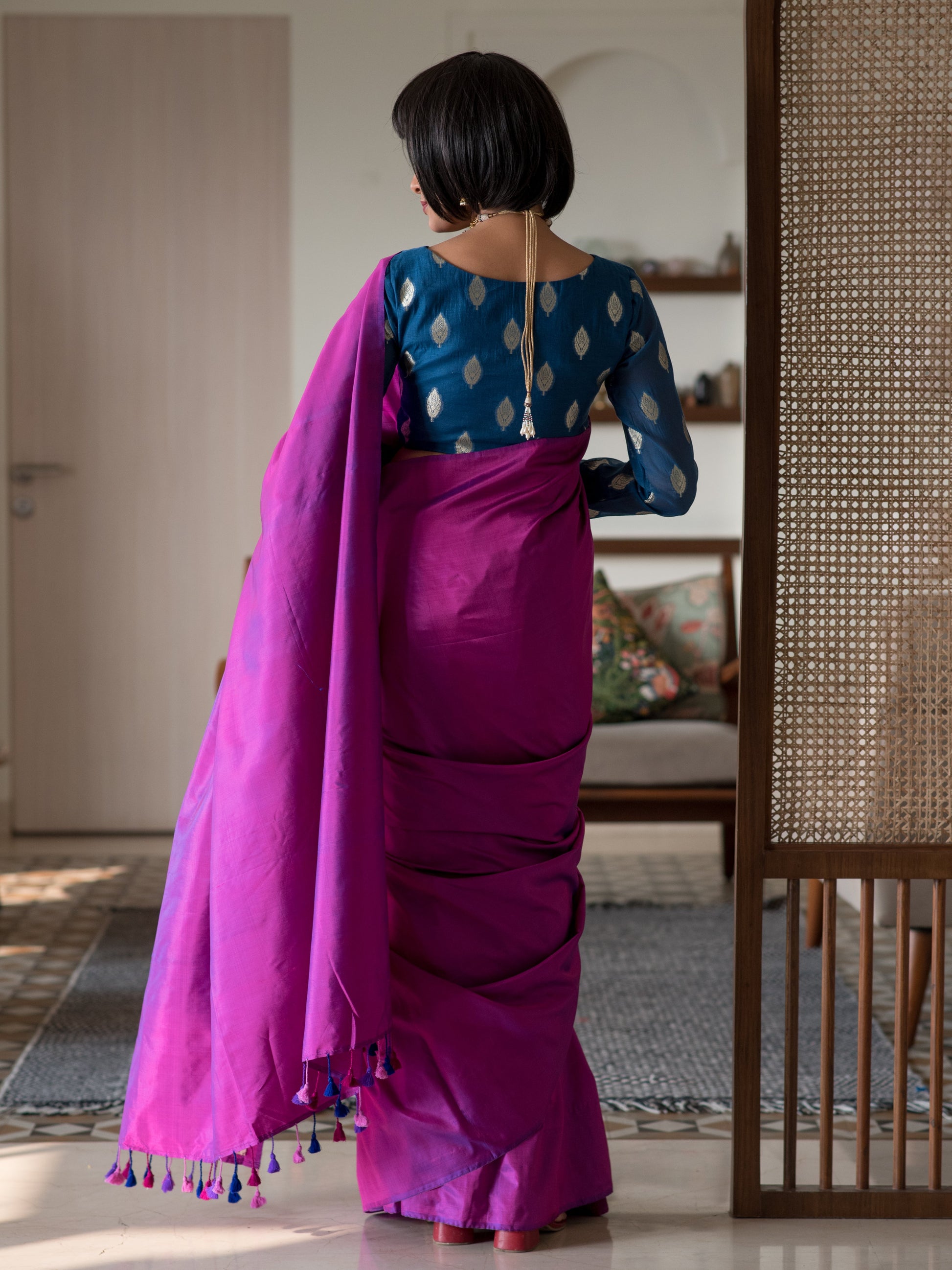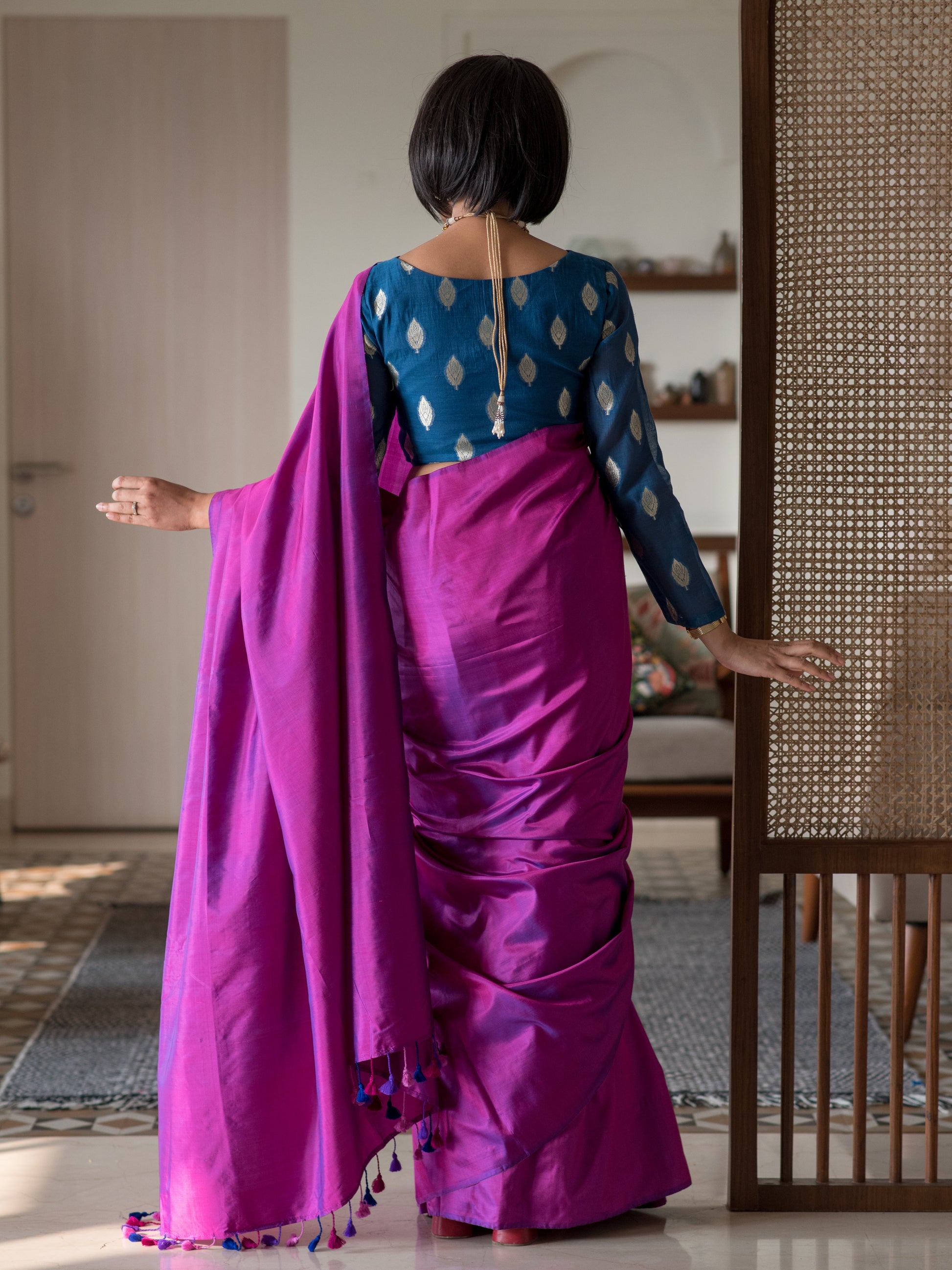 This saree is made of a gorgeous hand-woven silk fabric. Silk is a natural animal-based fiber that has centuries of history. It has always been considered the most regal of fabrics and remains the most festive, alluring fabric in the modern wardrobe as well. The fine weave of this fabric from the weaving communities of West Bengal makes it very malleable, soft, light-weight and a dream to drape. Over 40 artisans and weavers have worked to craft this collection of handloom sarees and the weavers create magic on their looms, as they take 20 days and sometimes 25 days to weave one single saree, and pour their love into the fabric for it to take life in our wardrobe. And, when the fabric takes shape, the characteristic shine of the silk and the comfort of its texture inevitably become a combination that can win hearts over.