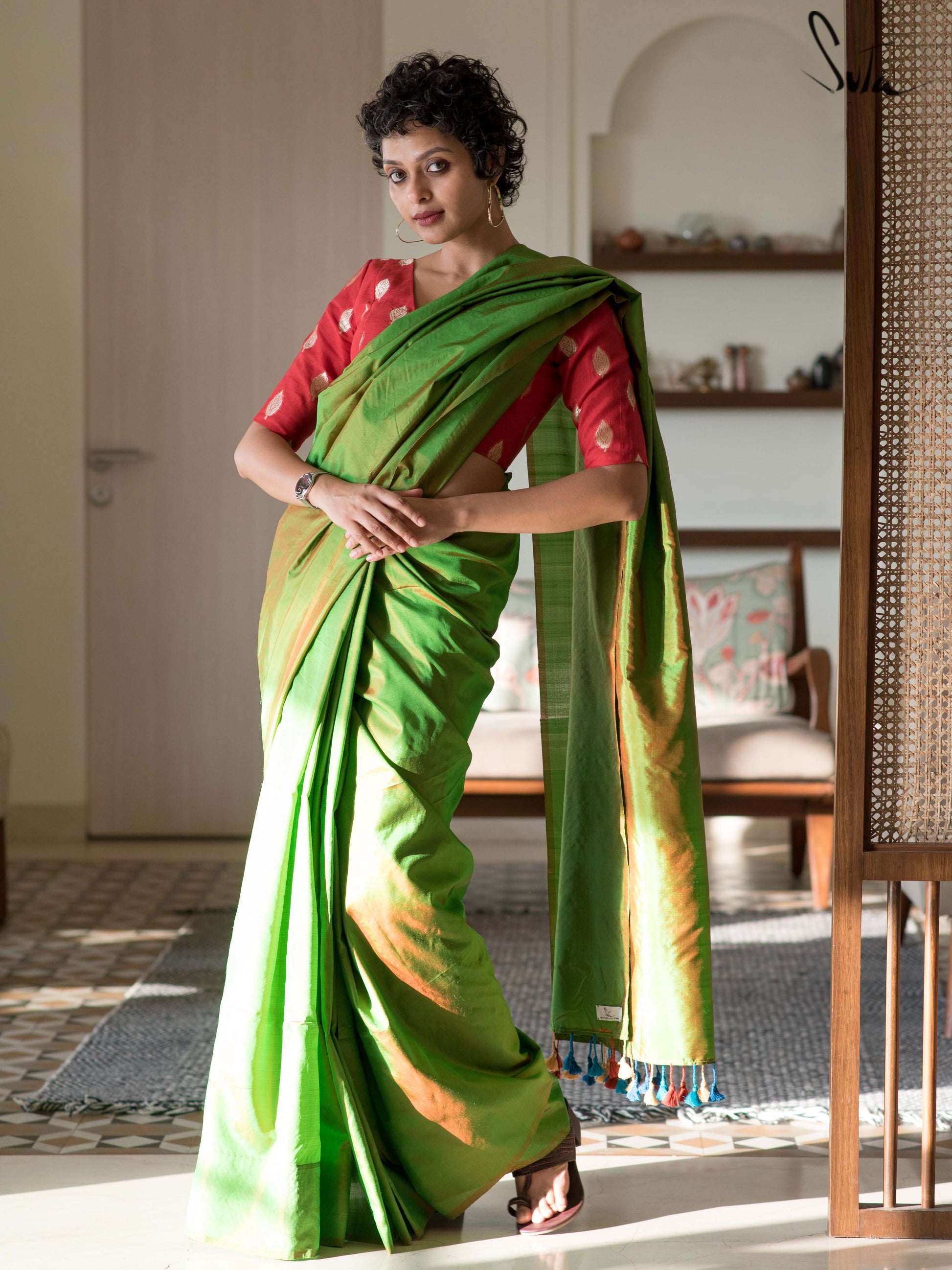 This saree is made of a gorgeous hand-woven silk fabric. Silk is a natural animal-based fiber that has centuries of history. It has always been considered the most regal of fabrics and remains the most festive, alluring fabric in the modern wardrobe as well. The fine weave of this fabric from the weaving communities of West Bengal makes it very malleable, soft, light-weight and a dream to drape. Over 40 artisans and weavers have worked to craft this collection of handloom sarees and the weavers create magic on their looms, as they take 20 days and sometimes 25 days to weave one single saree, and pour their love into the fabric for it to take life in our wardrobe. And, when the fabric takes shape, the characteristic shine of the silk and the comfort of its texture inevitably become a combination that can win hearts over.