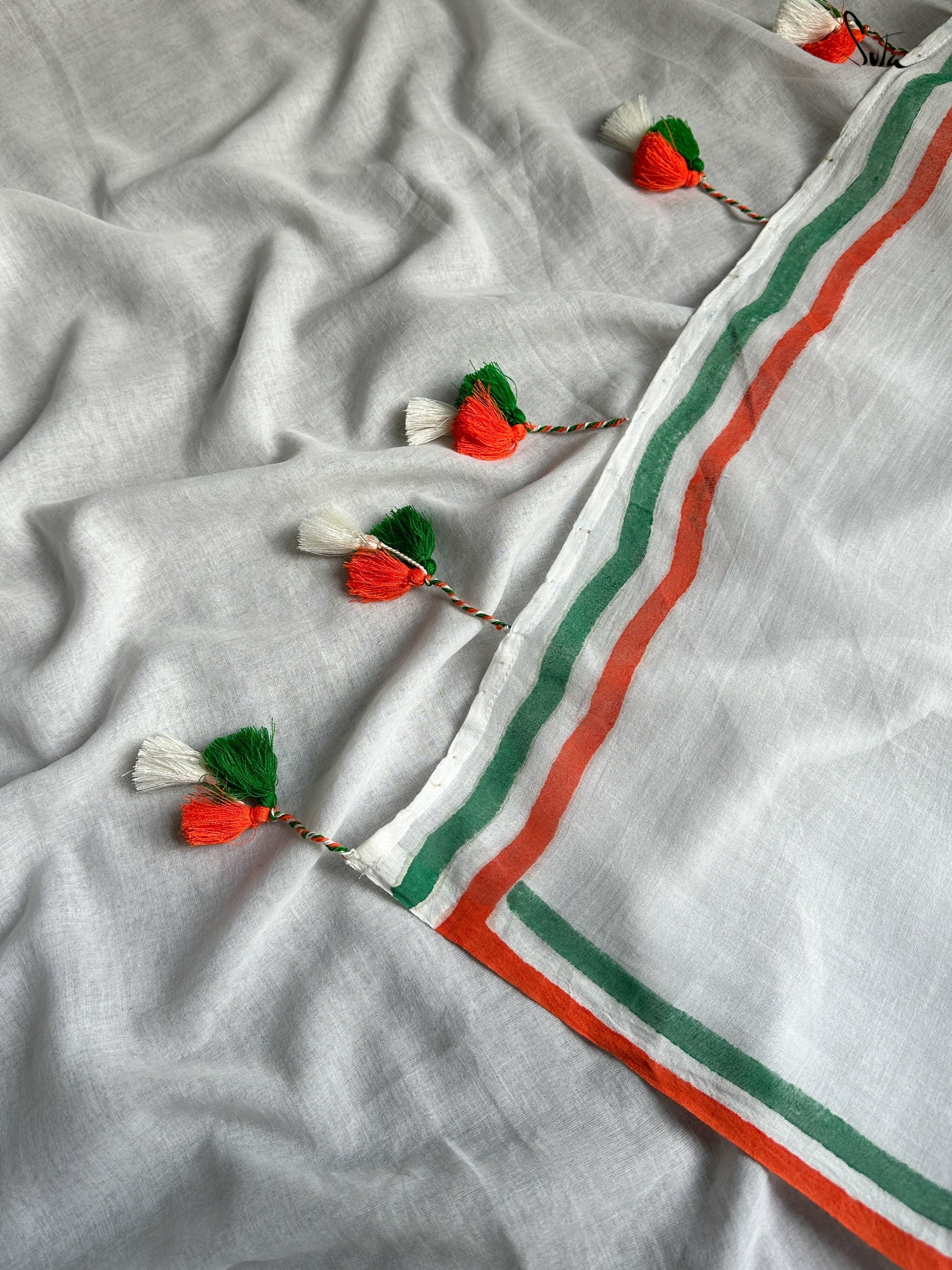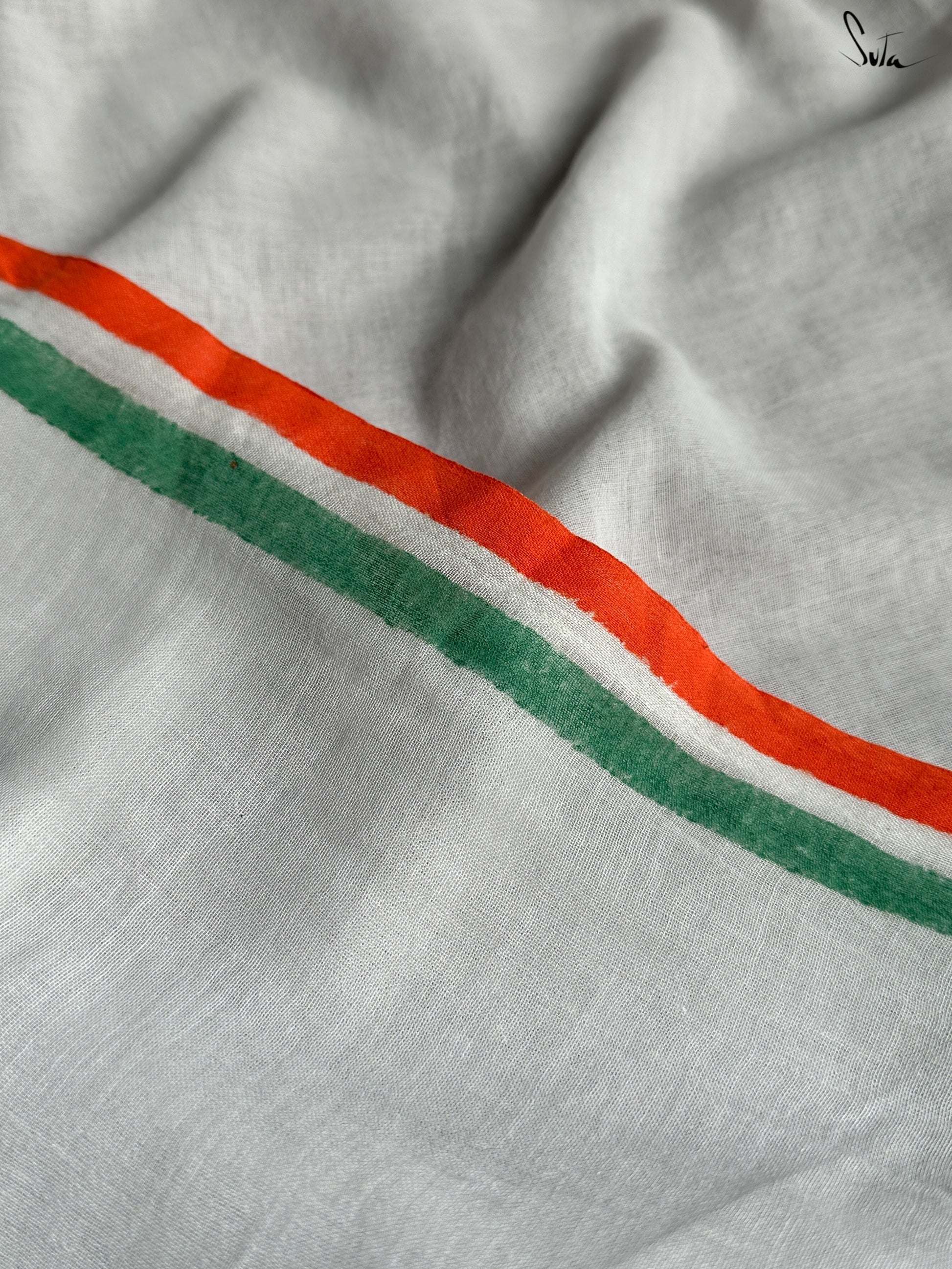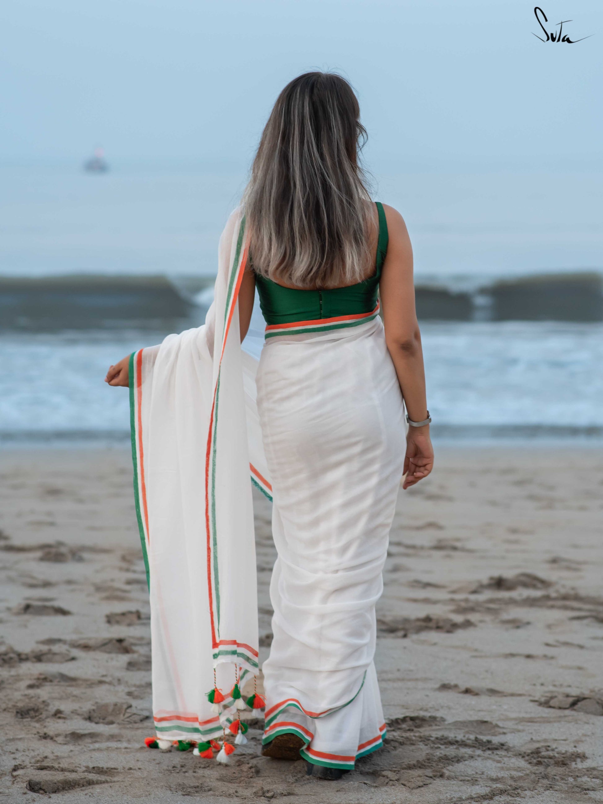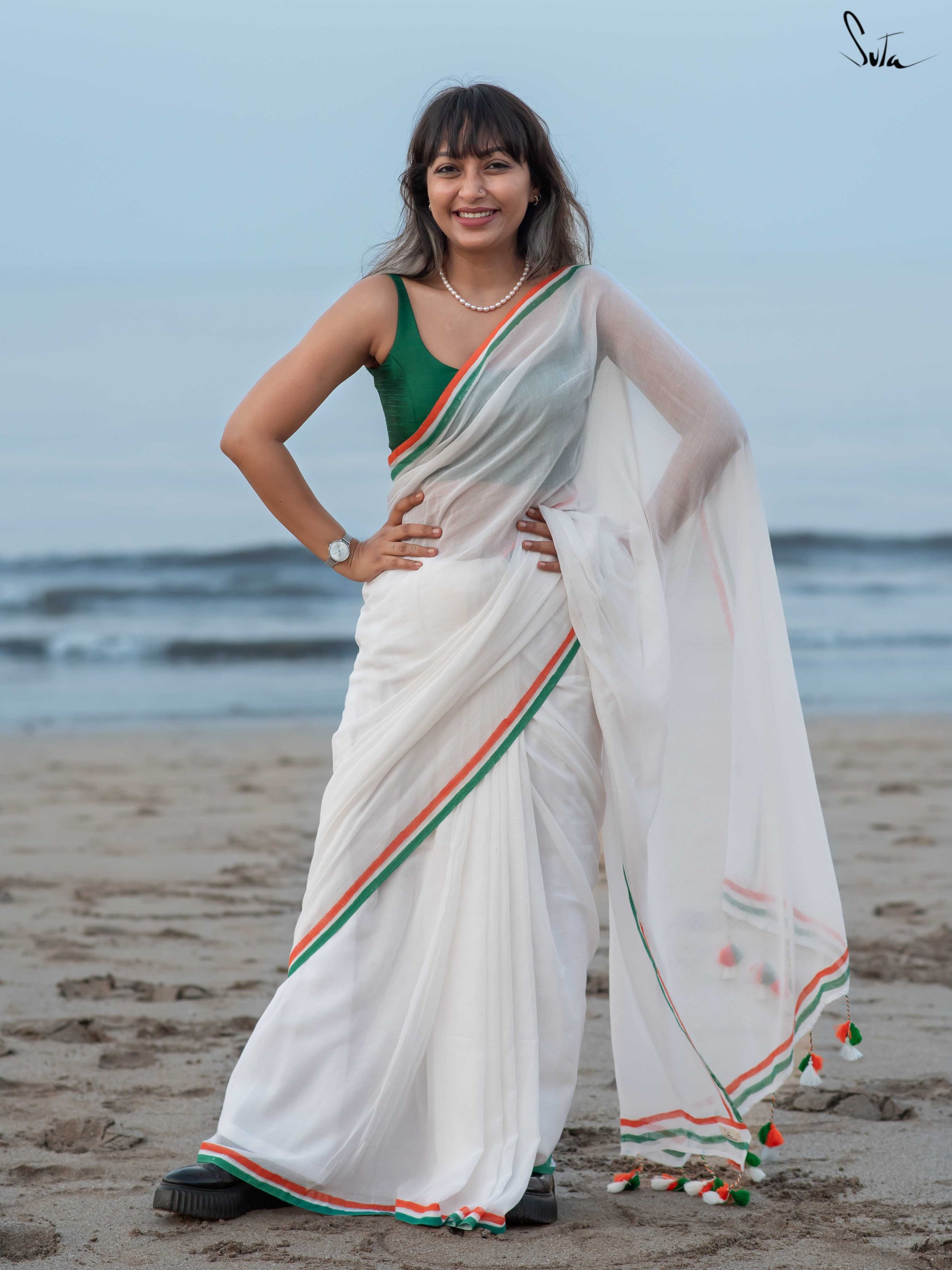 The accent colours used in this saree are inspired by the Indian tricolour.