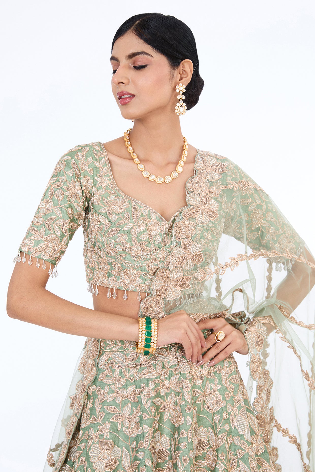 Featuring A Ice Blue Lehenga In Raw Silk Base With Hand Embroidery. It Is Paired With Embroidered Blouse And Net Dupatta. Accentuate With Statement Jewellery And Heels For A Complete Bridal Look.