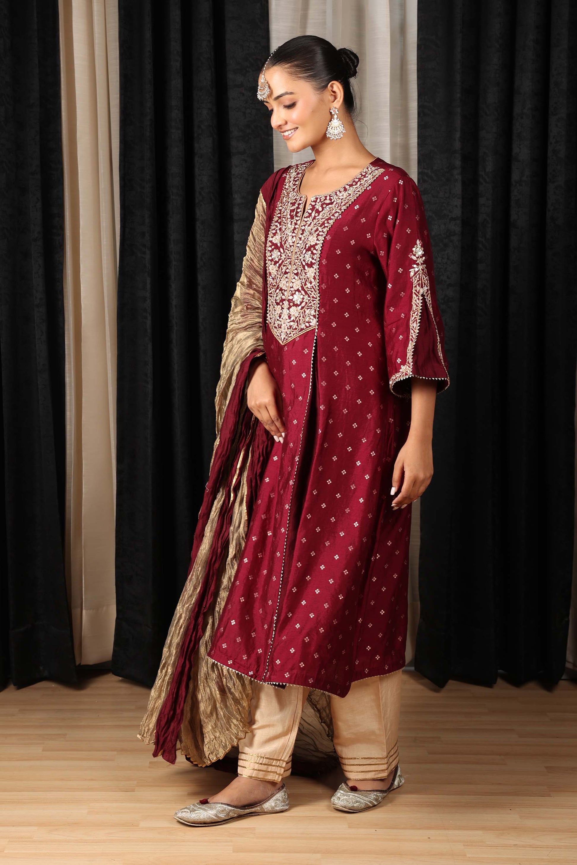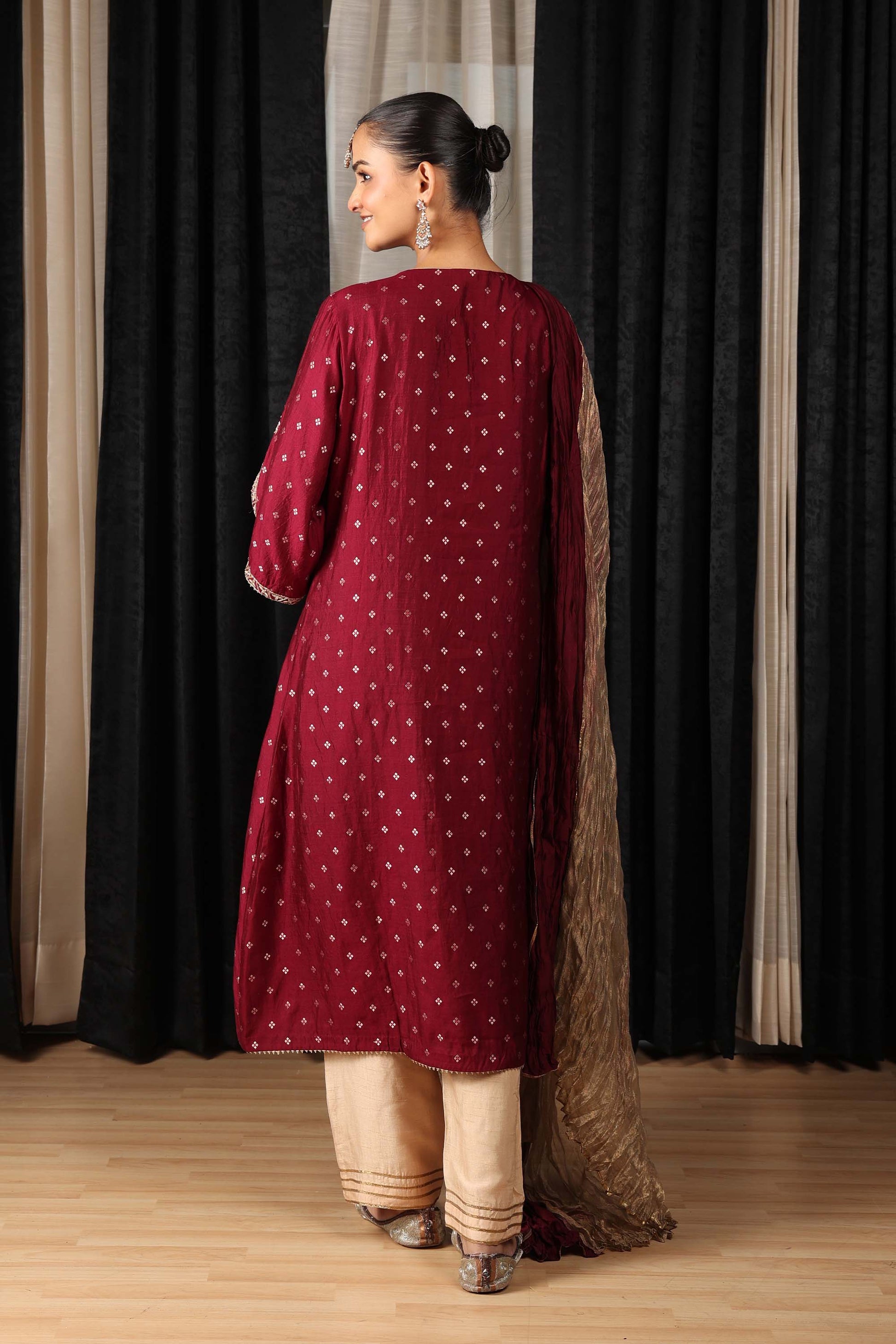 Indian Nomads HOS Maroon Chanderi Silk Embroidered Crushed tissue Kurta
