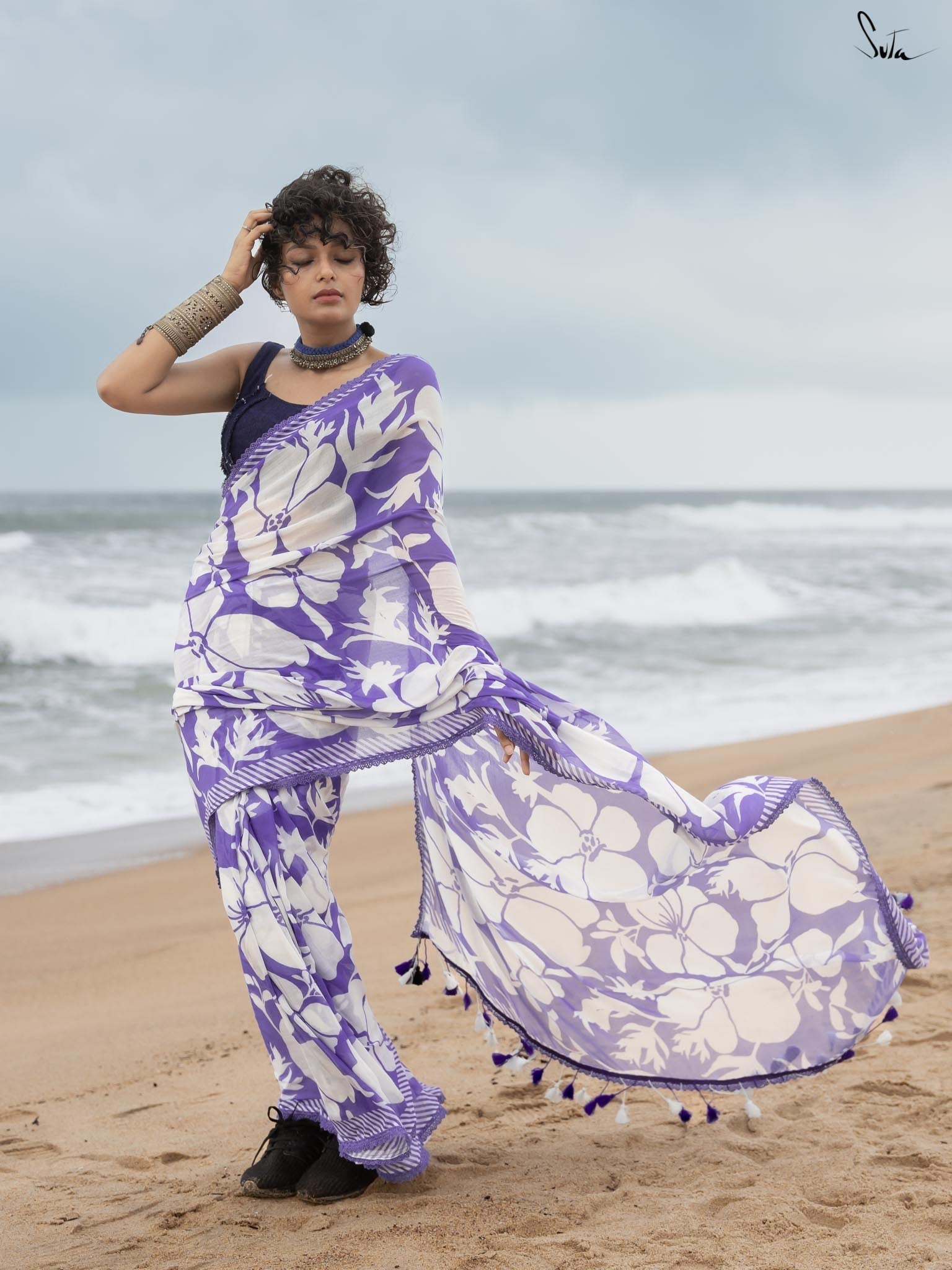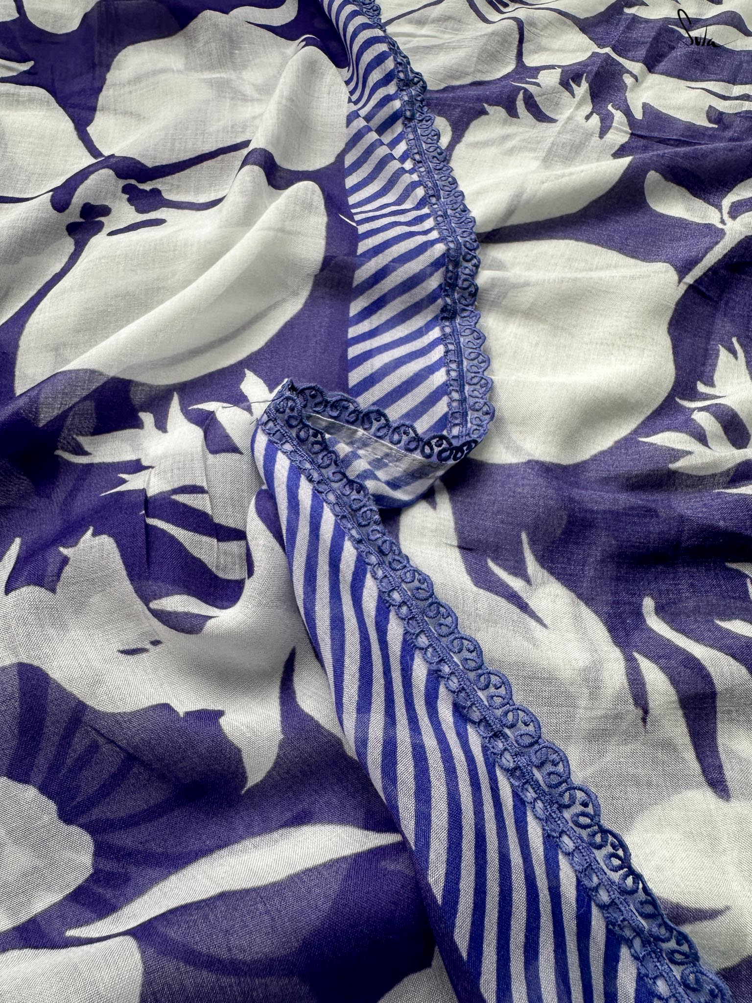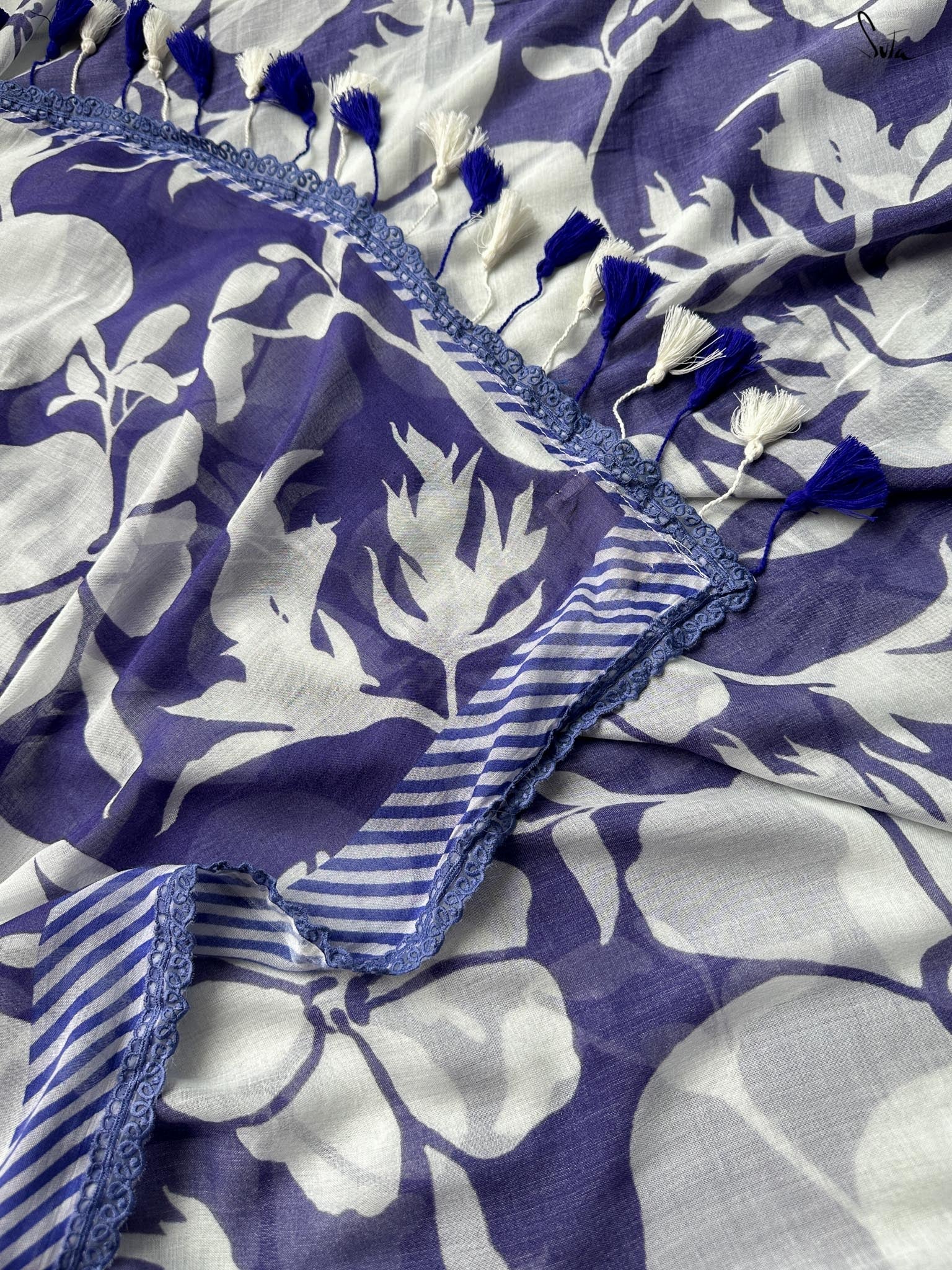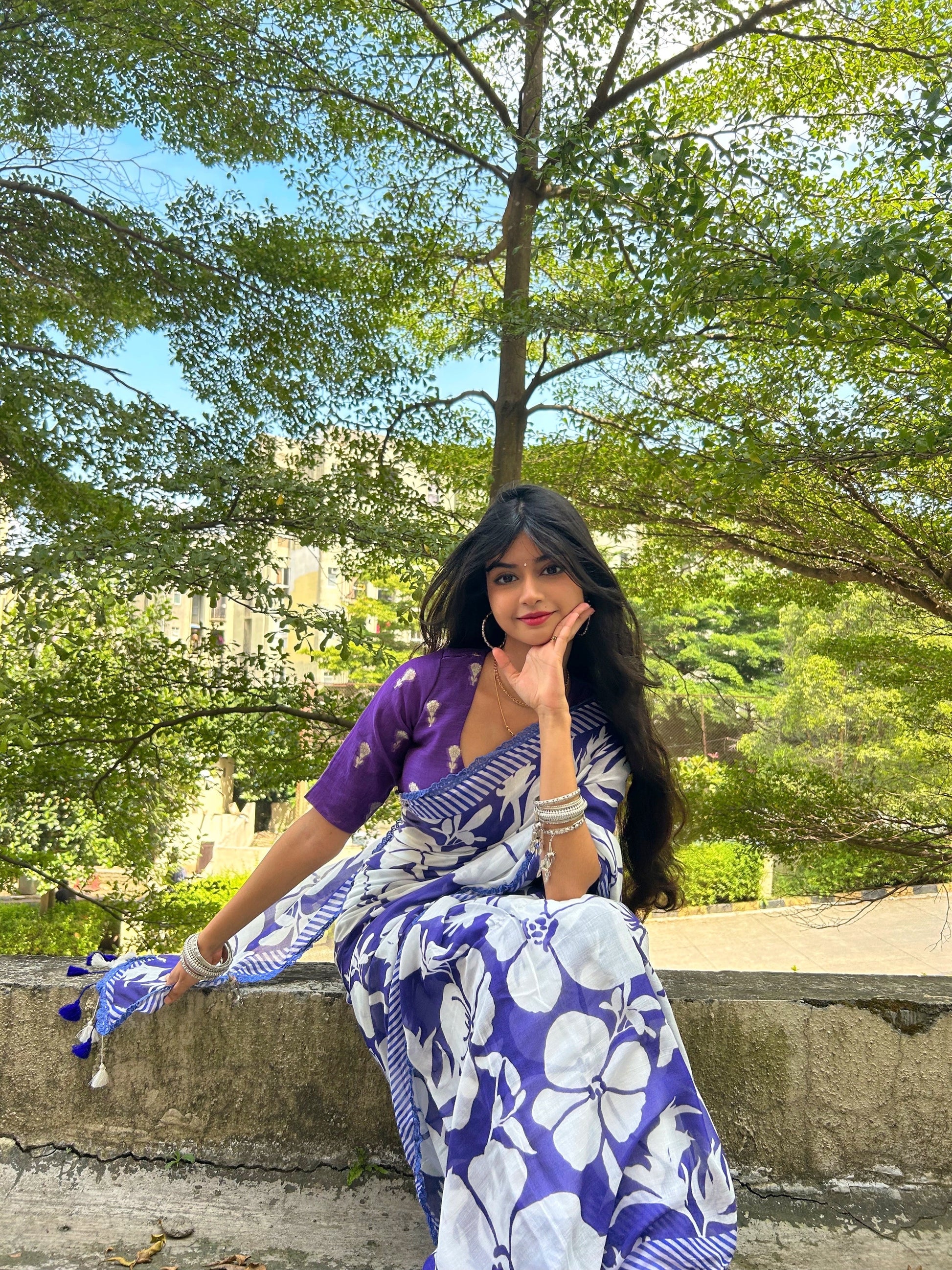 The Indigo Enchantress saree weaves a spell of perpetual visual treat. Crafted from luxuriously soft modal cotton, this white masterpiece features captivating Indian motifs and a contrasting border.